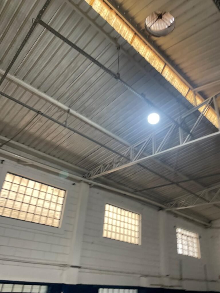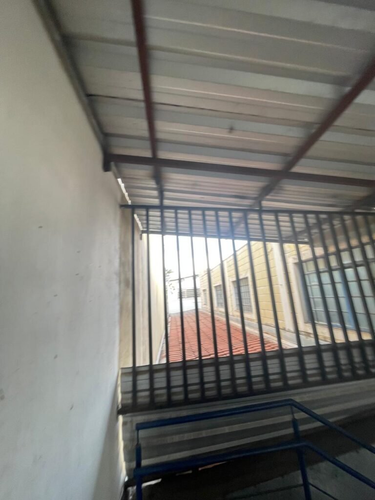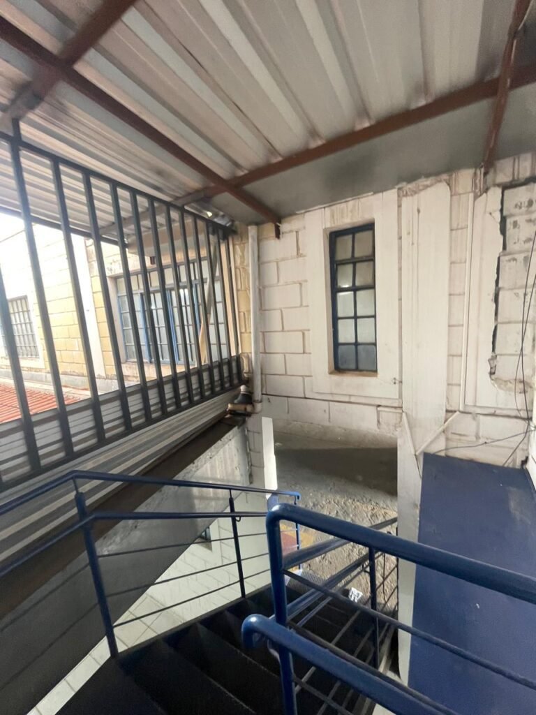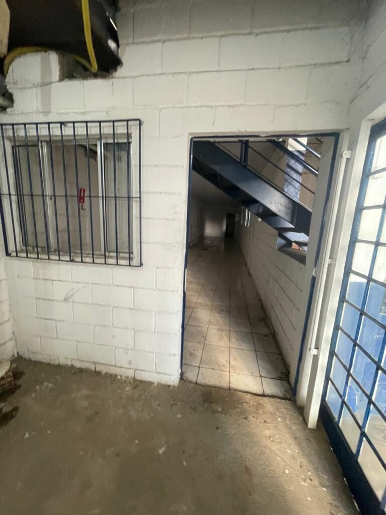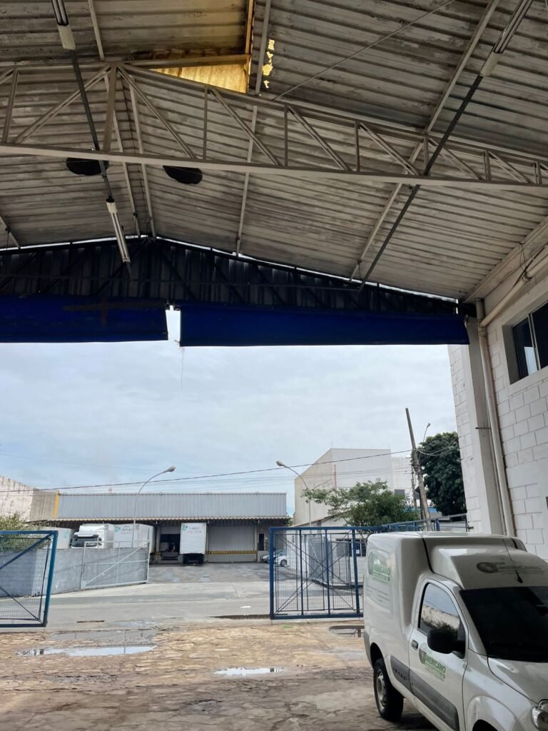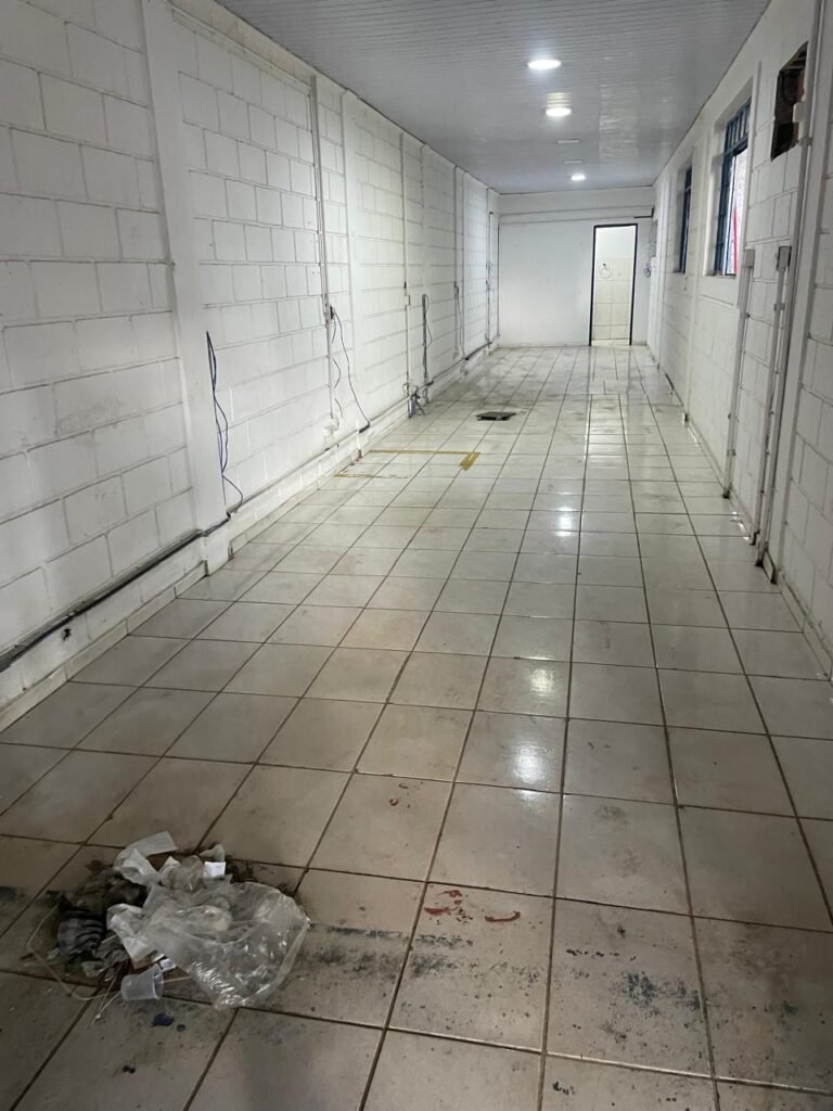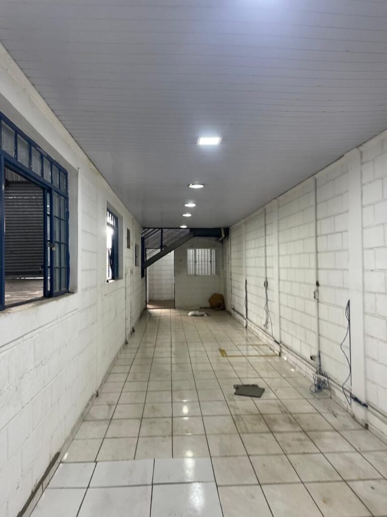 GALPÃO:- piso concreto desempenado com desgaste natural restante em ordem, paredes parte com azulejo e restante blocos aparentes ambos com pintura sendo barrado na cor azul e restante na cor branco neve em ordem, 08 vitrôs em ordem, telhado com estrutura de ferro com pintura na cor branco com desgaste e sujeira restante em ordem, 06 trocadores de ar em ordem, 02 lustres em ordem, 02 lâmpadas mistas 400 watts, 09 vitrô de ferro com pintura na cor azul, 217 vidros lisos transparentes sendo que 02 vidros estão quebrados restante em ordem, 05 portas de aço de enrolar em ordem, molas em ordem, 01 fechadura com 02 chaves tetra com travas tipo ferrolho em ordem, guarda-corpo de ferro com pintura na cor azul em ordem, quadro de disjuntores, 06 disjuntores sendo Siemens 55×12 03 tomadas em ordem, 02 interruptores em ordem, escada de ferro em chapa xadrez com corrimão e guarda corpo com pintura na cor azul em ordem.