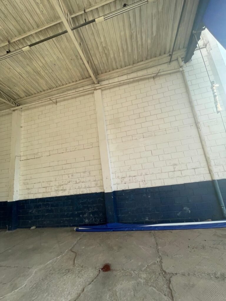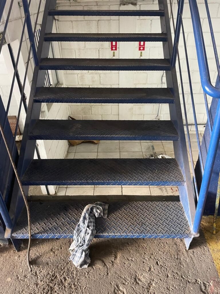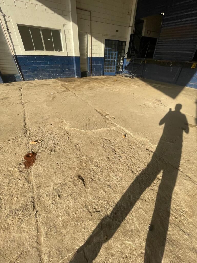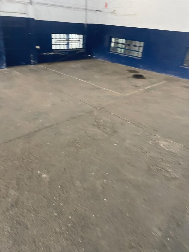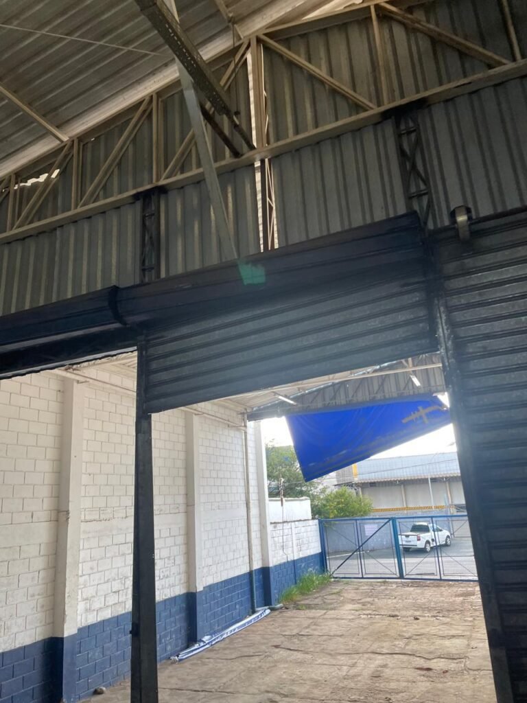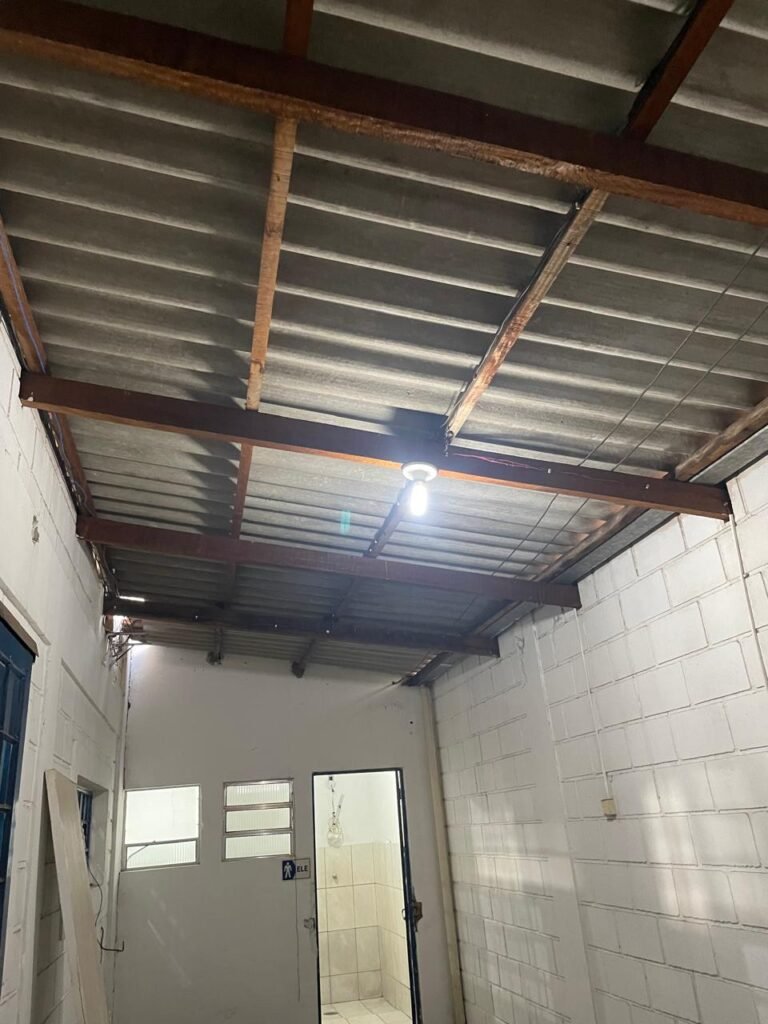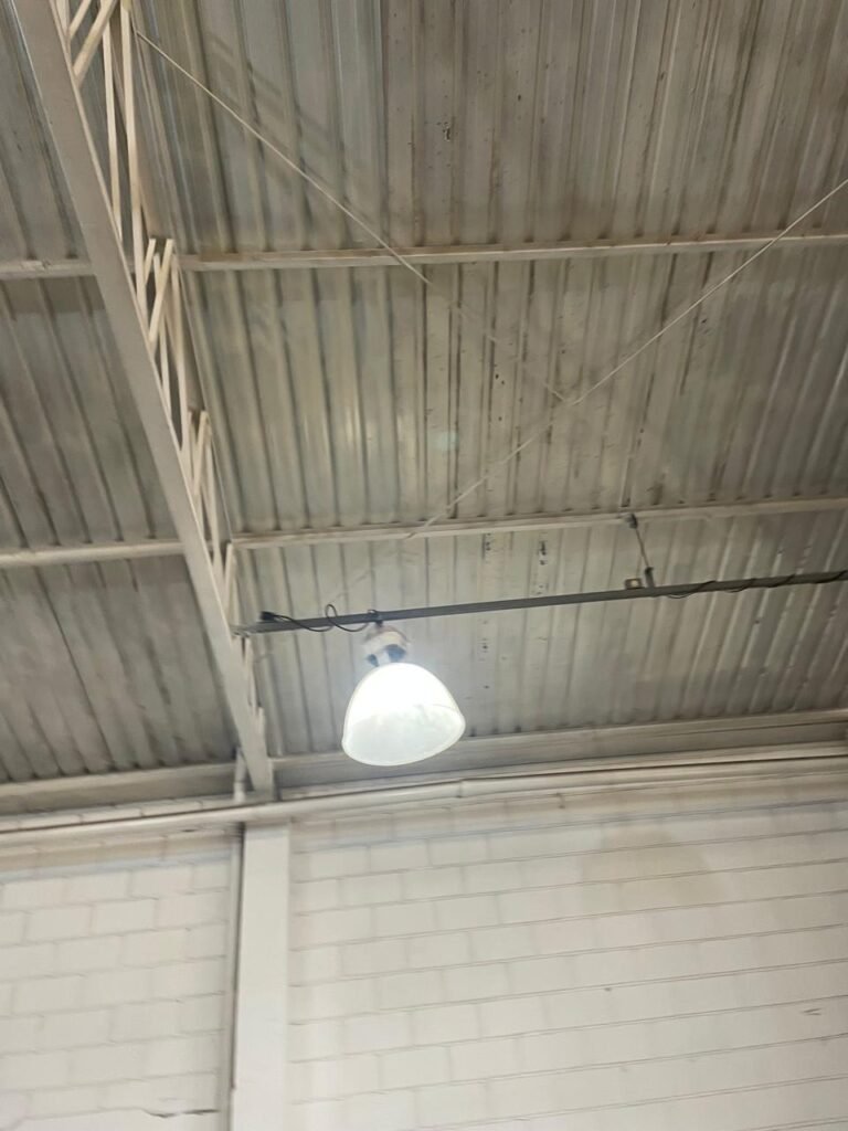 GALPÃO:- piso concreto desempenado com desgaste natural restante em ordem, paredes parte com azulejo e restante blocos aparentes ambos com pintura sendo barrado na cor azul e restante na cor branco neve em ordem, 08 vitrôs em ordem, telhado com estrutura de ferro com pintura na cor branco com desgaste e sujeira restante em ordem, 06 trocadores de ar em ordem, 02 lustres em ordem, 02 lâmpadas mistas 400 watts, 09 vitrô de ferro com pintura na cor azul, 217 vidros lisos transparentes sendo que 02 vidros estão quebrados restante em ordem, 05 portas de aço de enrolar em ordem, molas em ordem, 01 fechadura com 02 chaves tetra com travas tipo ferrolho em ordem, guarda-corpo de ferro com pintura na cor azul em ordem, quadro de disjuntores, 06 disjuntores sendo Siemens 55×12 03 tomadas em ordem, 02 interruptores em ordem, escada de ferro em chapa xadrez com corrimão e guarda corpo com pintura na cor azul em ordem.