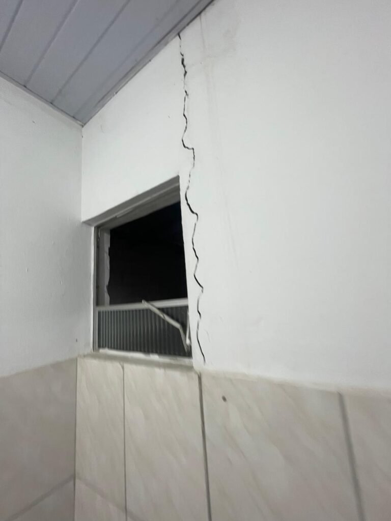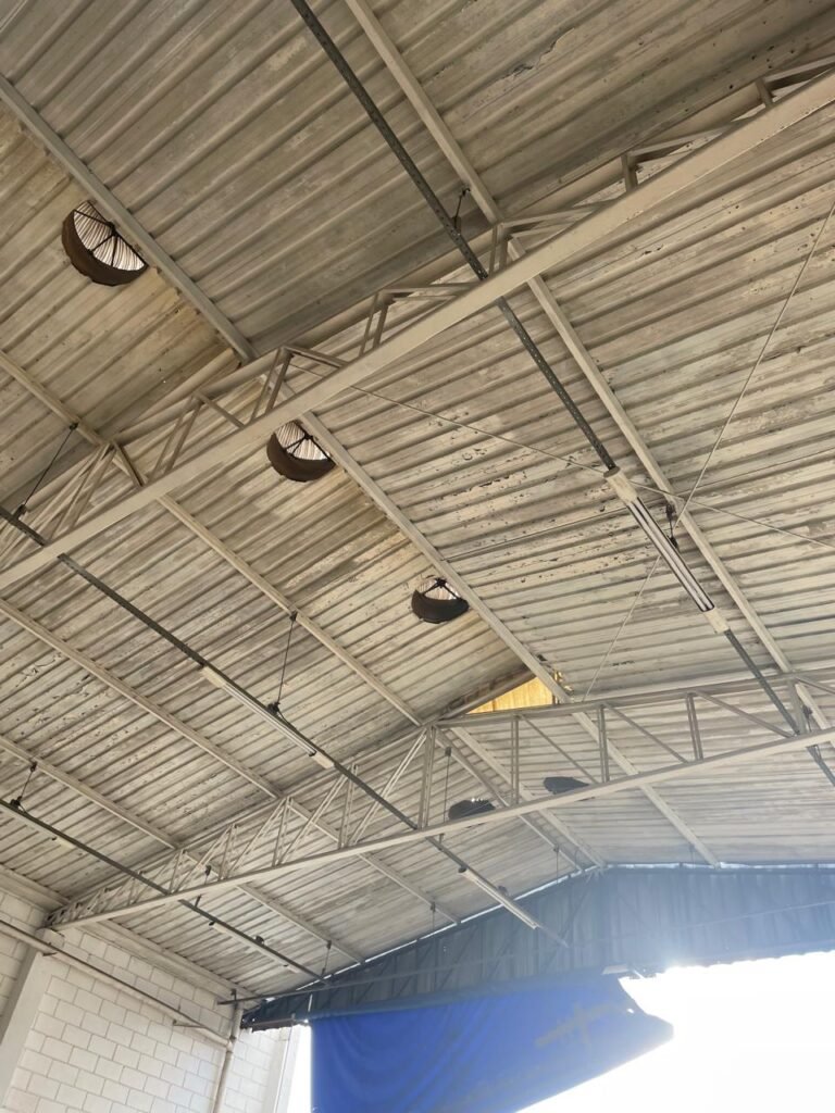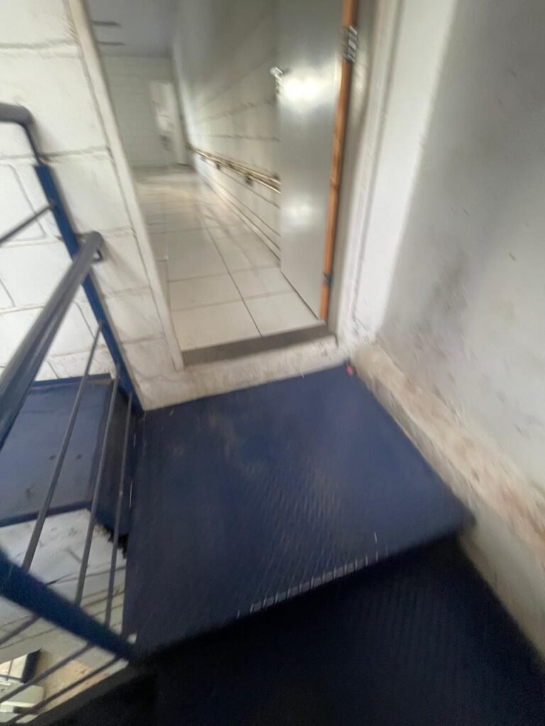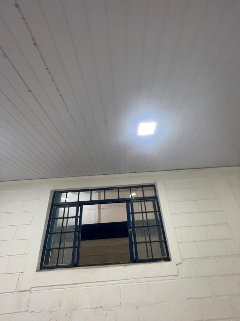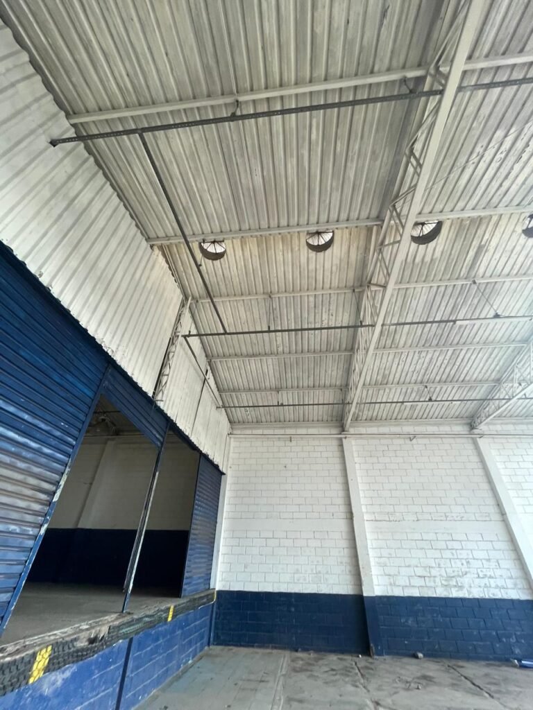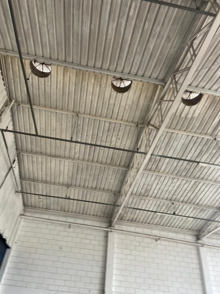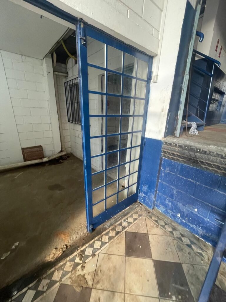 GALPÃO:- piso concreto desempenado com desgaste natural restante em ordem, paredes parte com azulejo e restante blocos aparentes ambos com pintura sendo barrado na cor azul e restante na cor branco neve em ordem, 08 vitrôs em ordem, telhado com estrutura de ferro com pintura na cor branco com desgaste e sujeira restante em ordem, 06 trocadores de ar em ordem, 02 lustres em ordem, 02 lâmpadas mistas 400 watts, 09 vitrô de ferro com pintura na cor azul, 217 vidros lisos transparentes sendo que 02 vidros estão quebrados restante em ordem, 05 portas de aço de enrolar em ordem, molas em ordem, 01 fechadura com 02 chaves tetra com travas tipo ferrolho em ordem, guarda-corpo de ferro com pintura na cor azul em ordem, quadro de disjuntores, 06 disjuntores sendo Siemens 55×12 03 tomadas em ordem, 02 interruptores em ordem, escada de ferro em chapa xadrez com corrimão e guarda corpo com pintura na cor azul em ordem.