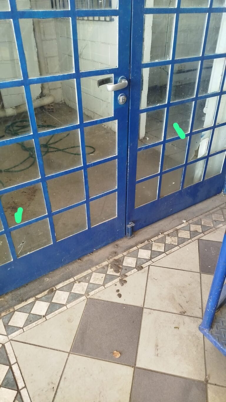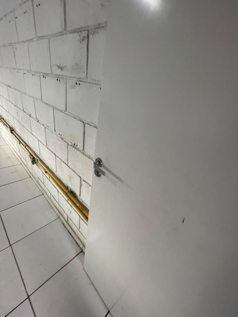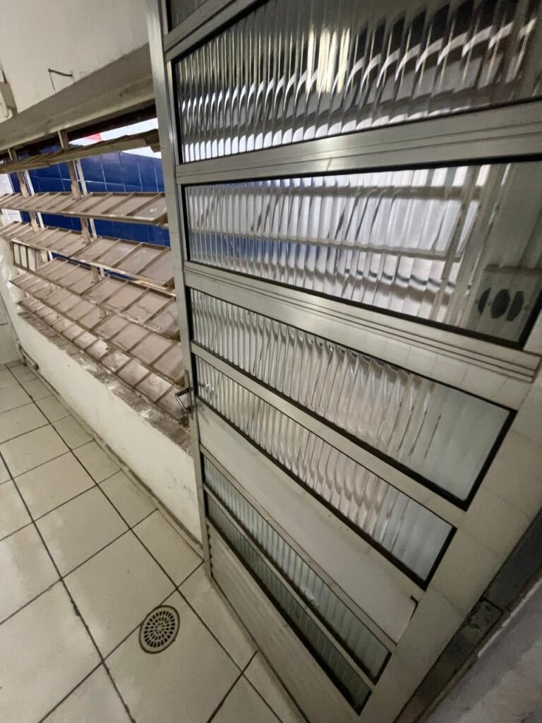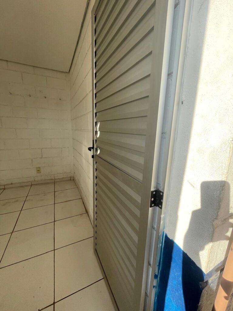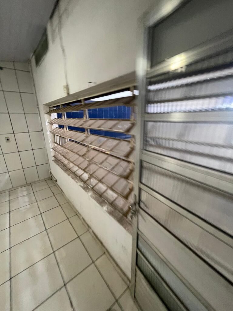 HALL:- 02 portas de aço com pintura na cor azul, com 72 quadrados de vidro em ordem, 01 fechadura sem chave, maçaneta em ordem, 01 trava de ferro na cor azul, parede de blocos aparente com pintura na cor branco neve em ordem, 01 buraco de instalação com conduite aparente 01 bocal de luz com lâmpada em ordem, 01 espelho de luz com 01 interruptor em ordem, 01 janela de correr alumínio com 04 vidros em ordem, 01 grade de proteção para janela de ferro com pintura na cor azul em ordem, teto de gesso em ordem.