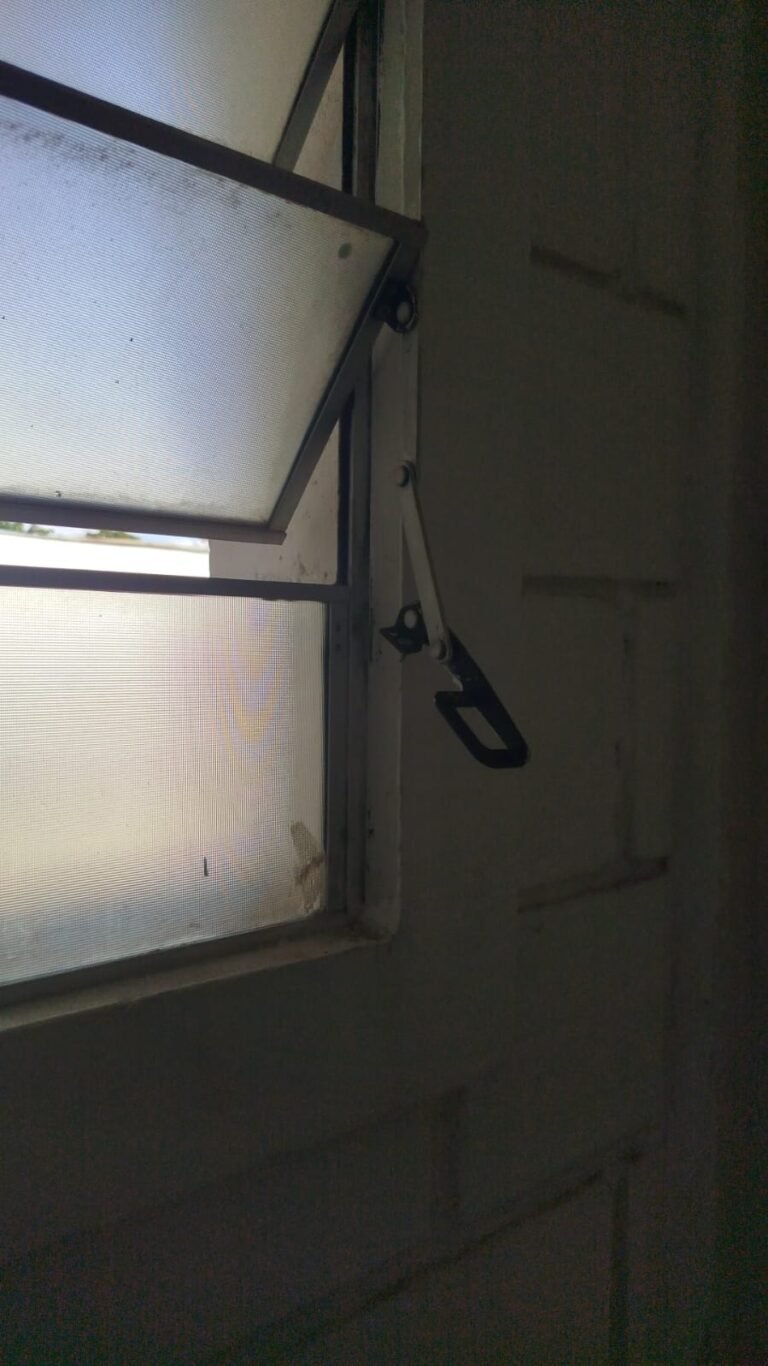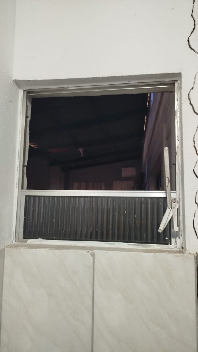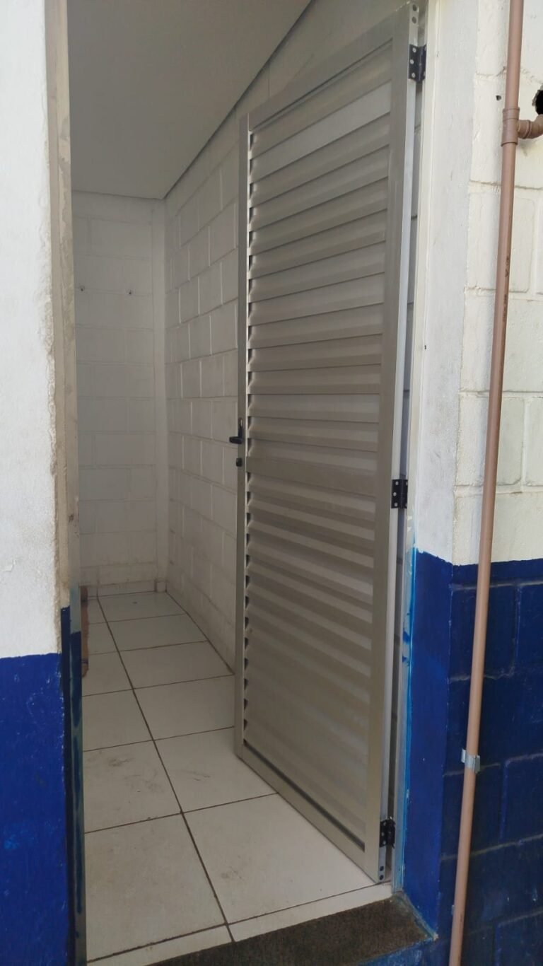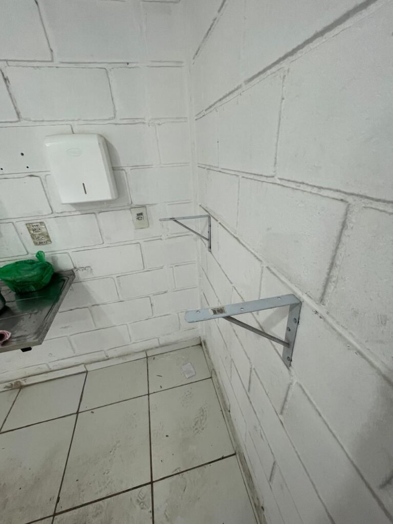 HALL:- 02 portas de aço com pintura na cor azul, com 72 quadrados de vidro em ordem, 01 fechadura sem chave, maçaneta em ordem, 01 trava de ferro na cor azul, parede de blocos aparente com pintura na cor branco neve em ordem, 01 buraco de instalação com conduite aparente 01 bocal de luz com lâmpada em ordem, 01 espelho de luz com 01 interruptor em ordem, 01 janela de correr alumínio com 04 vidros em ordem, 01 grade de proteção para janela de ferro com pintura na cor azul em ordem, teto de gesso em ordem.