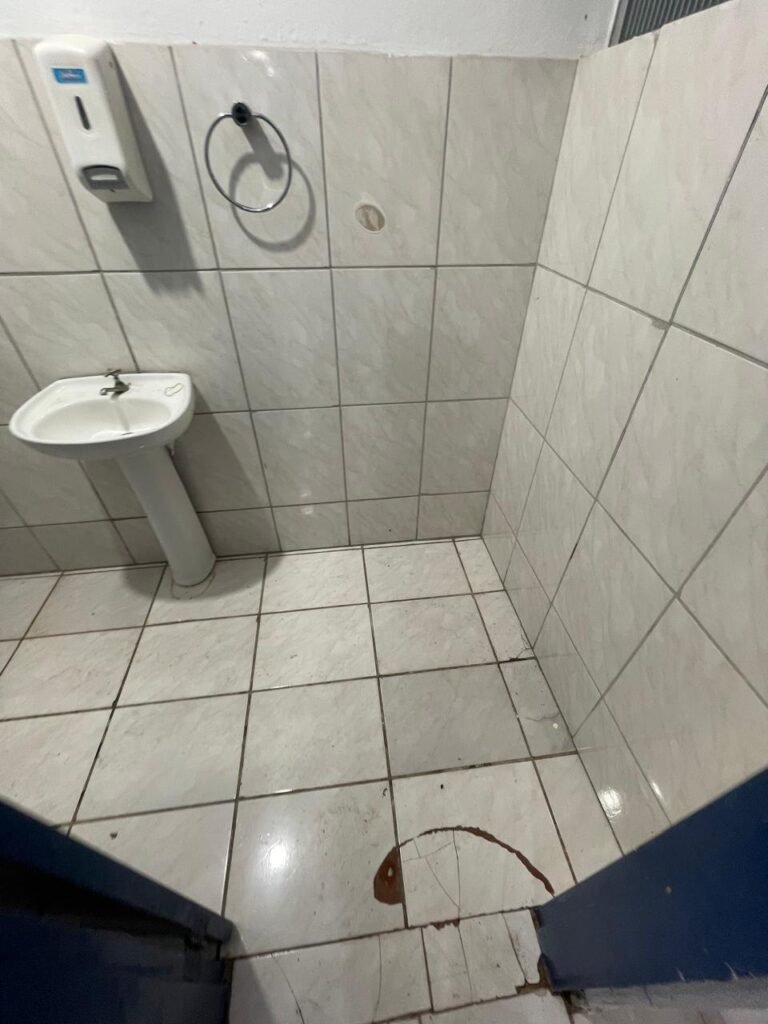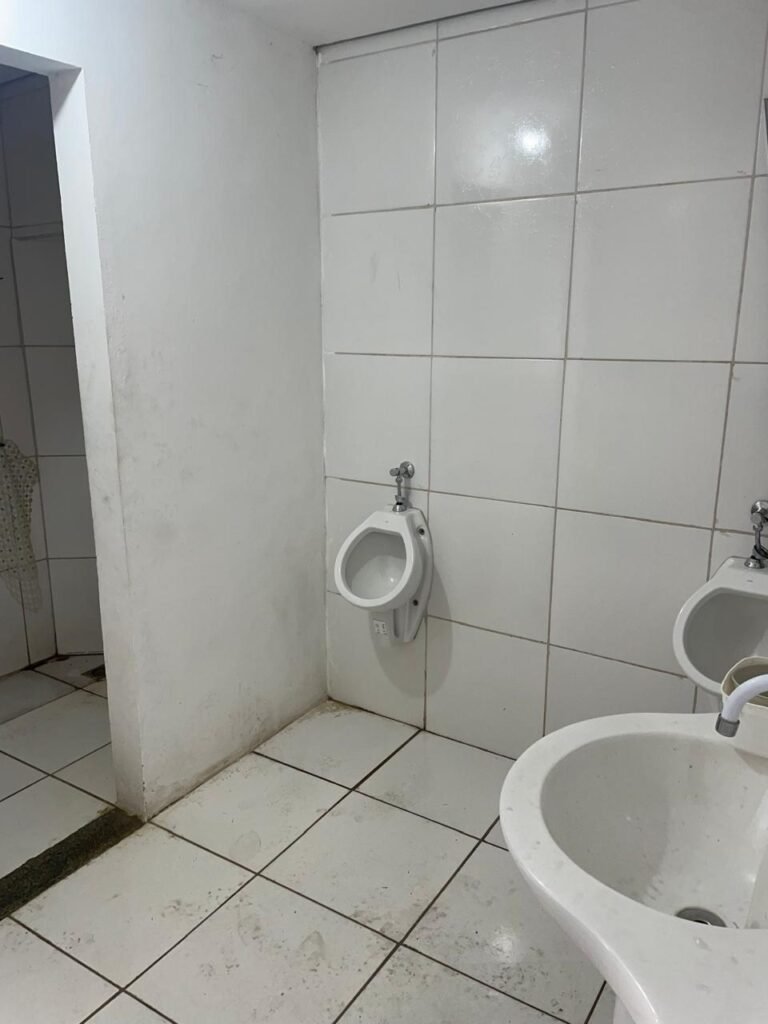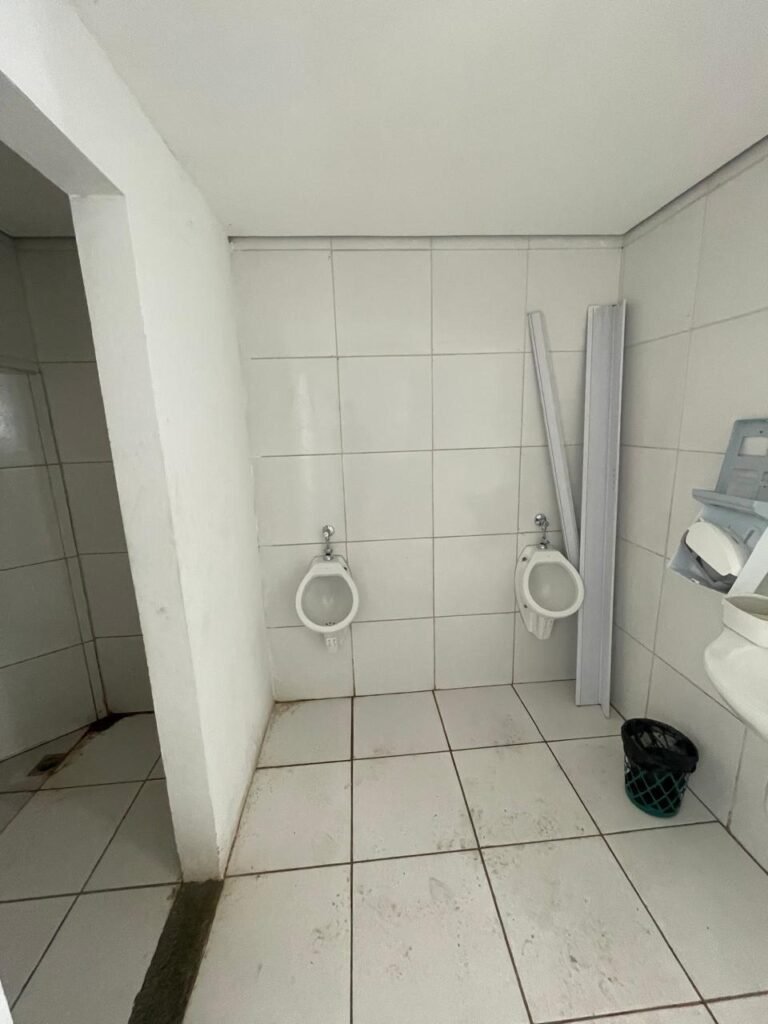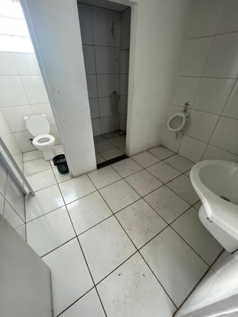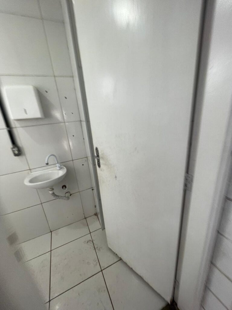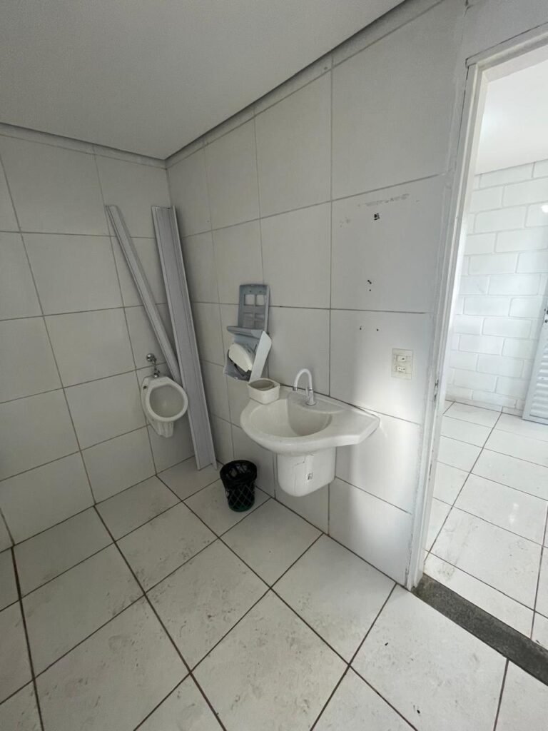 VESTIÁRIO:- 01 porta de madeira saindo lascas, com pintura na cor branco com desgastes naturais, fechadura sem chave, maçaneta em ordem, piso revestido de frio cerâmico em ordem, paredes de blocos aparente com pintura na cor branco com machas e em ordem, conjunto sanitário em ordem e com tampa, vitrô basculante com 03 vidros foscos, 01 deles manchado e restante em ordem, 01 chuveiro Loren Shower da marca Lorenzetti em ordem, registro do chuveiro na cor preto em ordem, 02 espelhos de fiação, sendo 01 sem a tampa e 01 com tampa e fiação para chuveiro aparente, 01 registro sem acabamento, 01 ralo sem tampa, 02 mictórios em ordem, 01 lavatório com coluna suspensa na cor branco em ordem, 01 torneira de plástico em ordem, 01 espelho de luz com 01 interruptor e 01 tomada em ordem. 01 bocal com lâmpada em ordem, teto de gesso com pequeno furo na área do chuveiro e restante em ordem, 01 porta papel em ordem.