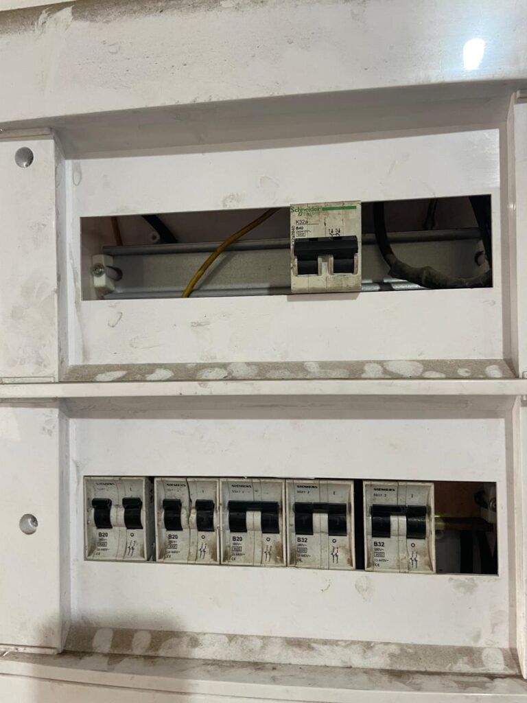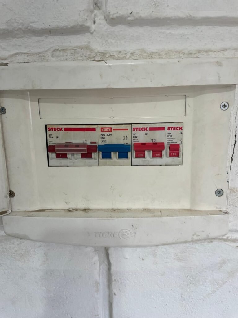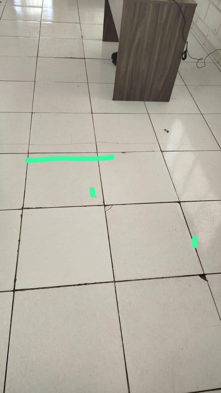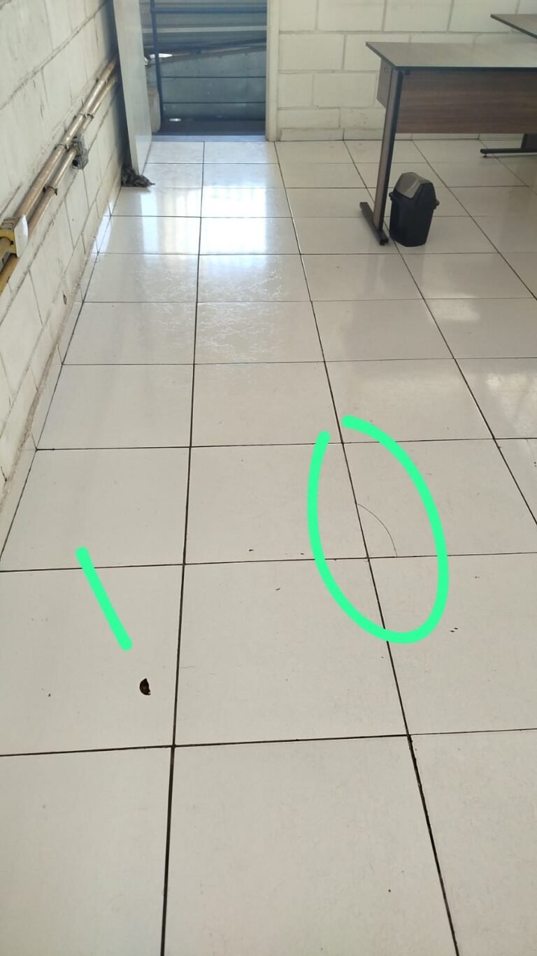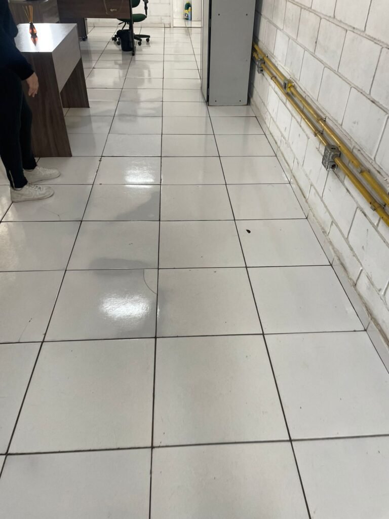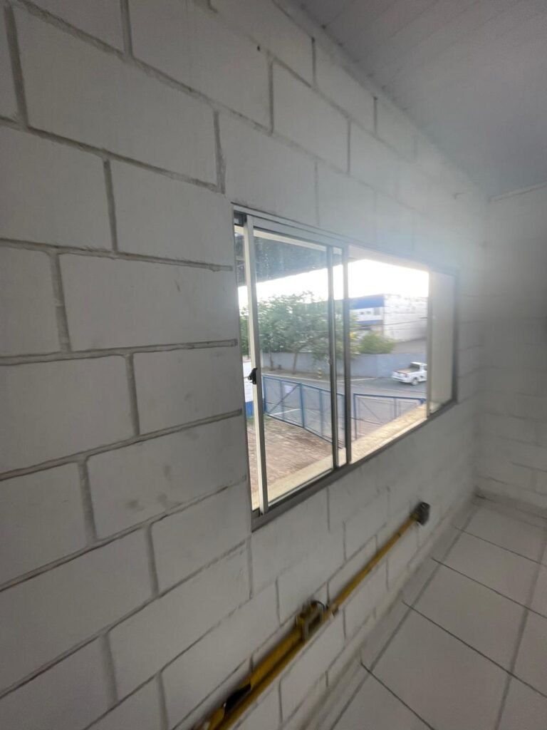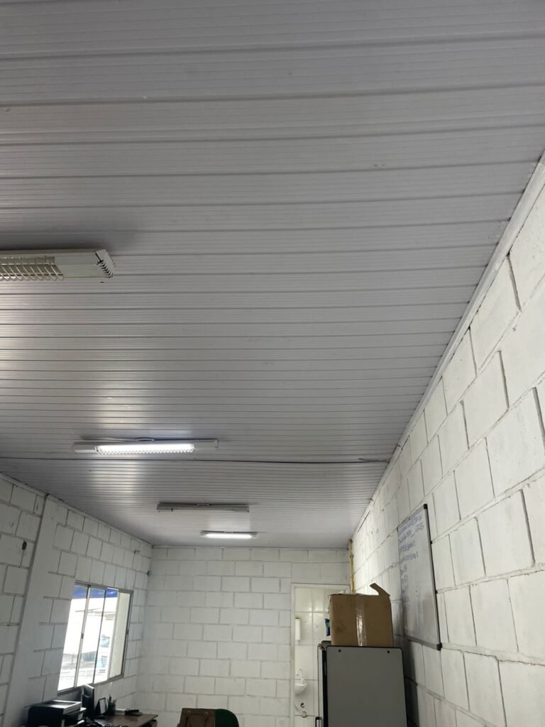 ESCRITÓRIO SUPERIOR:- Piso frio cerâmico na cor branco em ordem, parede de blocos aparentes com pintura na cor branco neve em rodem, forro PVC na cor branco nova e em ordem, 05 luminárias duplas e 02 estando queimadas em ordem, 10 lâmpadas fluorescentes tubulares sendo que 04 estão queimadas e restante em ordem, 03 vitrô esquadria de alumínio em ordem, puxadores e travas em ordem, 12 vidros lisos transparentes em ordem, parte elétrica por conduletes na cor amarela em ordem, 21 tomadas em ordem, 08 tomadas rede em ordem, 02 interruptores em ordem, caixa disjuntores tigre em ordem, 03 disjuntores Steck sendo 1 ISD C32 28, 1 ISD C20 2P, 1 ISDC10 1P, porta de madeira com pintura na cor branco com desgaste natural e soltando lasca na base, maçanetas em ordem, fechadura quebrada e rachada próximo à fechadura.