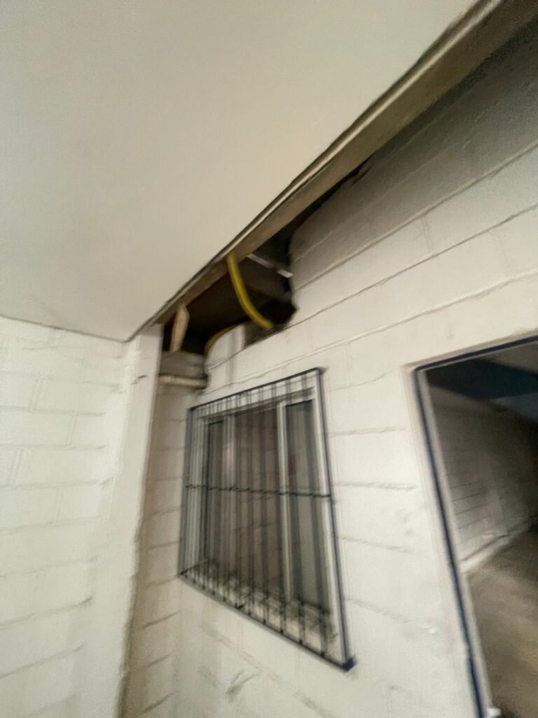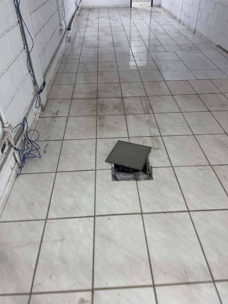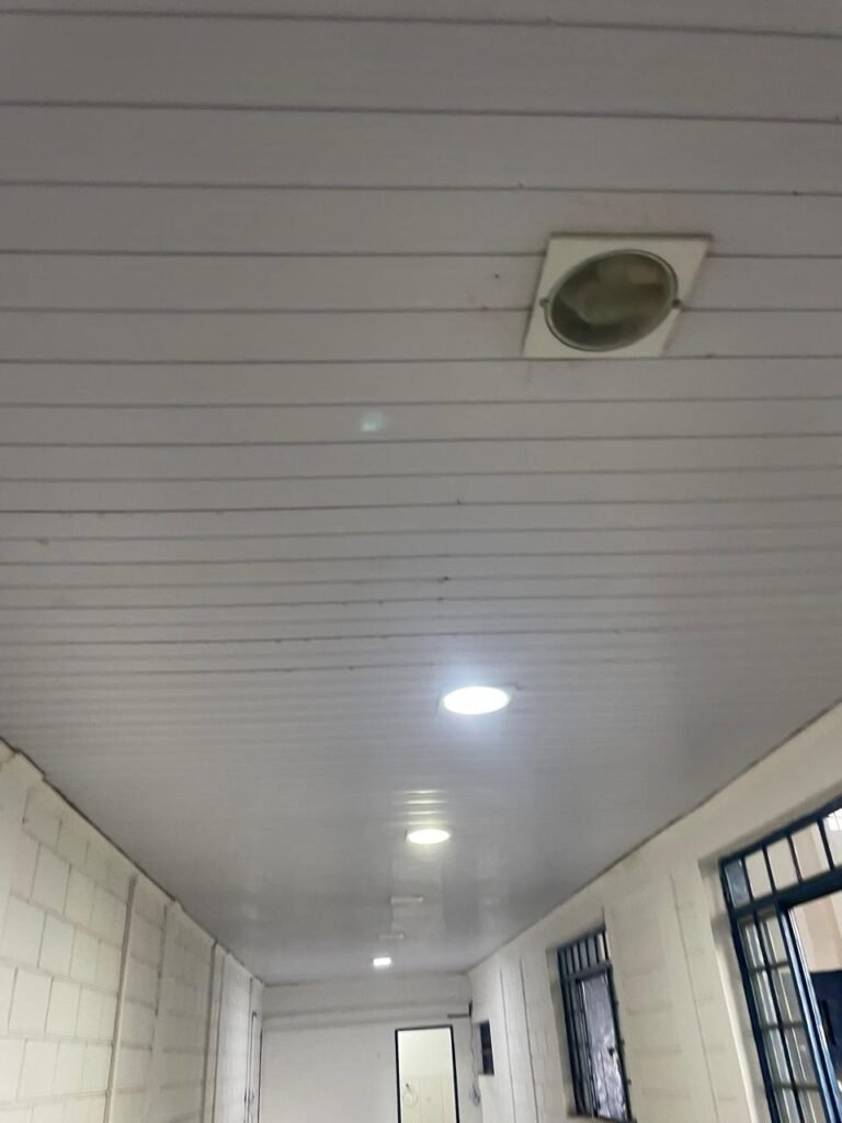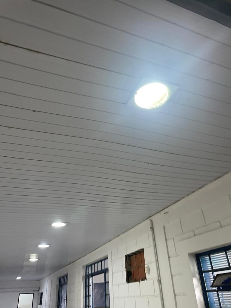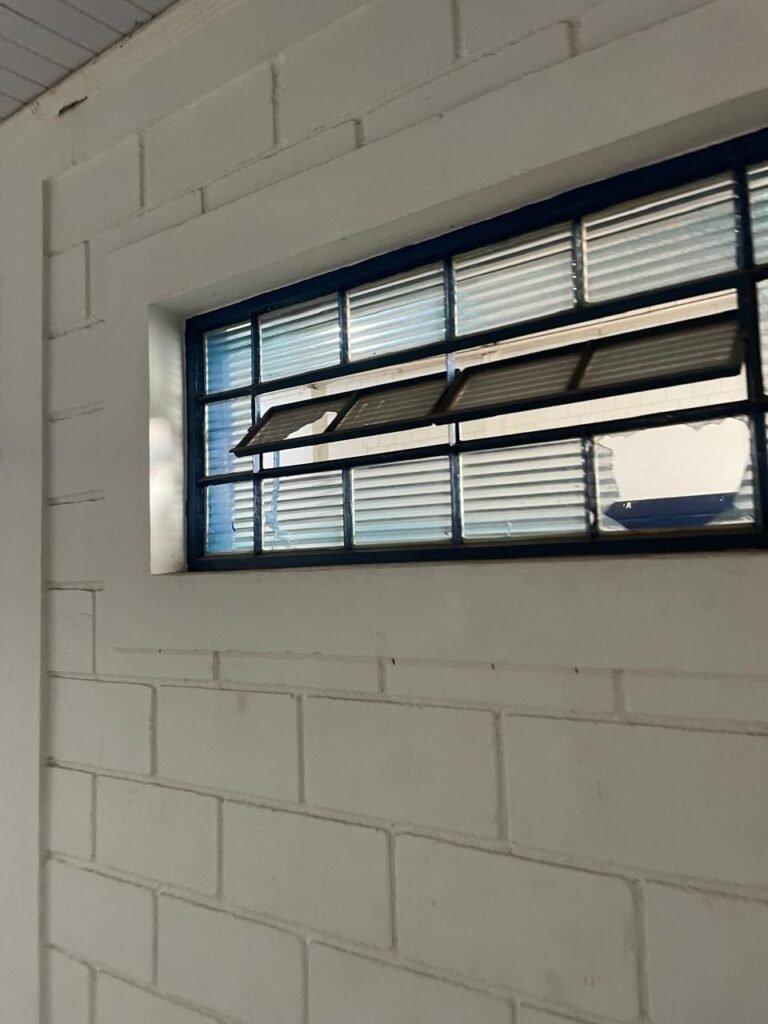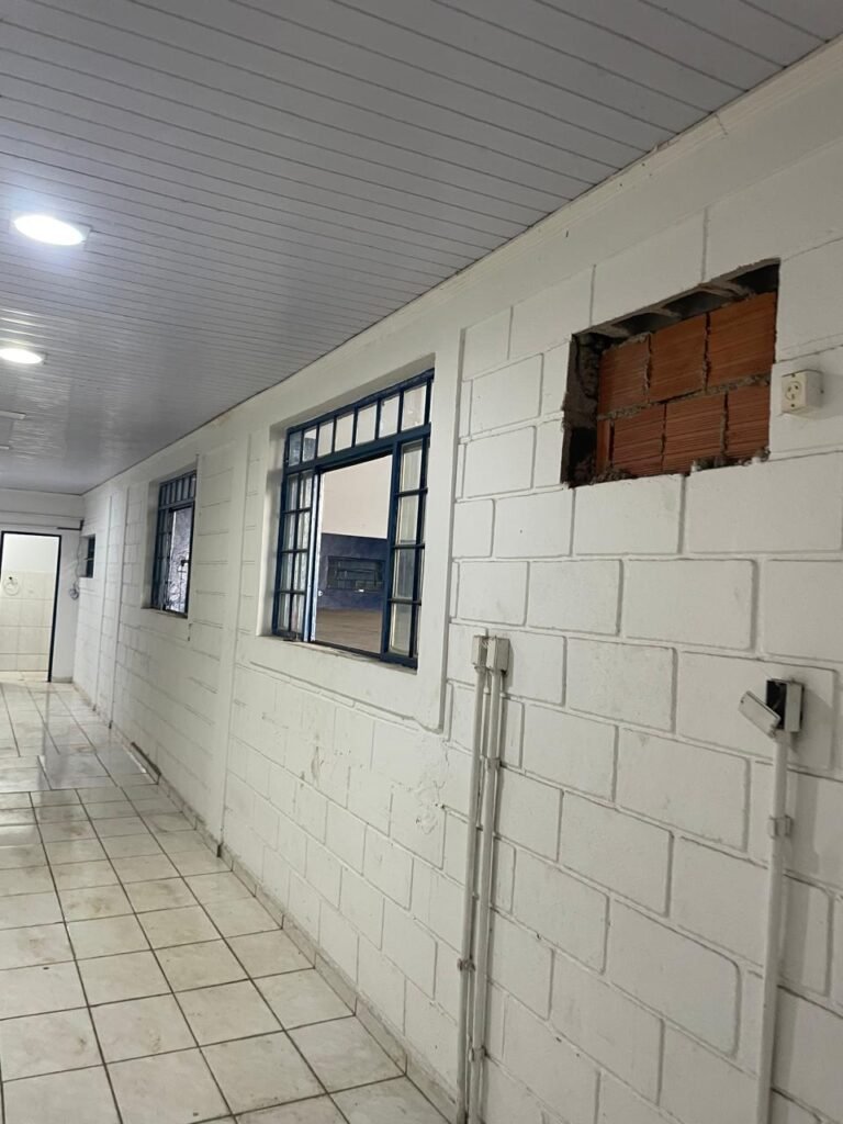 CORREDOR:- piso frio cerâmico com 09 peças diferentes e restante em ordem, 02 apoios suspensos para extintores com placas em ordem, 01 espelho de luz com 01 interruptor em ordem, parede de blocos aparentes com pintura na cor branco neve em ordem, teto revestido de PVC em ordem, 06 lampas de embutir em ordem, 02 janelas de ferro com pintura na cor azul, 24 vidros quadrados em ordem, 02 vitrôs basculantes de ferro na cor azul, 18 vidros quadrados sendo que em um dos vitrôs tem 02 vidros quebrados e restante em ordem, eletrodutos de ferro com pintura na cor branco neve, fiações aparente, 01 espelho de tomada contendo 01 tomada, 01 tampa de inspeção em ordem.
