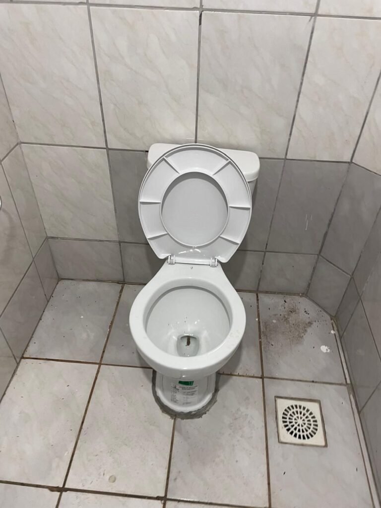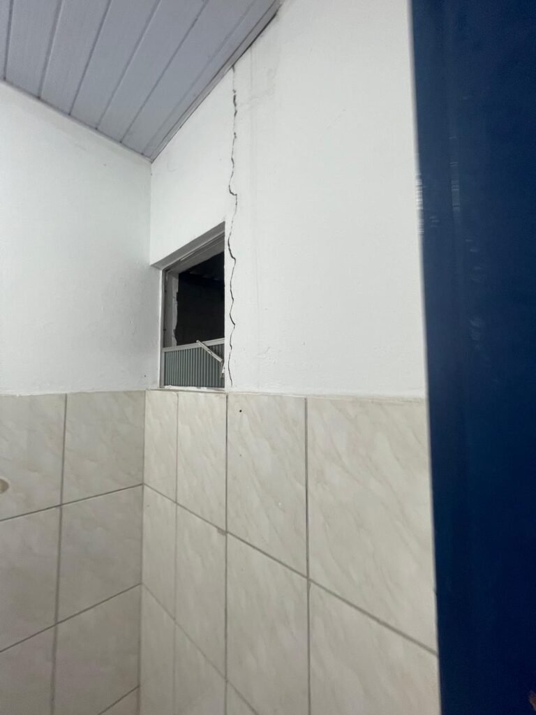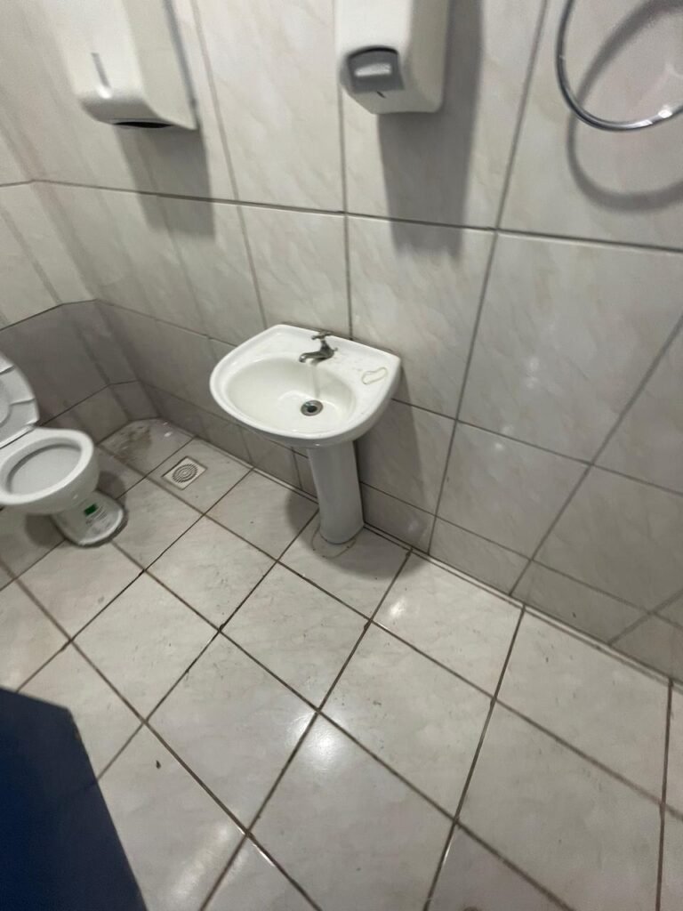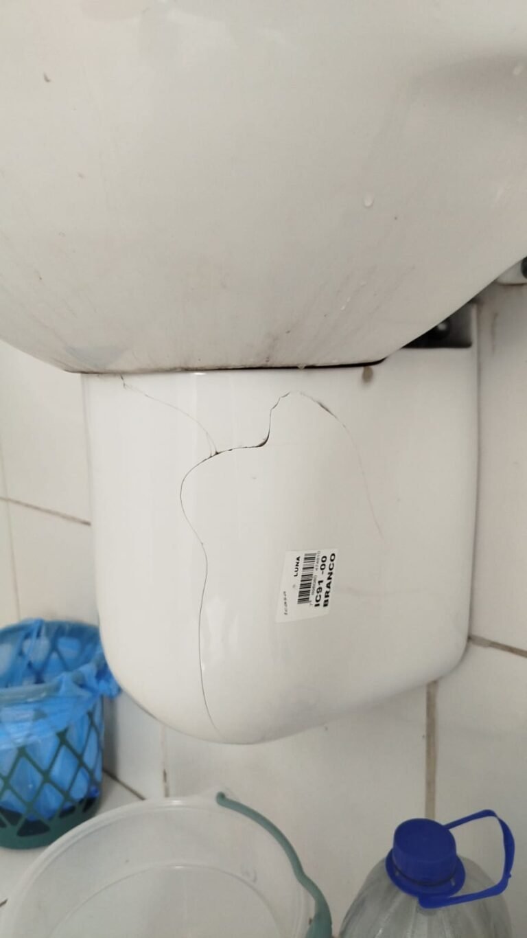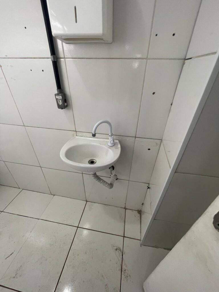 WC:- piso frio cerâmico com 04 peças danificadas e restante em ordem, 01 lavatório com coluna marca em ordem, 01 torneia inox em ordem, teto revestido de PVC em ordem, parede com pintura na cor branco neve com rachadura e restante em ordem, 01 conjunto sanitário com tampa em ordem, 01 ralo com tampa de plástico em ordem, 01 papeleira inox em ordem.