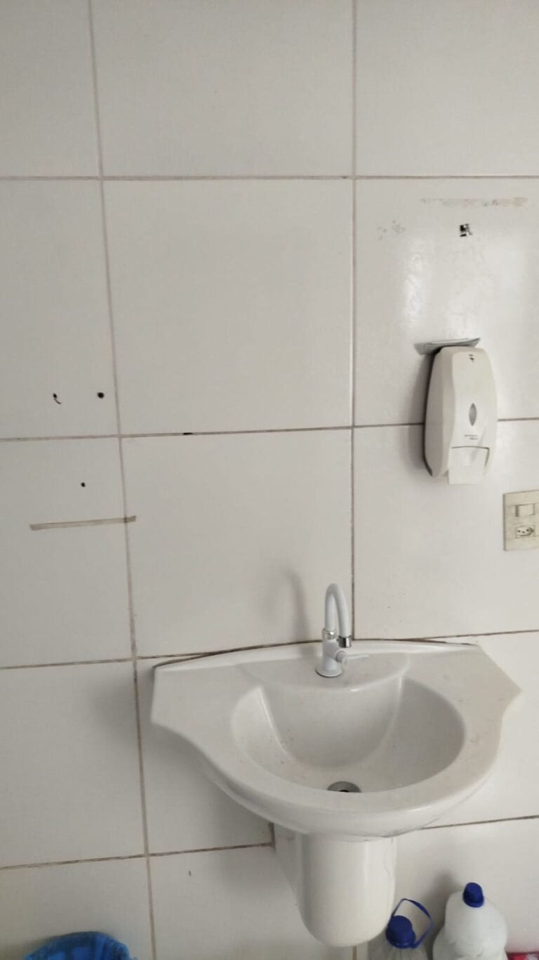 WC:- Piso frio cerâmico na cor branco em ordem, 01 ralo com tampa inox e desentupido em ordem, azulejo até o teto com 12 buchas e 04 peças manchadas restante em ordem, teto PVC em ordem, 01 lustre em ordem, 01 lâmpada compacta em ordem, 01 interruptor em ordem, 01 tomada em ordem, vitro basculante esquadria de alumínio em ordem, 03 vidros canelados em ordem, porta de madeira com pintura na cor branco suja, fechadura e chave em ordem, maçanetas em ordem, pia cerâmica branca em ordem, sifão sanfonado em ordem, 01 torneira bica móvel em ordem.