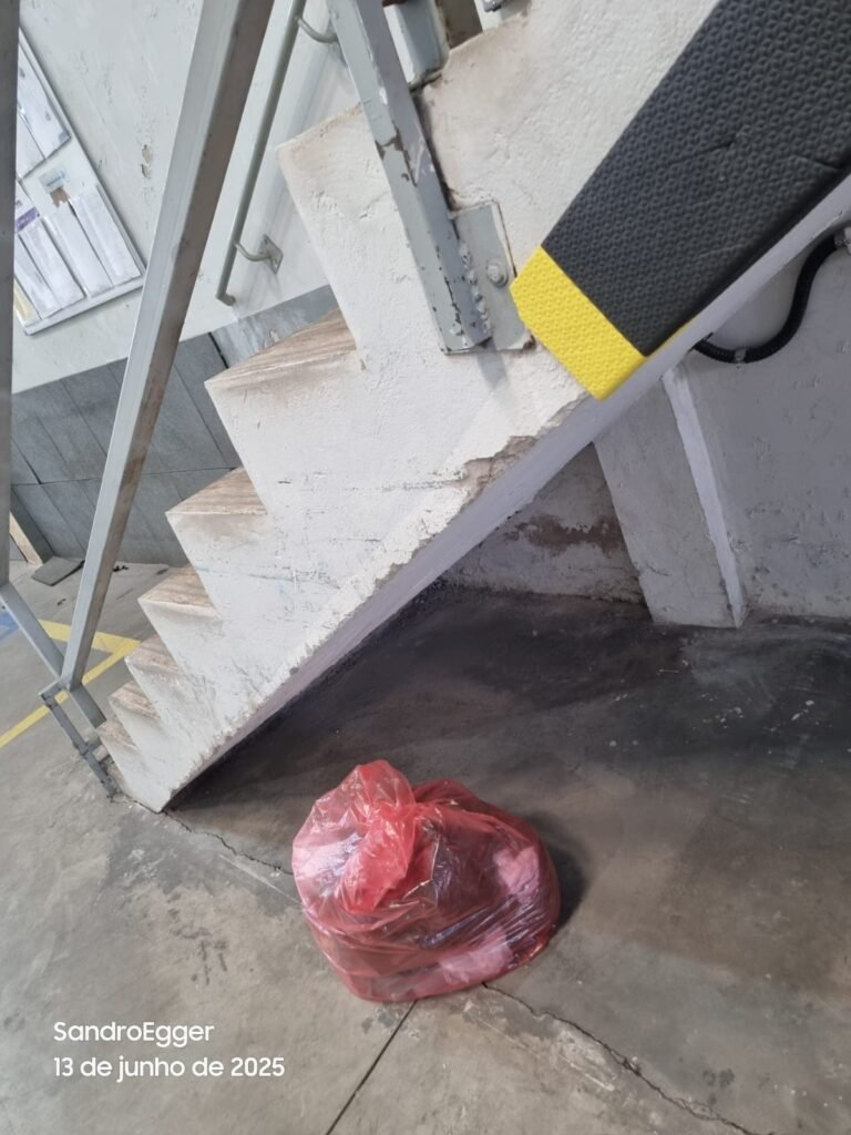 * Realizar pintura das partes em alvenaria, realizar reparo da escada do mezanino da frente com piso cerâmico quebrado, realizar pintura embaixo das escadas.