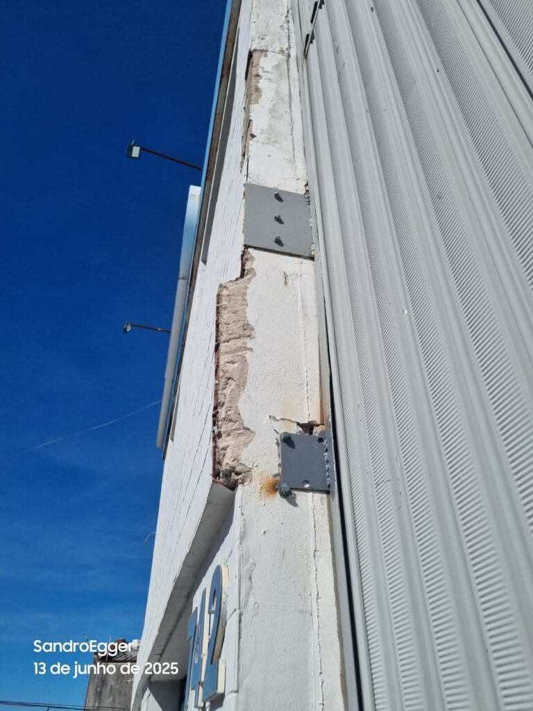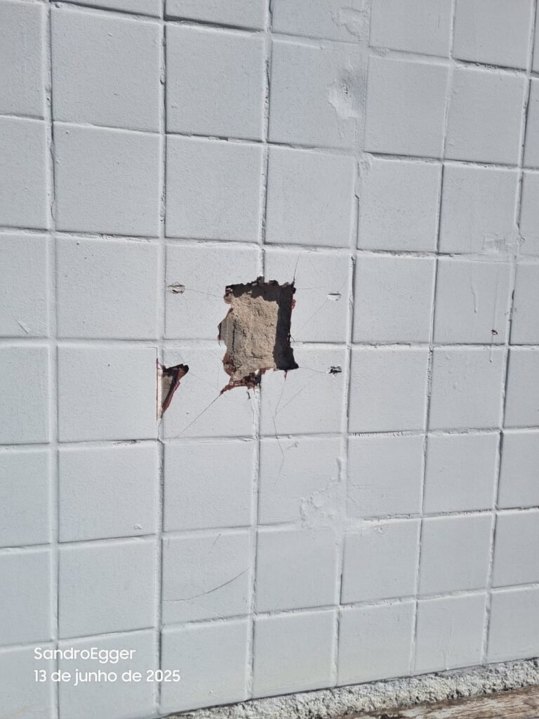 * Realizar conserto das laterais do reboco que quebrados por batidas, relocar azulejos que estão faltando, realizar retirada das propagandas da loggi, pintura geral da fachada incluindo fachada de azulejo, muros e grades.