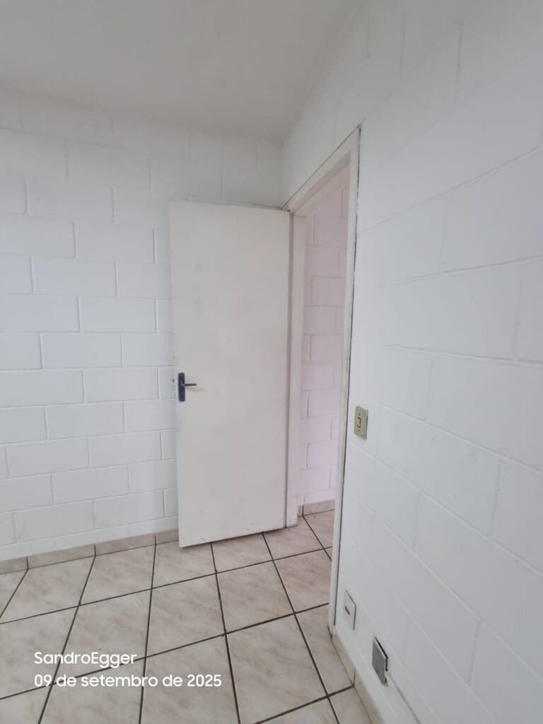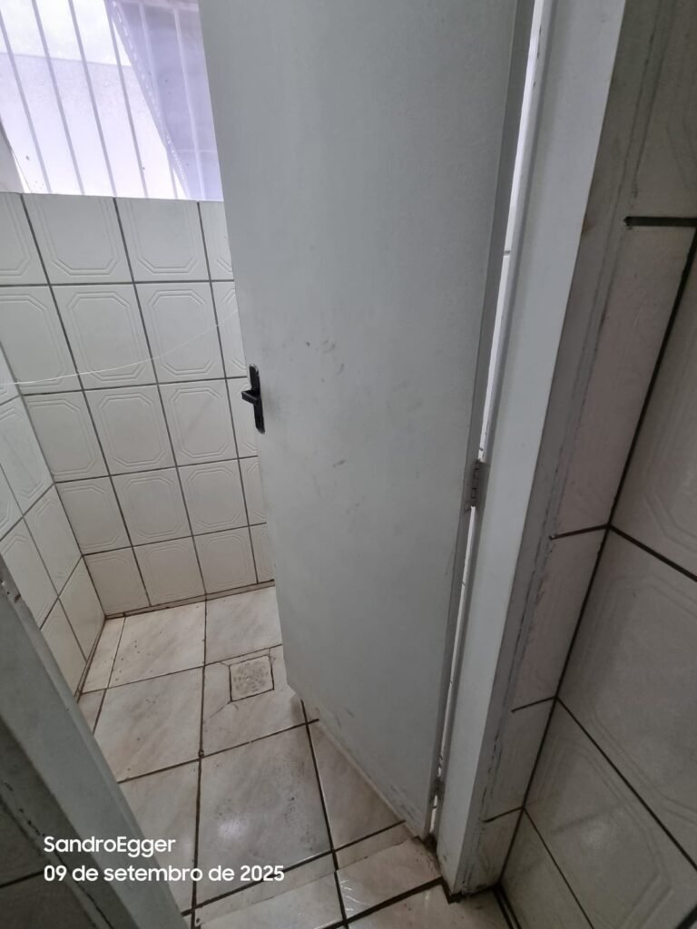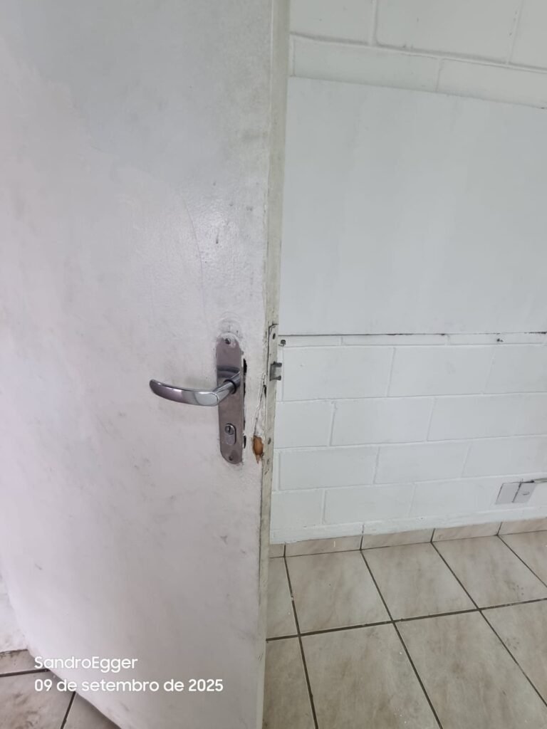 • Porta de madeira quebrada próxima a fechadura e a porta próxima ao corredor está em ordem.