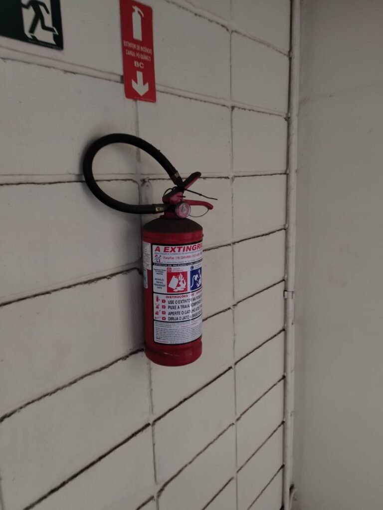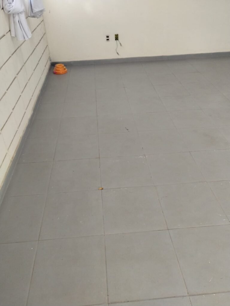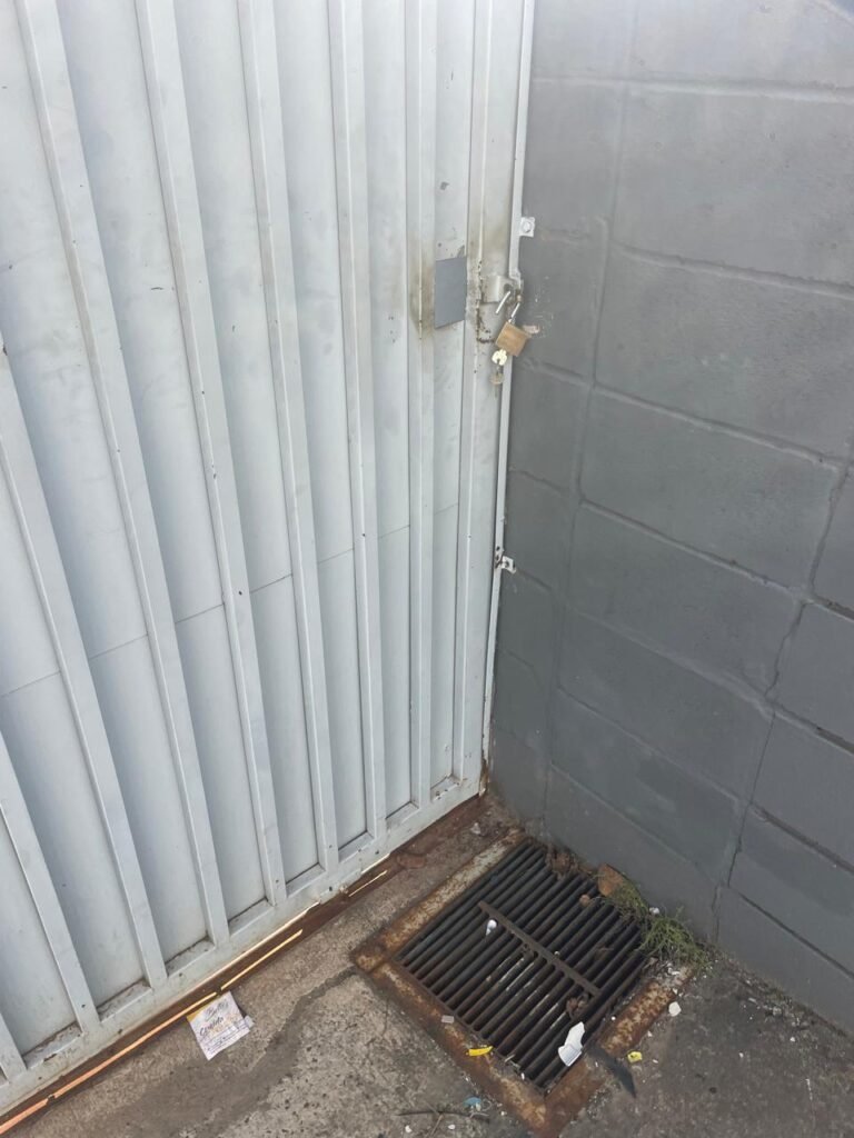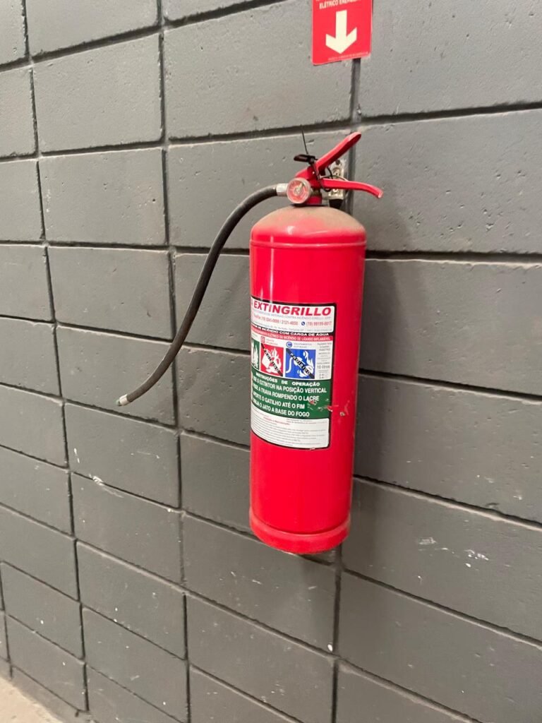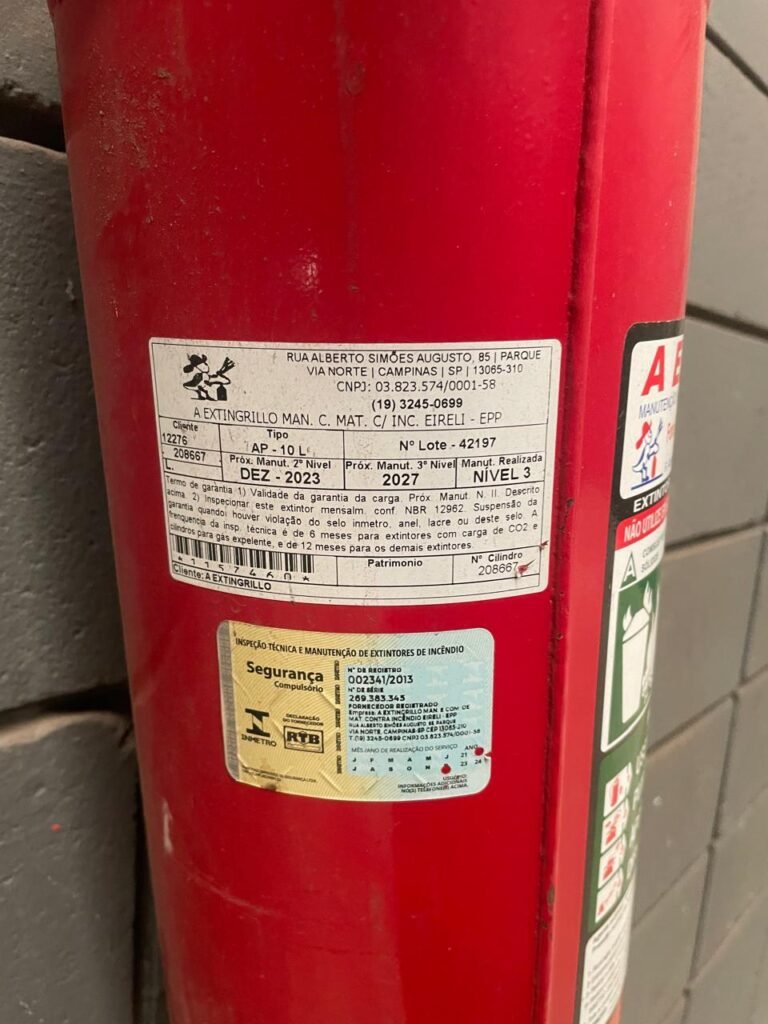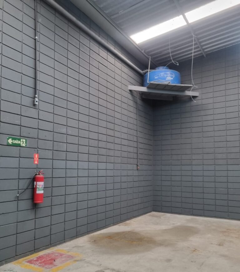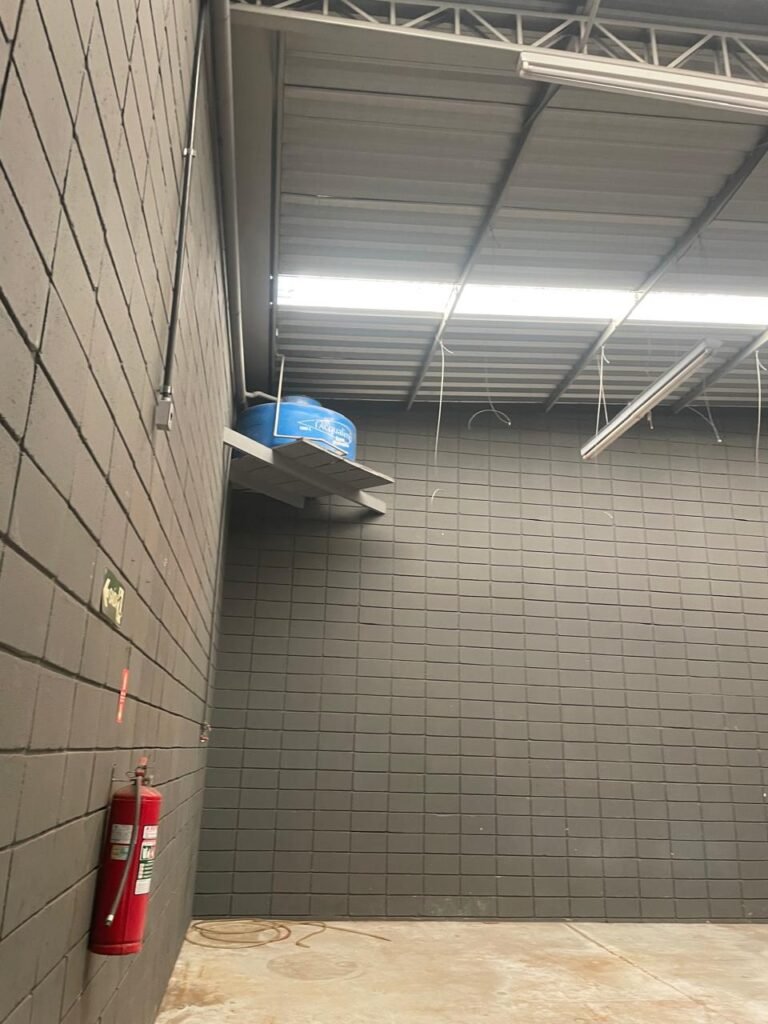 BARRACÃO-: Piso de concreto com resgates naturais, com manchas pela extensão, e com sujeira, 02 demarcações de incêndio com desgastes naturais, 01 ralo sem tampa, 04 furos no chão com parafuso, 01 portão de abrir em L, de Metalon pintura na cor cinza claro nova e em ordem, 01 fechadura ferrolho com trinco para cadeado, 02 puxadores e 01 trinco para cadeado em ordem, paredes de blocos de concreto com pintura na cor cinza nova e em ordem, 03 extintores de incêndio sendo eles: 02 de pó químico 20-B:C 4kg e 01 de água 10l 2-A com validade em ordem, 01 interruptor e 03 tomadas, apenas 02 tomadas estão com espelhos sem tampa, restante em ordem, 01 escada de ferro com partes amassadas, pintura na cor azul escuro com desgastes naturais, guarda corpo e corrimão em ordem, 07 luminárias duplas pendentes, ambas com 02 lâmpadas tubulares florescentes, apenas 10 lâmpadas estão em ordem, 01 caixa d’água marca Acqualimp 1000l em ordem.