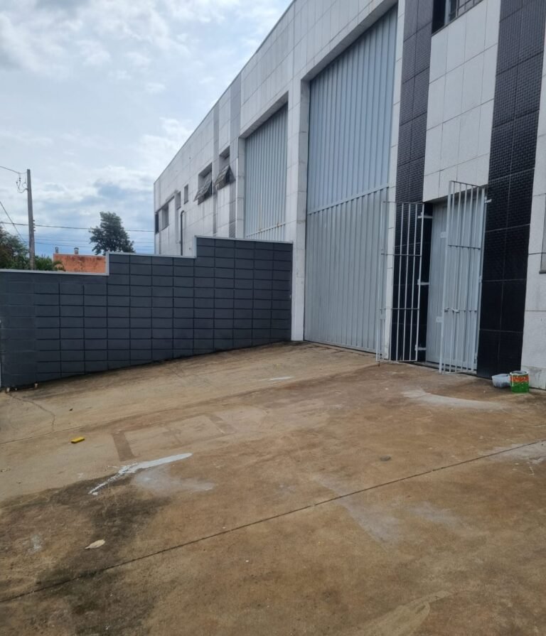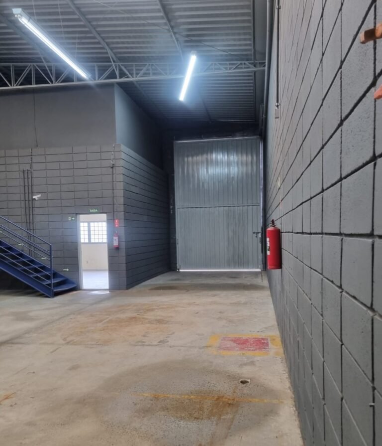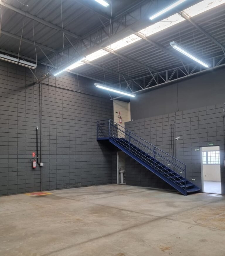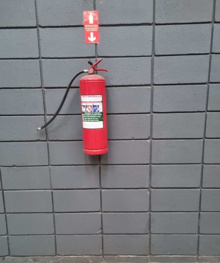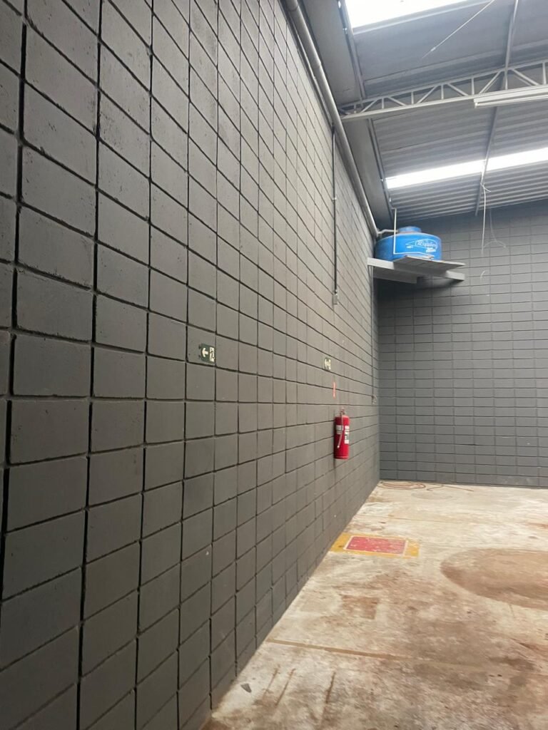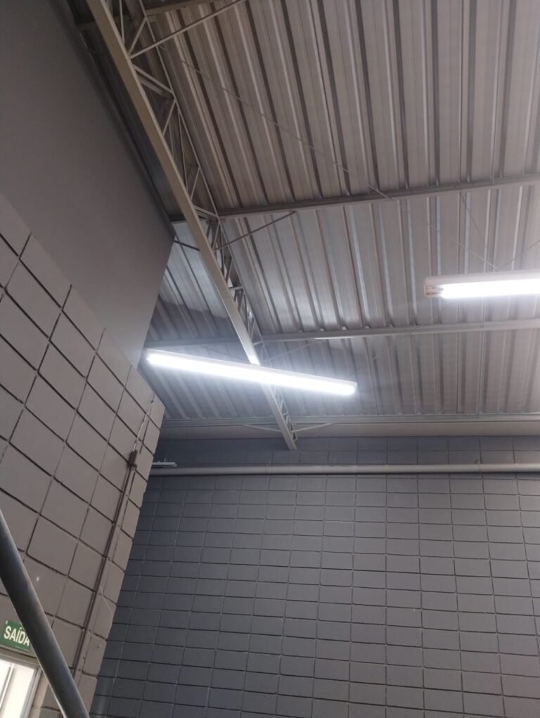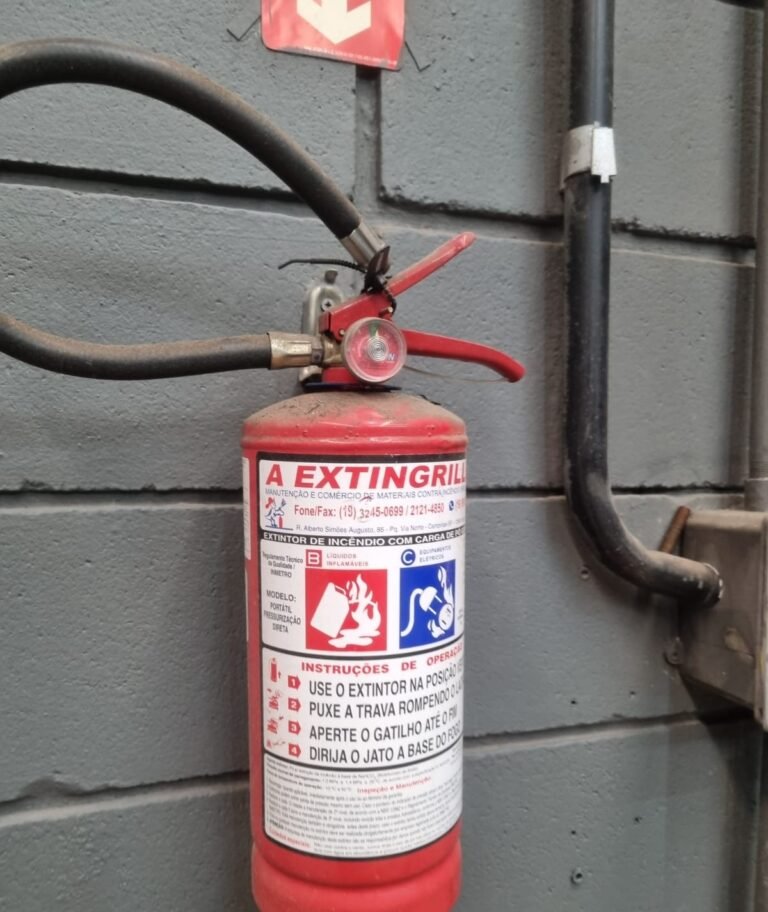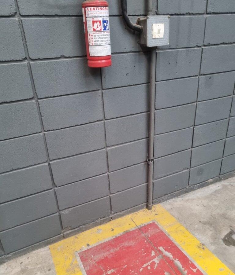 BARRACÃO-: Piso de concreto com resgates naturais, com manchas pela extensão, e com sujeira, 02 demarcações de incêndio com desgastes naturais, 01 ralo sem tampa, 04 furos no chão com parafuso, 01 portão de abrir em L, de Metalon pintura na cor cinza claro nova e em ordem, 01 fechadura ferrolho com trinco para cadeado, 02 puxadores e 01 trinco para cadeado em ordem, paredes de blocos de concreto com pintura na cor cinza nova e em ordem, 03 extintores de incêndio sendo eles: 02 de pó químico 20-B:C 4kg e 01 de água 10l 2-A com validade em ordem, 01 interruptor e 03 tomadas, apenas 02 tomadas estão com espelhos sem tampa, restante em ordem, 01 escada de ferro com partes amassadas, pintura na cor azul escuro com desgastes naturais, guarda corpo e corrimão em ordem, 07 luminárias duplas pendentes, ambas com 02 lâmpadas tubulares florescentes, apenas 10 lâmpadas estão em ordem, 01 caixa d’água marca Acqualimp 1000l em ordem.