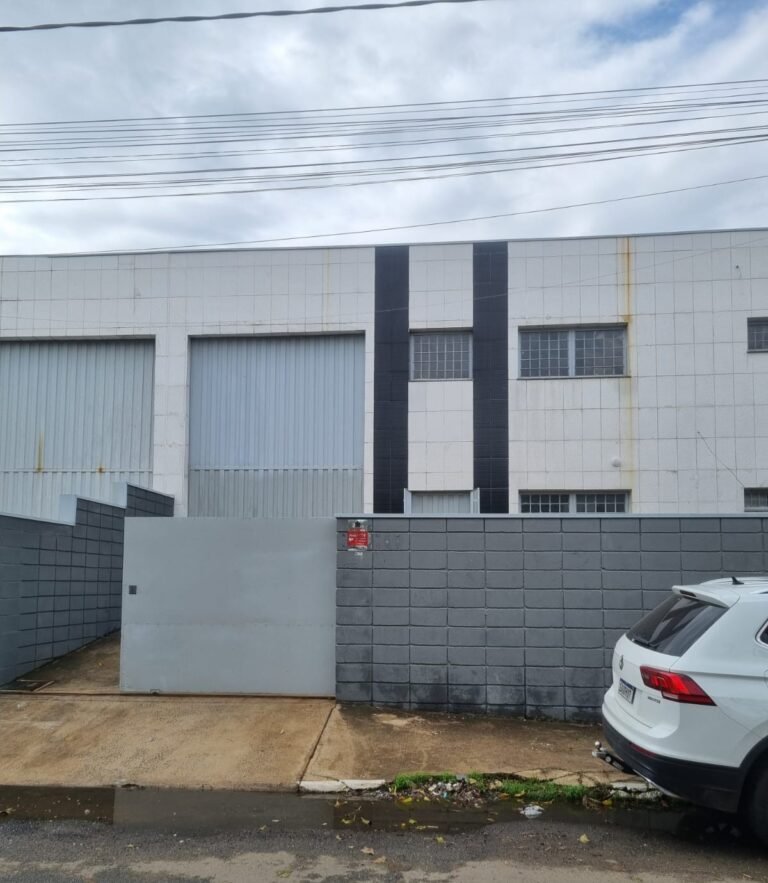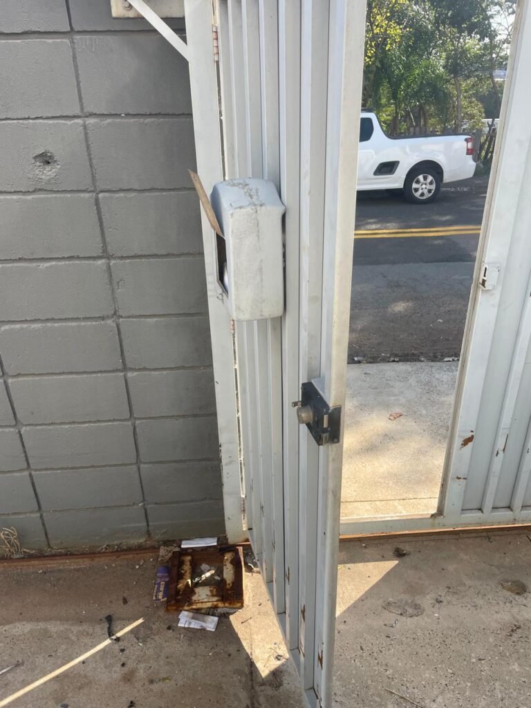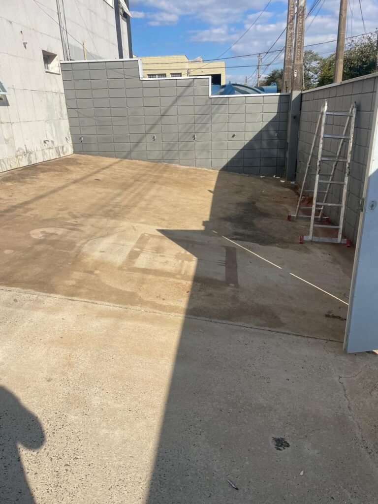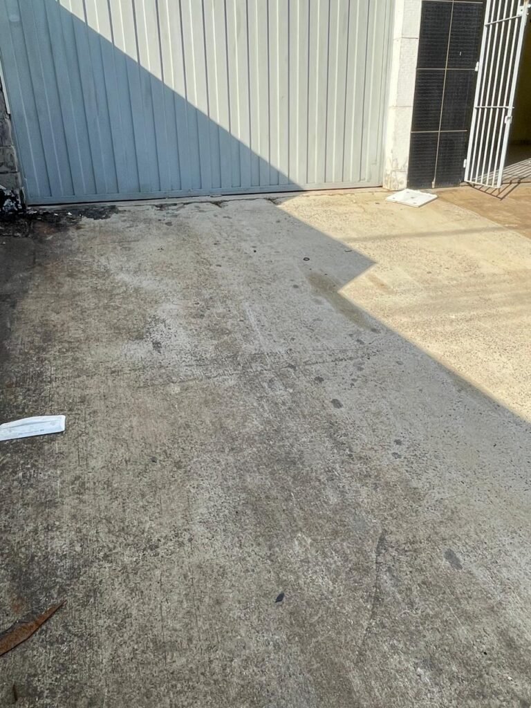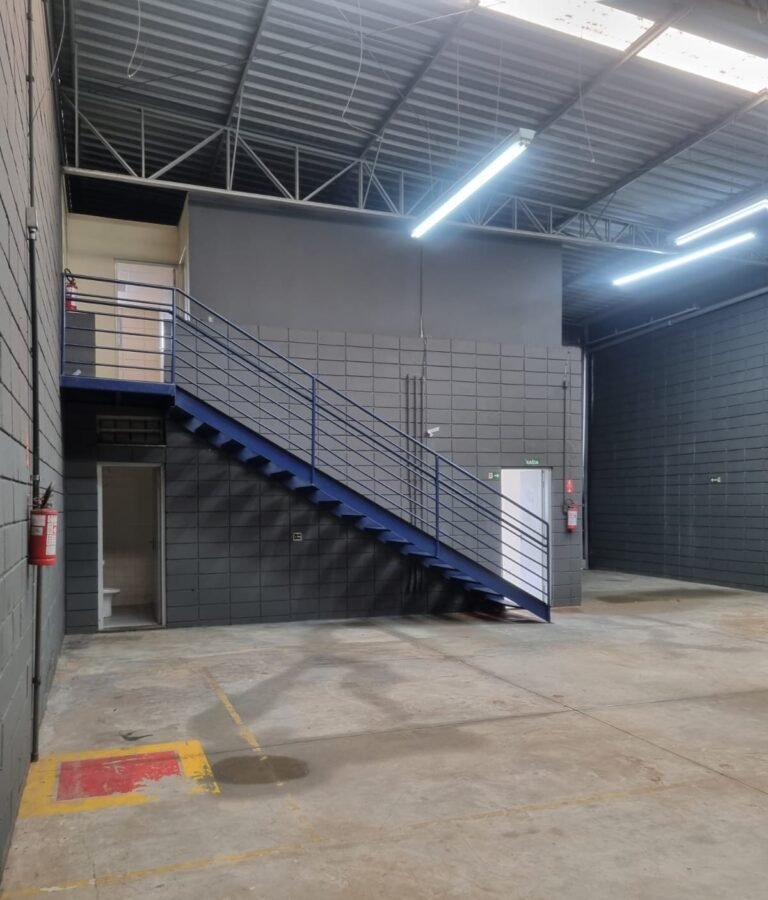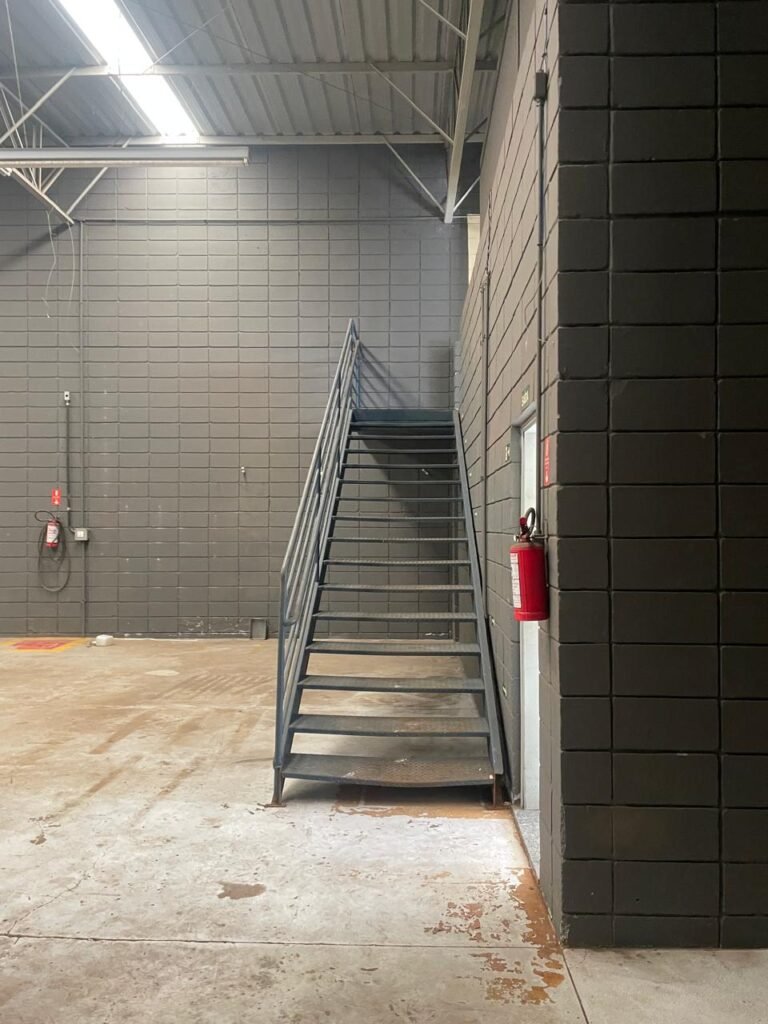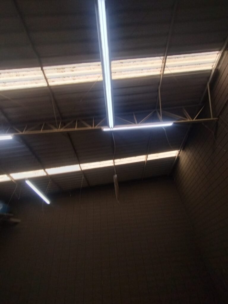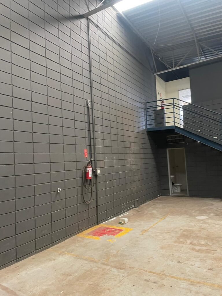 BARRACÃO-: Piso de concreto com resgates naturais, com manchas pela extensão, e com sujeira, 02 demarcações de incêndio com desgastes naturais, 01 ralo sem tampa, 04 furos no chão com parafuso, 01 portão de abrir em L, de Metalon pintura na cor cinza claro nova e em ordem, 01 fechadura ferrolho com trinco para cadeado, 02 puxadores e 01 trinco para cadeado em ordem, paredes de blocos de concreto com pintura na cor cinza nova e em ordem, 03 extintores de incêndio sendo eles: 02 de pó químico 20-B:C 4kg e 01 de água 10l 2-A com validade em ordem, 01 interruptor e 03 tomadas, apenas 02 tomadas estão com espelhos sem tampa, restante em ordem, 01 escada de ferro com partes amassadas, pintura na cor azul escuro com desgastes naturais, guarda corpo e corrimão em ordem, 07 luminárias duplas pendentes, ambas com 02 lâmpadas tubulares florescentes, apenas 10 lâmpadas estão em ordem, 01 caixa d’água marca Acqualimp 1000l em ordem.
