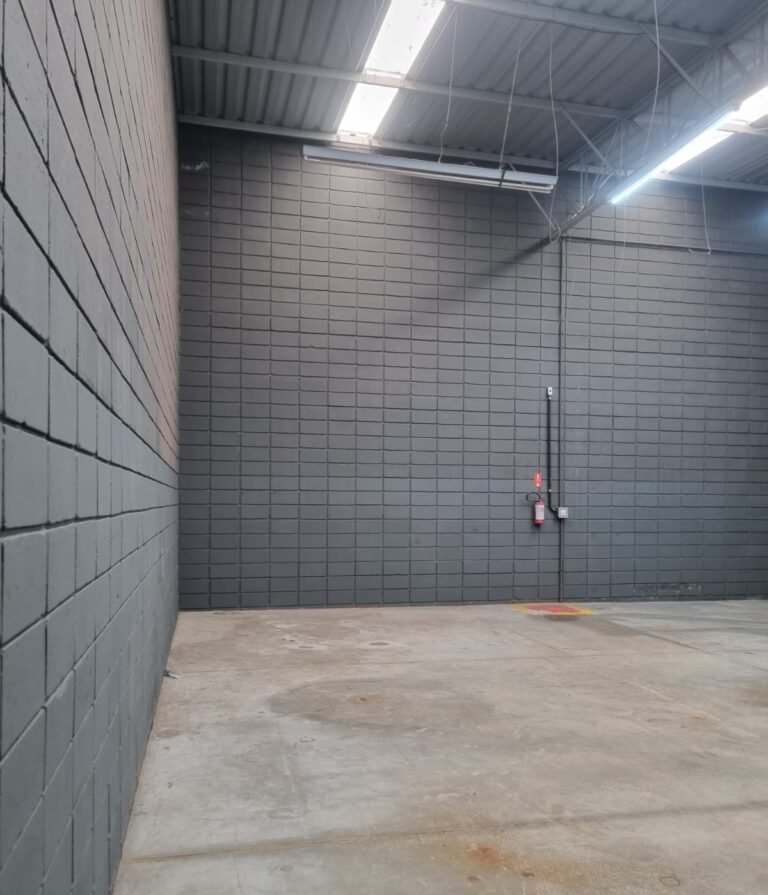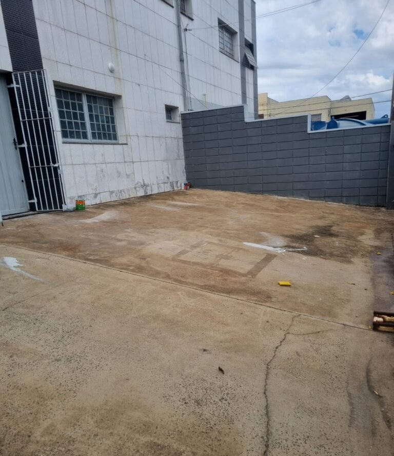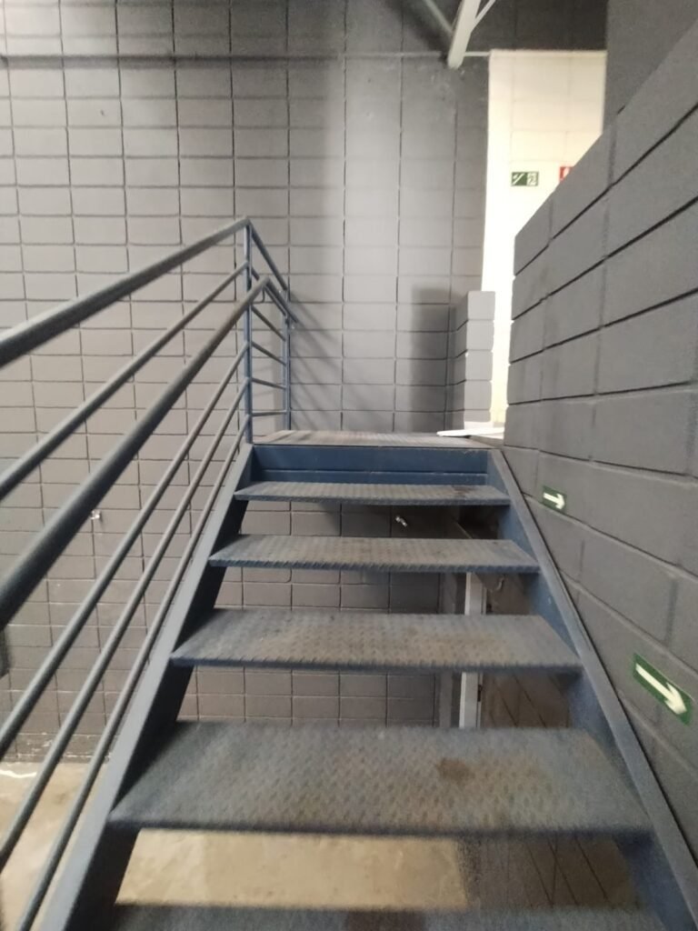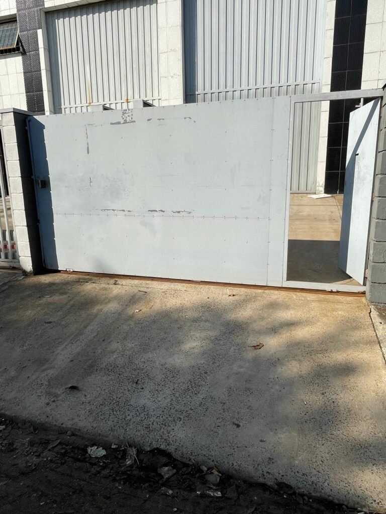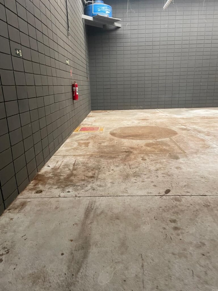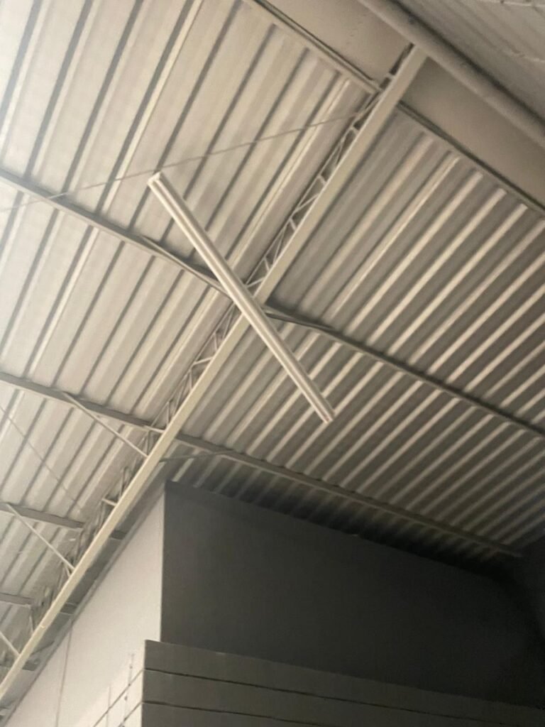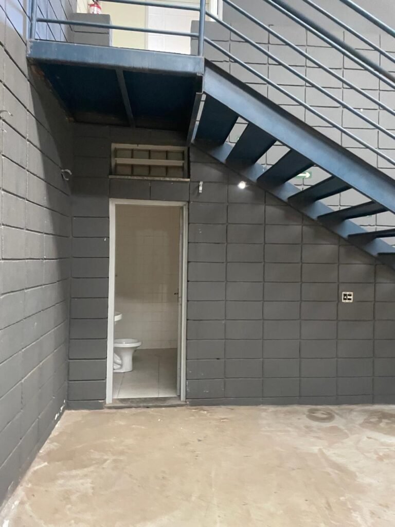 BARRACÃO-: Piso de concreto com resgates naturais, com manchas pela extensão, e com sujeira, 02 demarcações de incêndio com desgastes naturais, 01 ralo sem tampa, 04 furos no chão com parafuso, 01 portão de abrir em L, de Metalon pintura na cor cinza claro nova e em ordem, 01 fechadura ferrolho com trinco para cadeado, 02 puxadores e 01 trinco para cadeado em ordem, paredes de blocos de concreto com pintura na cor cinza nova e em ordem, 03 extintores de incêndio sendo eles: 02 de pó químico 20-B:C 4kg e 01 de água 10l 2-A com validade em ordem, 01 interruptor e 03 tomadas, apenas 02 tomadas estão com espelhos sem tampa, restante em ordem, 01 escada de ferro com partes amassadas, pintura na cor azul escuro com desgastes naturais, guarda corpo e corrimão em ordem, 07 luminárias duplas pendentes, ambas com 02 lâmpadas tubulares florescentes, apenas 10 lâmpadas estão em ordem, 01 caixa d’água marca Acqualimp 1000l em ordem.