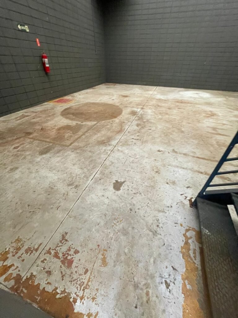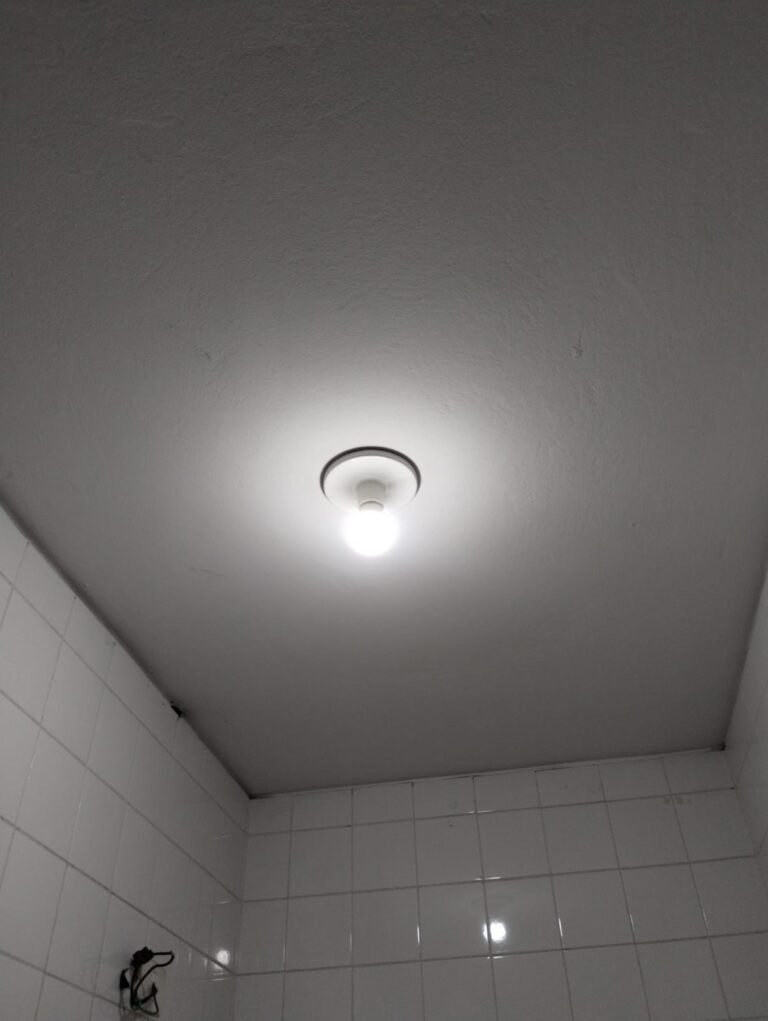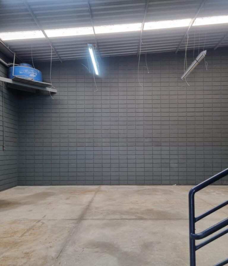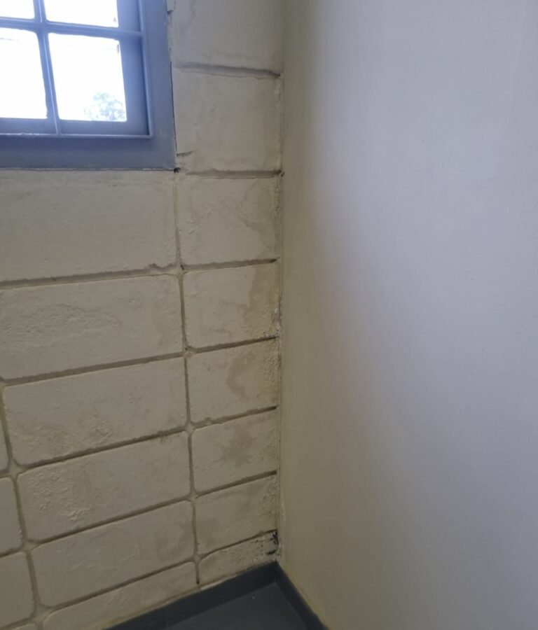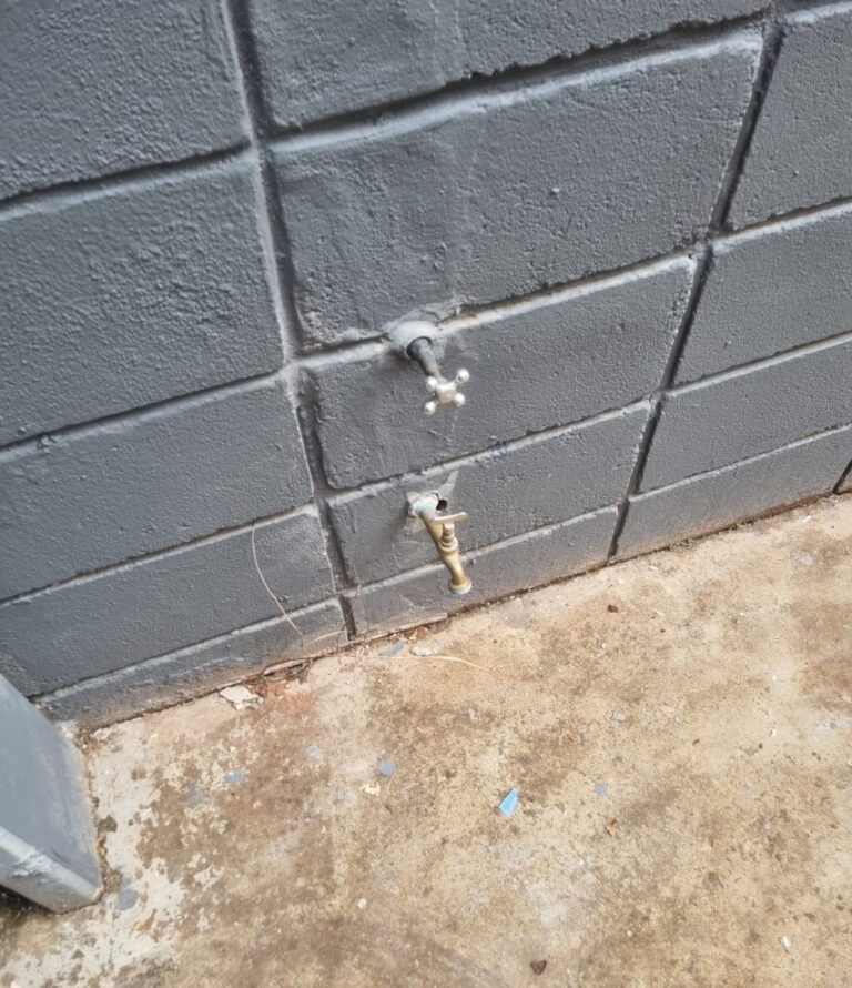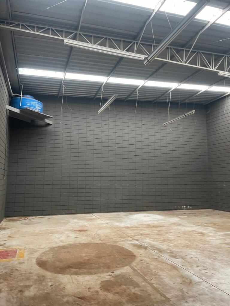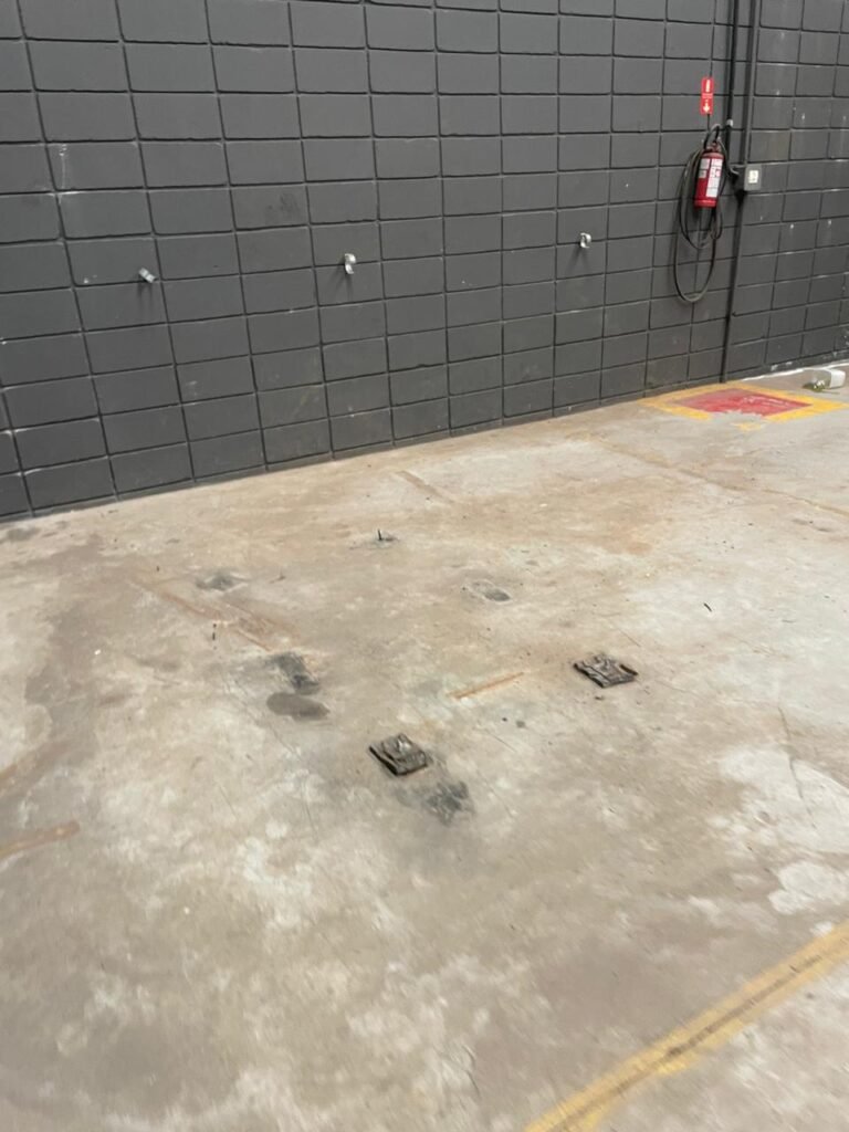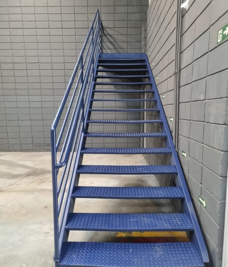 BARRACÃO-: Piso de concreto com resgates naturais, com manchas pela extensão, e com sujeira, 02 demarcações de incêndio com desgastes naturais, 01 ralo sem tampa, 04 furos no chão com parafuso, 01 portão de abrir em L, de Metalon pintura na cor cinza claro nova e em ordem, 01 fechadura ferrolho com trinco para cadeado, 02 puxadores e 01 trinco para cadeado em ordem, paredes de blocos de concreto com pintura na cor cinza nova e em ordem, 03 extintores de incêndio sendo eles: 02 de pó químico 20-B:C 4kg e 01 de água 10l 2-A com validade em ordem, 01 interruptor e 03 tomadas, apenas 02 tomadas estão com espelhos sem tampa, restante em ordem, 01 escada de ferro com partes amassadas, pintura na cor azul escuro com desgastes naturais, guarda corpo e corrimão em ordem, 07 luminárias duplas pendentes, ambas com 02 lâmpadas tubulares florescentes, apenas 10 lâmpadas estão em ordem, 01 caixa d’água marca Acqualimp 1000l em ordem.