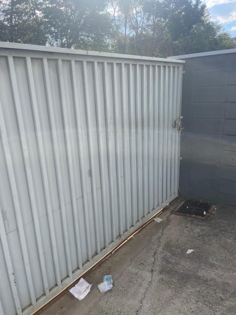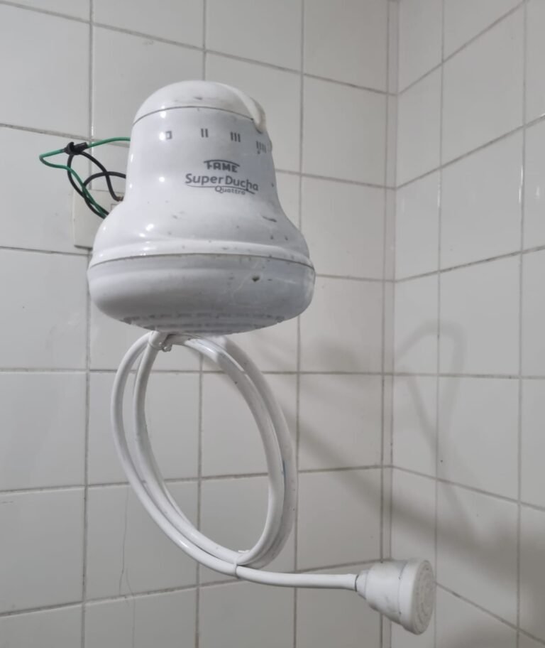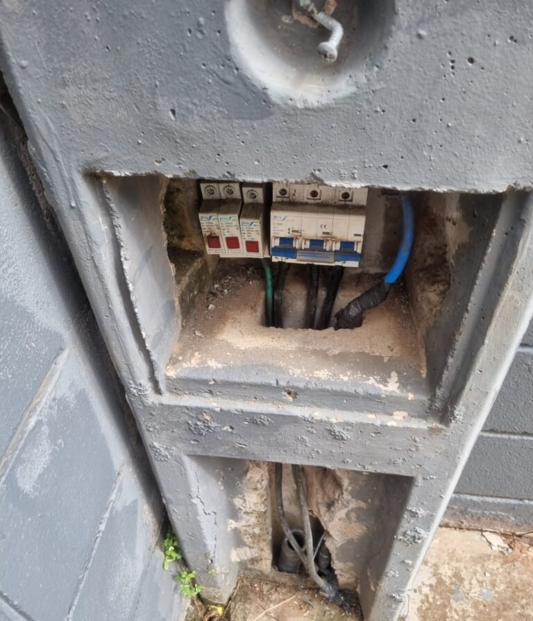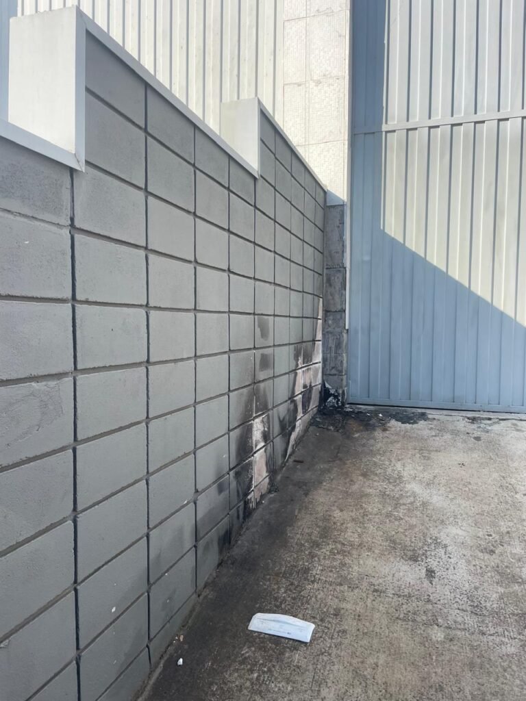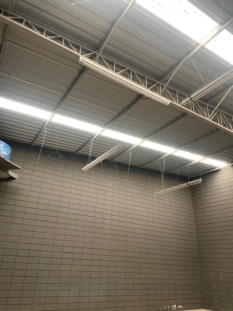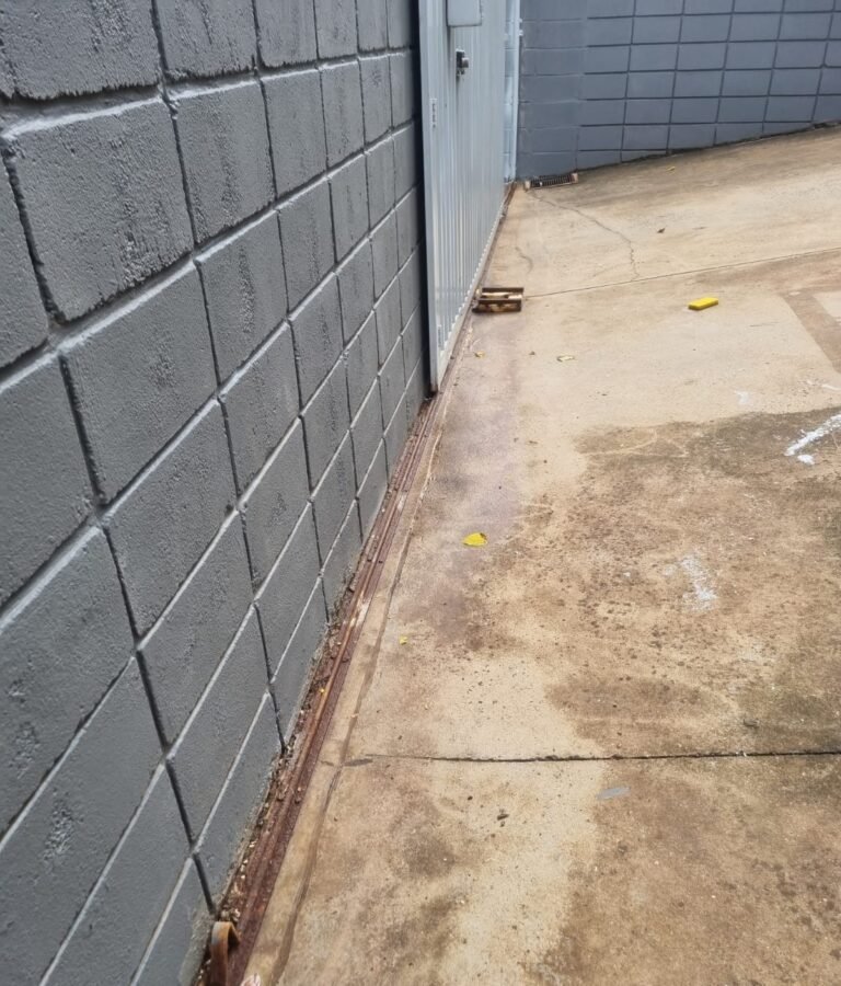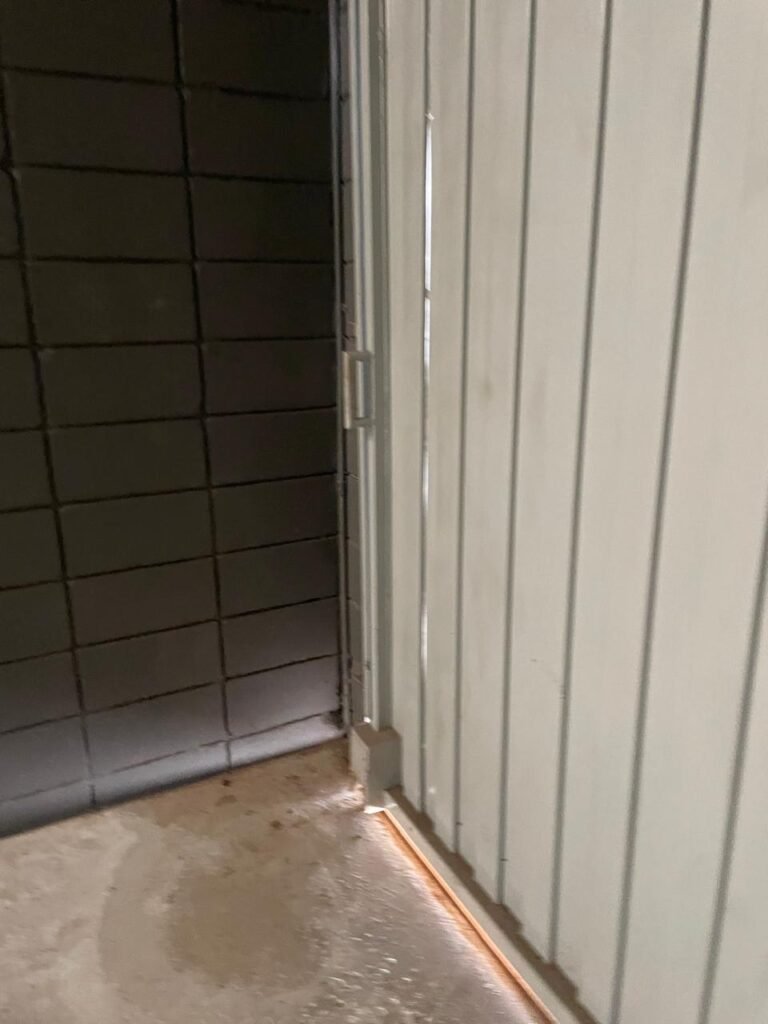 BARRACÃO-: Piso de concreto com resgates naturais, com manchas pela extensão, e com sujeira, 02 demarcações de incêndio com desgastes naturais, 01 ralo sem tampa, 04 furos no chão com parafuso, 01 portão de abrir em L, de Metalon pintura na cor cinza claro nova e em ordem, 01 fechadura ferrolho com trinco para cadeado, 02 puxadores e 01 trinco para cadeado em ordem, paredes de blocos de concreto com pintura na cor cinza nova e em ordem, 03 extintores de incêndio sendo eles: 02 de pó químico 20-B:C 4kg e 01 de água 10l 2-A com validade em ordem, 01 interruptor e 03 tomadas, apenas 02 tomadas estão com espelhos sem tampa, restante em ordem, 01 escada de ferro com partes amassadas, pintura na cor azul escuro com desgastes naturais, guarda corpo e corrimão em ordem, 07 luminárias duplas pendentes, ambas com 02 lâmpadas tubulares florescentes, apenas 10 lâmpadas estão em ordem, 01 caixa d’água marca Acqualimp 1000l em ordem.