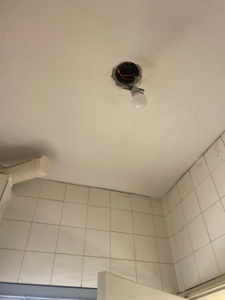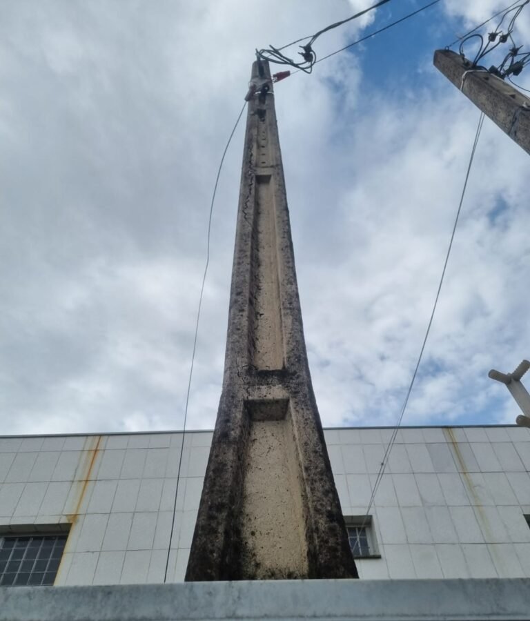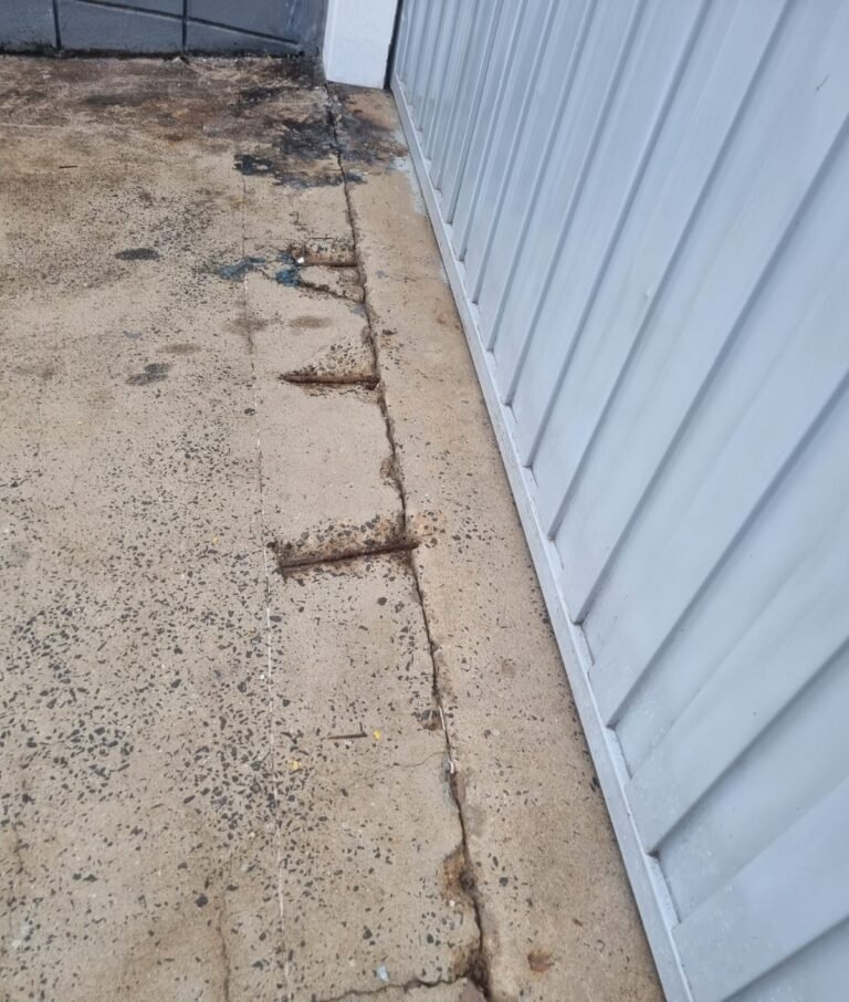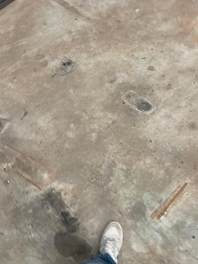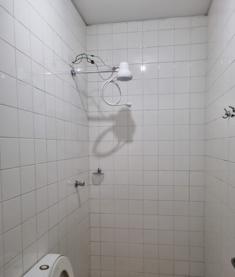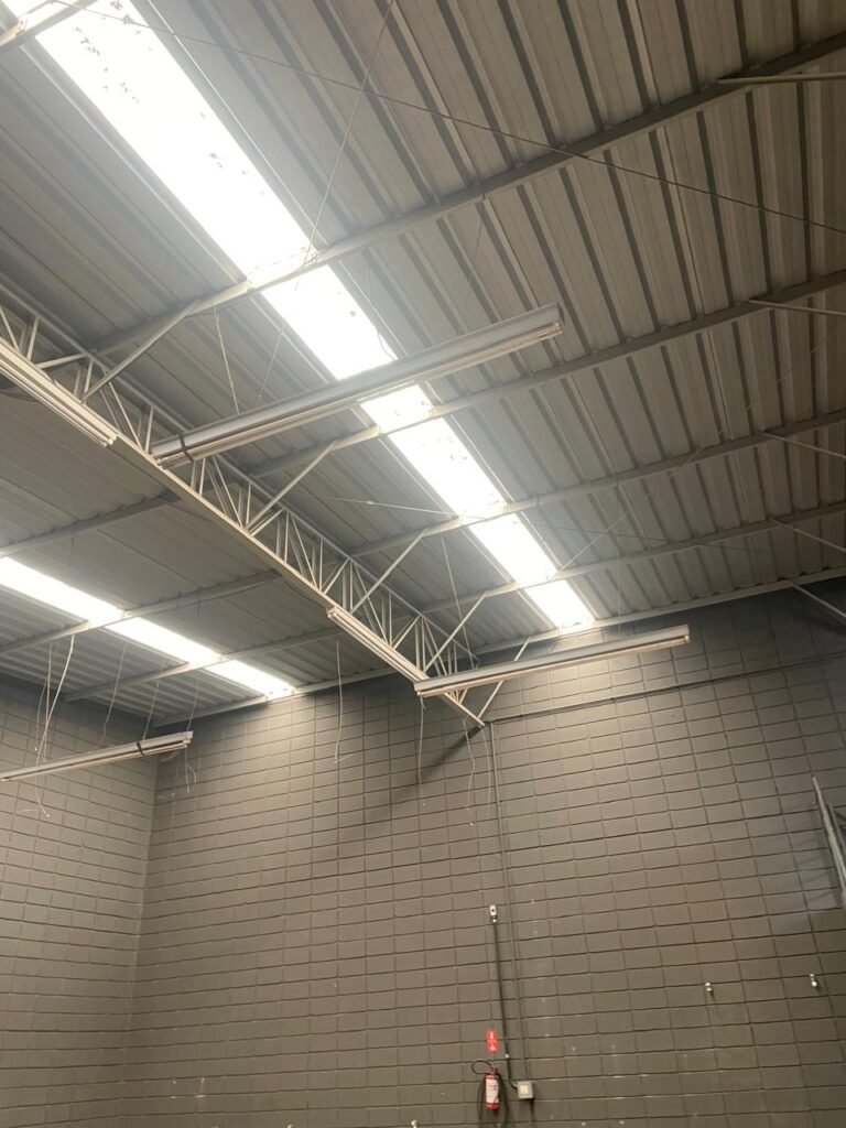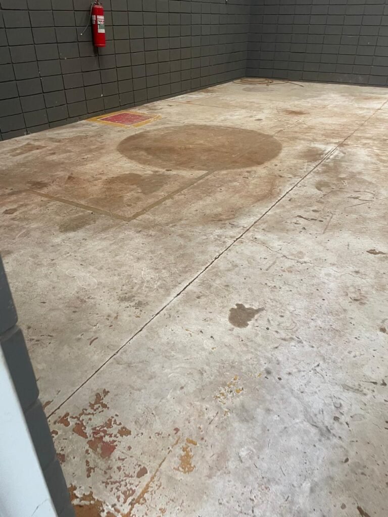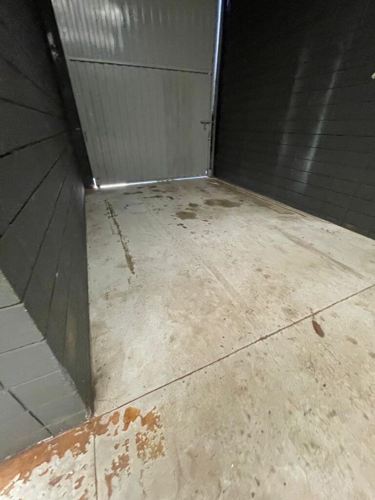 BARRACÃO-: Piso de concreto com resgates naturais, com manchas pela extensão, e com sujeira, 02 demarcações de incêndio com desgastes naturais, 01 ralo sem tampa, 04 furos no chão com parafuso, 01 portão de abrir em L, de Metalon pintura na cor cinza claro nova e em ordem, 01 fechadura ferrolho com trinco para cadeado, 02 puxadores e 01 trinco para cadeado em ordem, paredes de blocos de concreto com pintura na cor cinza nova e em ordem, 03 extintores de incêndio sendo eles: 02 de pó químico 20-B:C 4kg e 01 de água 10l 2-A com validade em ordem, 01 interruptor e 03 tomadas, apenas 02 tomadas estão com espelhos sem tampa, restante em ordem, 01 escada de ferro com partes amassadas, pintura na cor azul escuro com desgastes naturais, guarda corpo e corrimão em ordem, 07 luminárias duplas pendentes, ambas com 02 lâmpadas tubulares florescentes, apenas 10 lâmpadas estão em ordem, 01 caixa d’água marca Acqualimp 1000l em ordem.