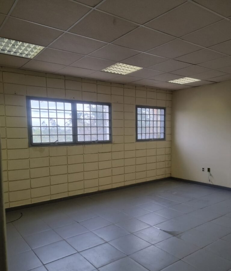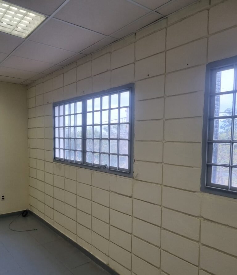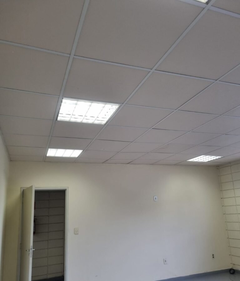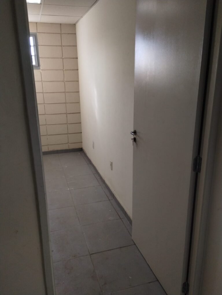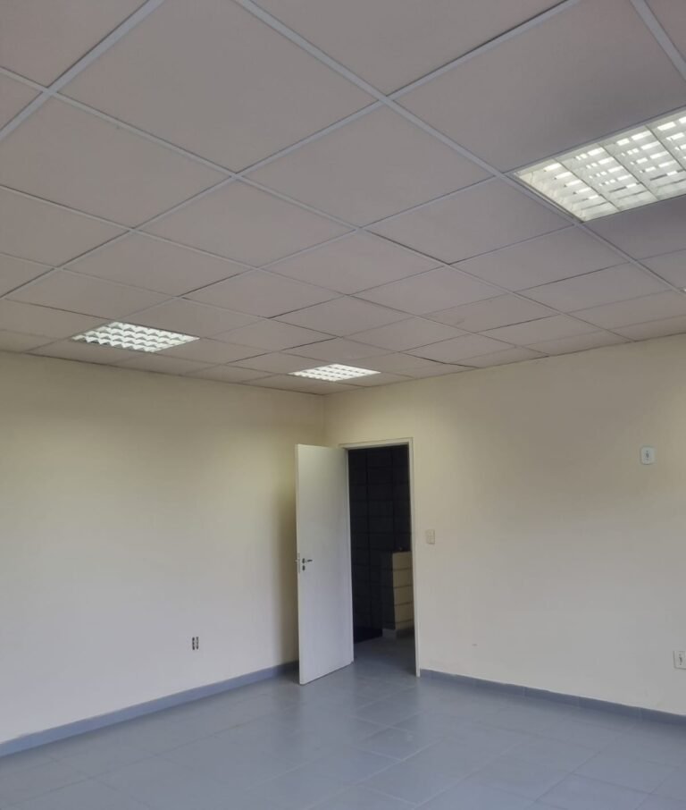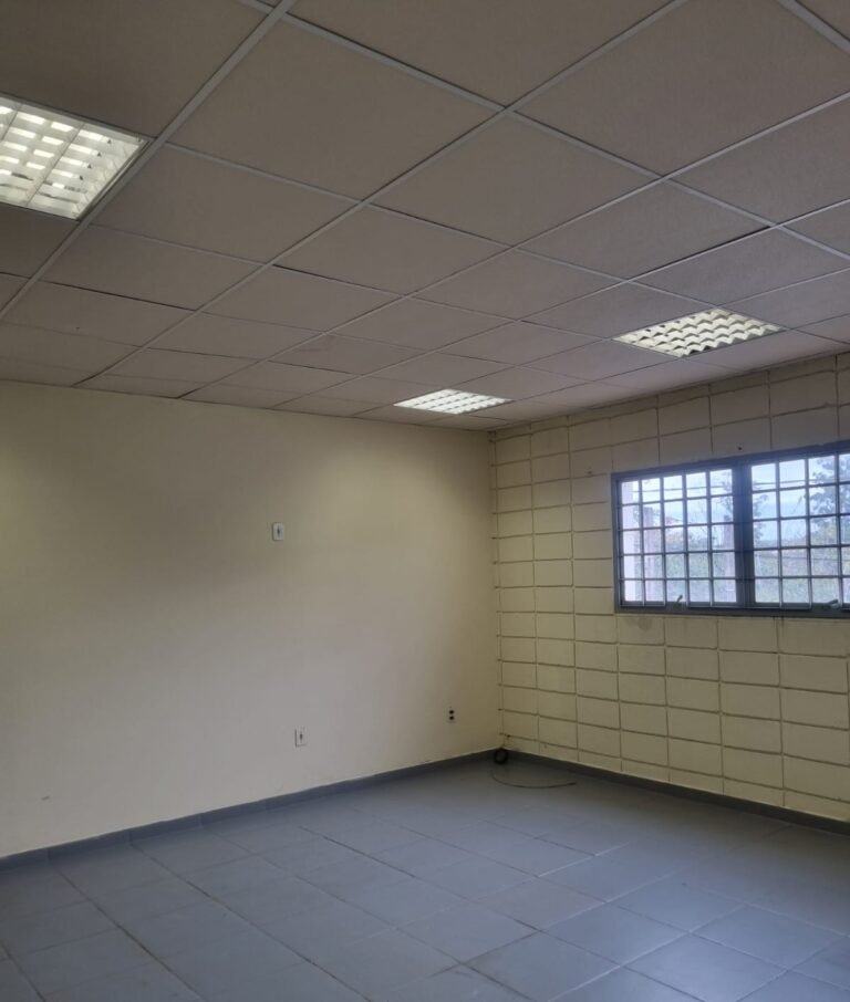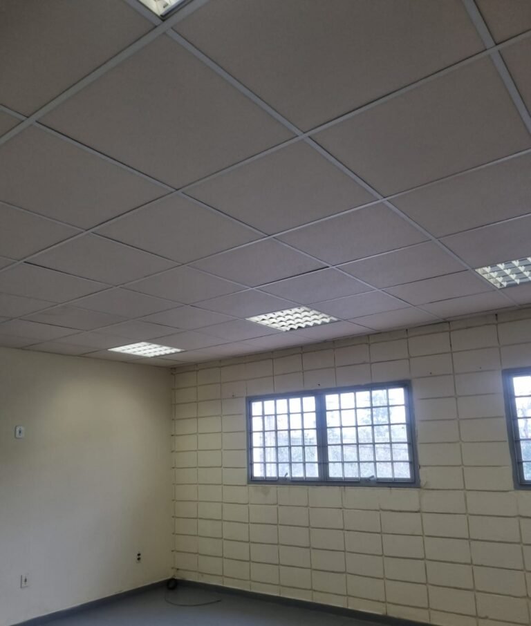 ESCRITÓRIO-: 01 Porta de madeira com pintura na cor cinza claro em ordem, com maçaneta em inox em ordem, com fechadura marca Arouca com chave em ordem, piso e rodapés revestidos de pisos frios cerâmicos com pintura na cor cinza nova e em ordem, paredes com pintura na cor palha com desgastes naturais, com manchas de infiltração pela extensão e restante em ordem, 05 tomadas 02 interruptores, 03 entrada para fio de dados, 01 instalação com fiação aparente, de 09 espelhos de luz apenas 04 estão sem tampa, 03 vitrôs basculantes com esquadrias de ferro com pintura na cor cinza com desgastes naturais, com fechaduras em ordem, com gradil de ferro de proteção em ordem, com 25 vidros lisos em cada, 01 vidro está danificado, teto com forro de isopor térmico com partes faltando, 05 luminárias com 04 lâmpadas fluorescentes tubulares todas em ordem.