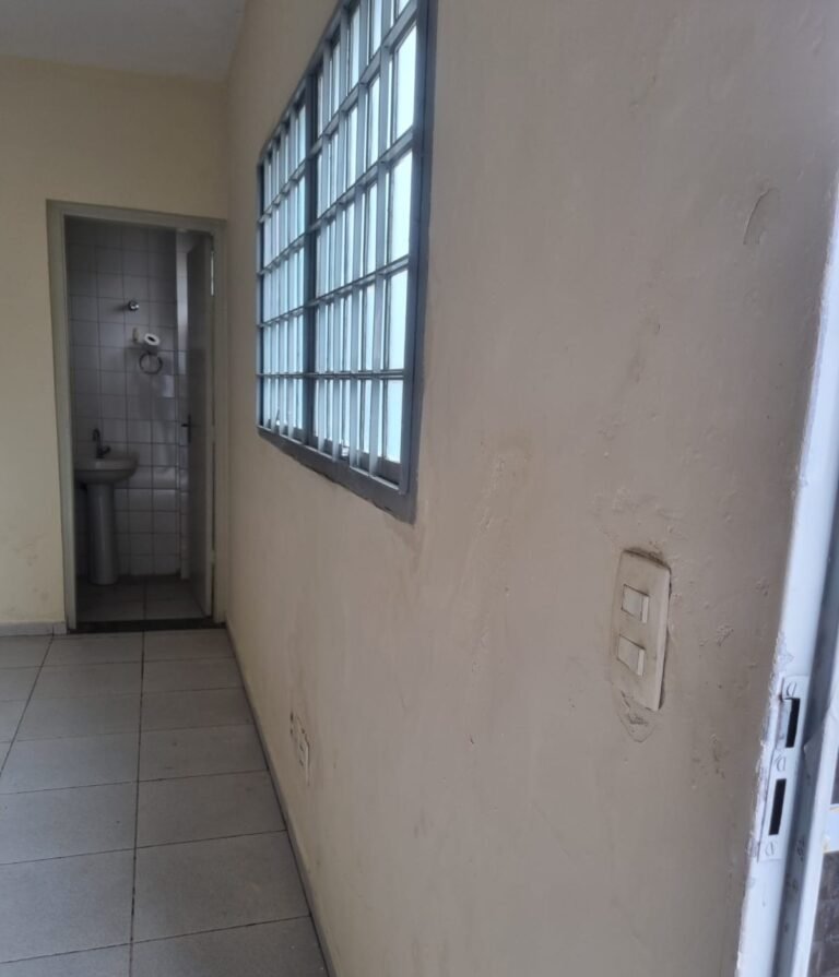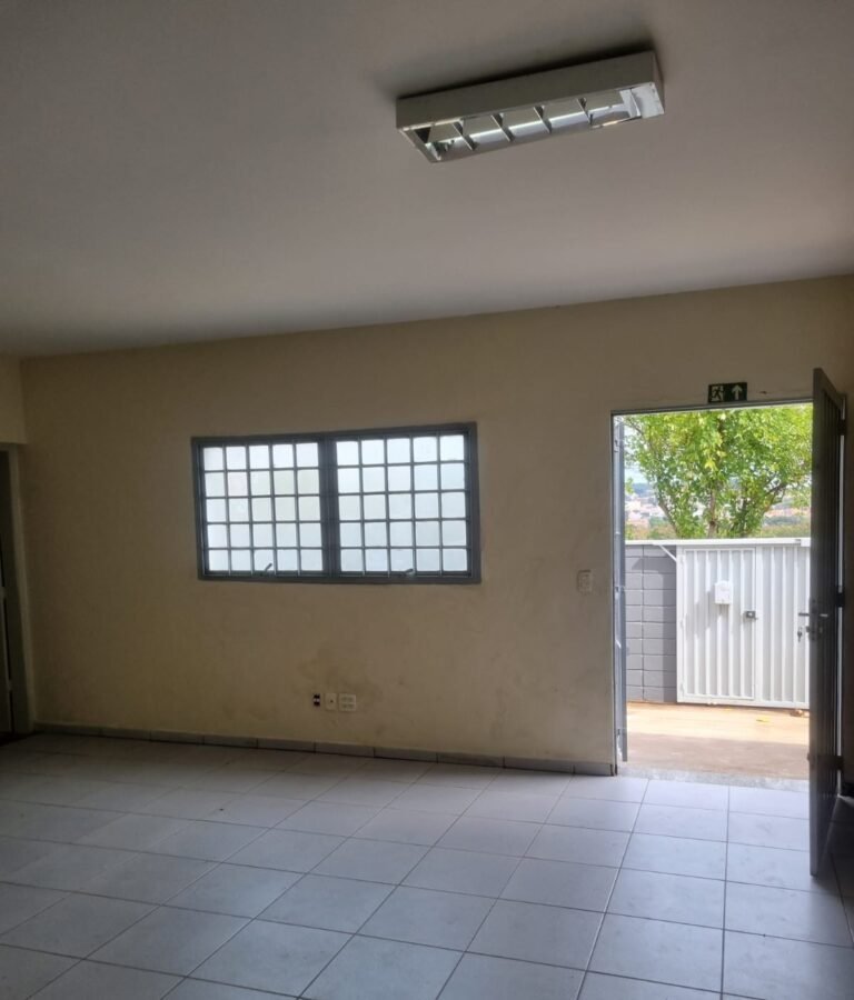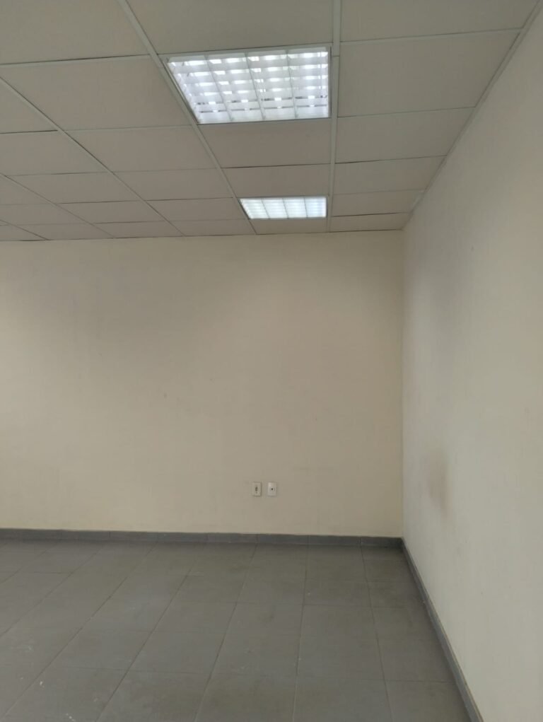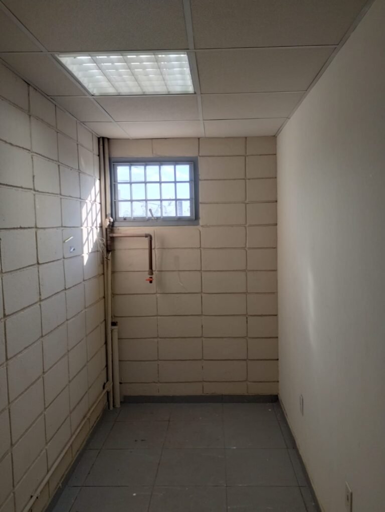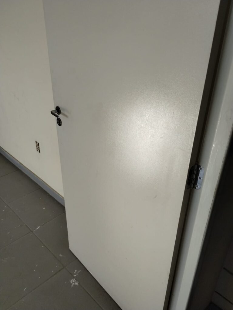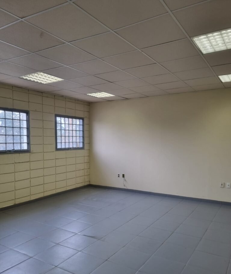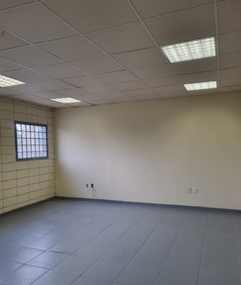 ESCRITÓRIO-: 01 Porta de madeira com pintura na cor cinza claro em ordem, com maçaneta em inox em ordem, com fechadura marca Arouca com chave em ordem, piso e rodapés revestidos de pisos frios cerâmicos com pintura na cor cinza nova e em ordem, paredes com pintura na cor palha com desgastes naturais, com manchas de infiltração pela extensão e restante em ordem, 05 tomadas 02 interruptores, 03 entrada para fio de dados, 01 instalação com fiação aparente, de 09 espelhos de luz apenas 04 estão sem tampa, 03 vitrôs basculantes com esquadrias de ferro com pintura na cor cinza com desgastes naturais, com fechaduras em ordem, com gradil de ferro de proteção em ordem, com 25 vidros lisos em cada, 01 vidro está danificado, teto com forro de isopor térmico com partes faltando, 05 luminárias com 04 lâmpadas fluorescentes tubulares todas em ordem.