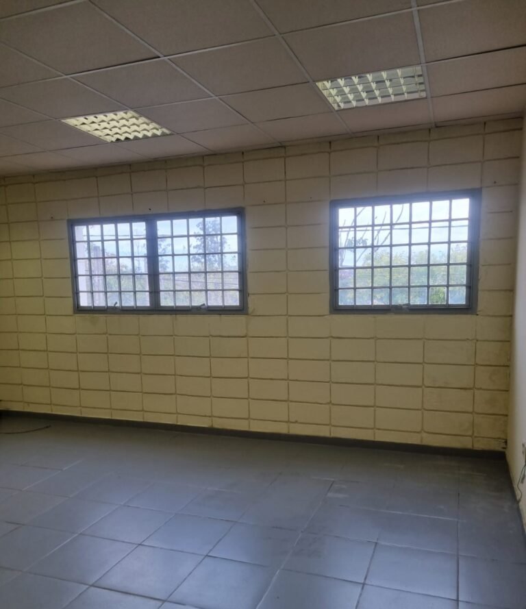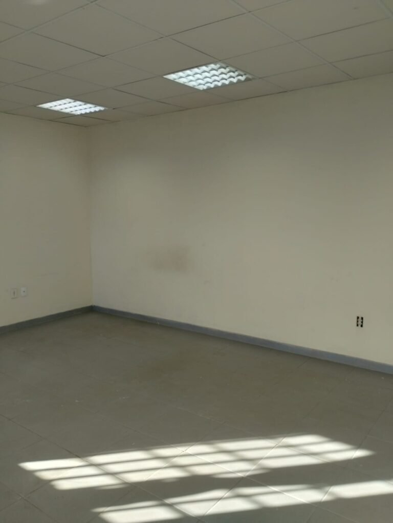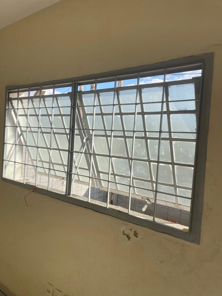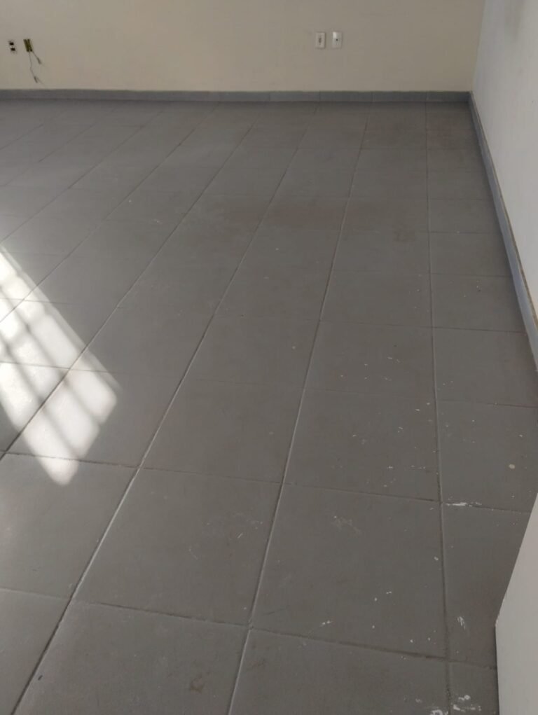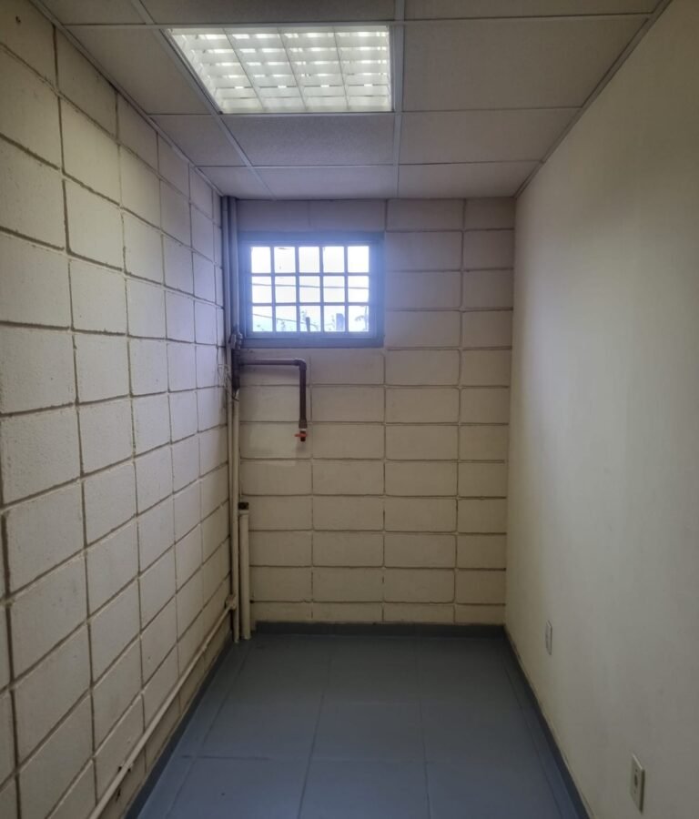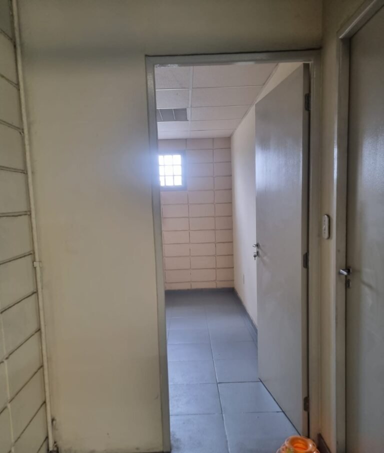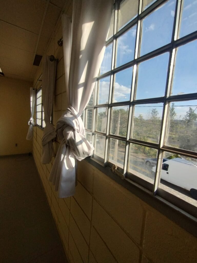 ESCRITÓRIO-: 01 Porta de madeira com pintura na cor cinza claro em ordem, com maçaneta em inox em ordem, com fechadura marca Arouca com chave em ordem, piso e rodapés revestidos de pisos frios cerâmicos com pintura na cor cinza nova e em ordem, paredes com pintura na cor palha com desgastes naturais, com manchas de infiltração pela extensão e restante em ordem, 05 tomadas 02 interruptores, 03 entrada para fio de dados, 01 instalação com fiação aparente, de 09 espelhos de luz apenas 04 estão sem tampa, 03 vitrôs basculantes com esquadrias de ferro com pintura na cor cinza com desgastes naturais, com fechaduras em ordem, com gradil de ferro de proteção em ordem, com 25 vidros lisos em cada, 01 vidro está danificado, teto com forro de isopor térmico com partes faltando, 05 luminárias com 04 lâmpadas fluorescentes tubulares todas em ordem.