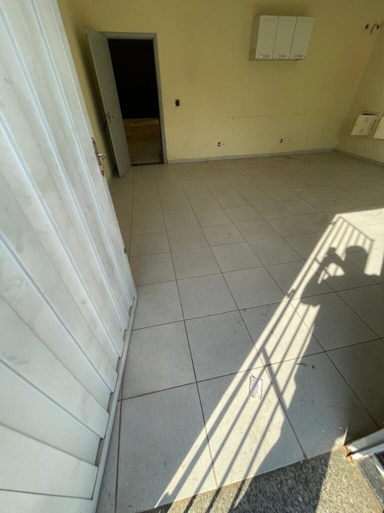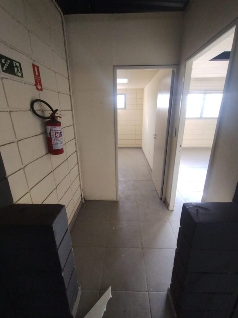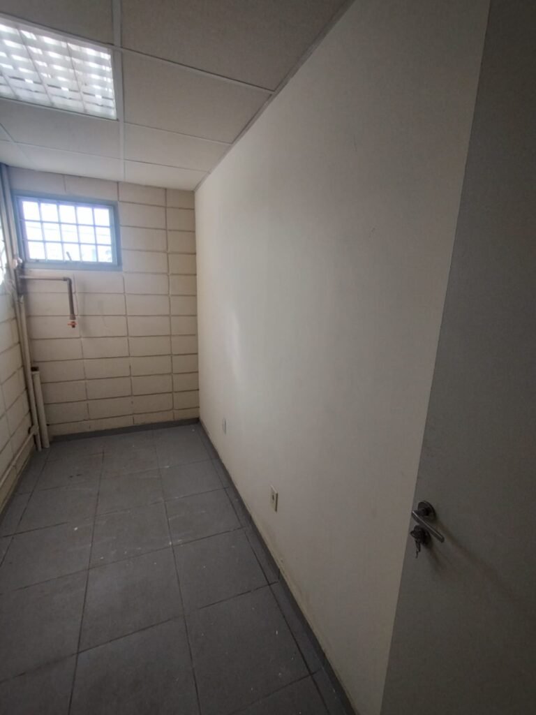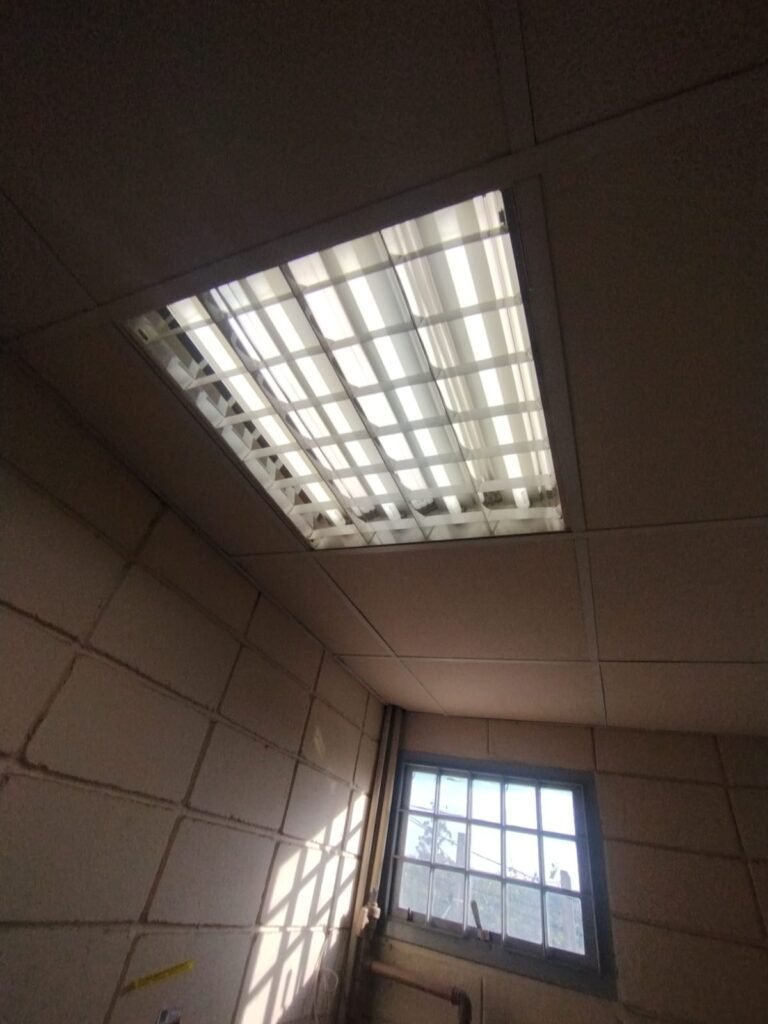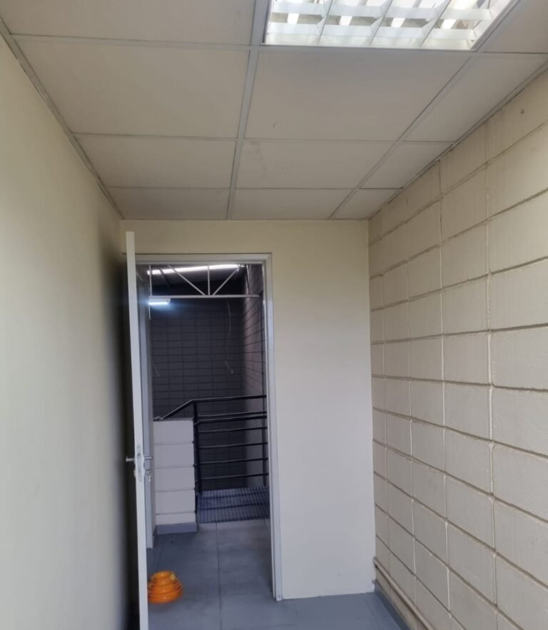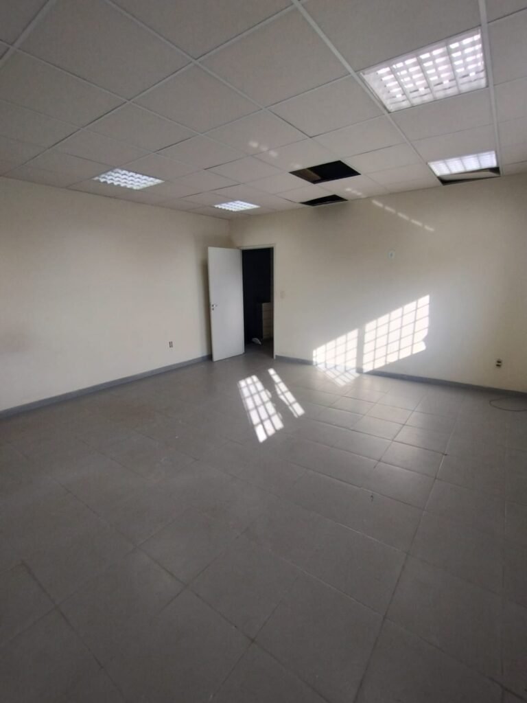 ESCRITÓRIO-: 01 Porta de madeira com pintura na cor cinza claro em ordem, com maçaneta em inox em ordem, com fechadura marca Arouca com chave em ordem, piso e rodapés revestidos de pisos frios cerâmicos com pintura na cor cinza nova e em ordem, paredes com pintura na cor palha com desgastes naturais, com manchas de infiltração pela extensão e restante em ordem, 05 tomadas 02 interruptores, 03 entrada para fio de dados, 01 instalação com fiação aparente, de 09 espelhos de luz apenas 04 estão sem tampa, 03 vitrôs basculantes com esquadrias de ferro com pintura na cor cinza com desgastes naturais, com fechaduras em ordem, com gradil de ferro de proteção em ordem, com 25 vidros lisos em cada, 01 vidro está danificado, teto com forro de isopor térmico com partes faltando, 05 luminárias com 04 lâmpadas fluorescentes tubulares todas em ordem.