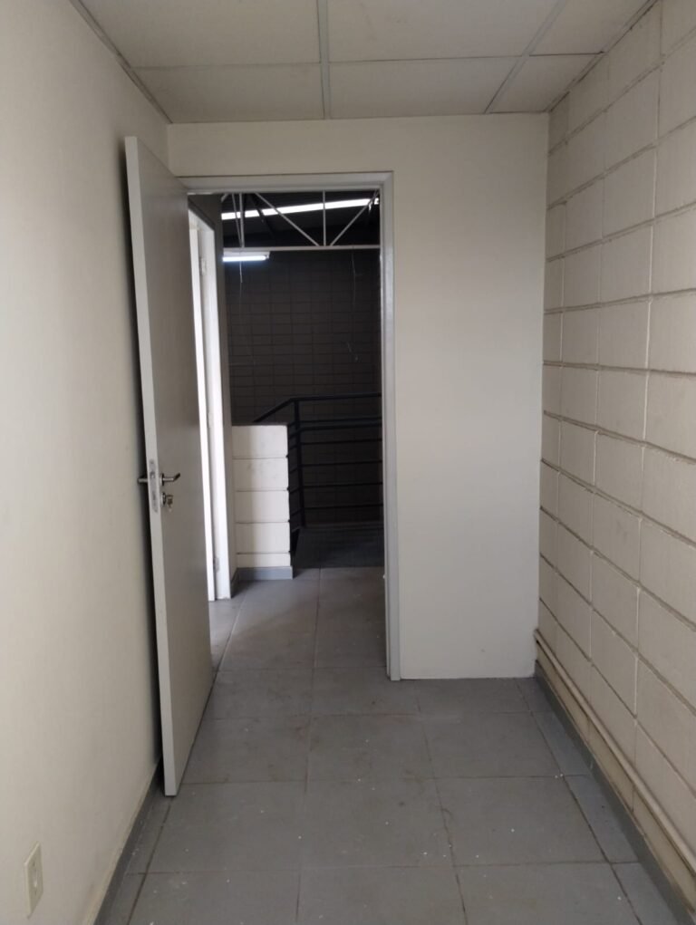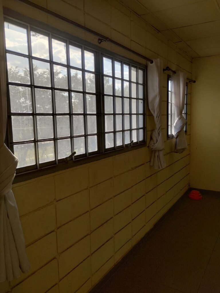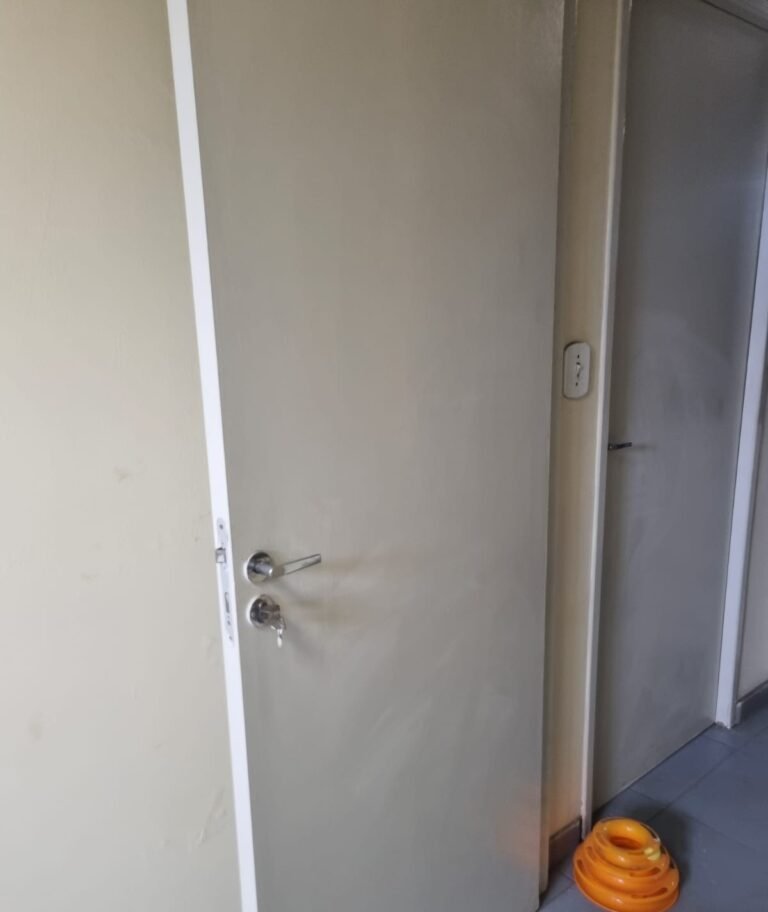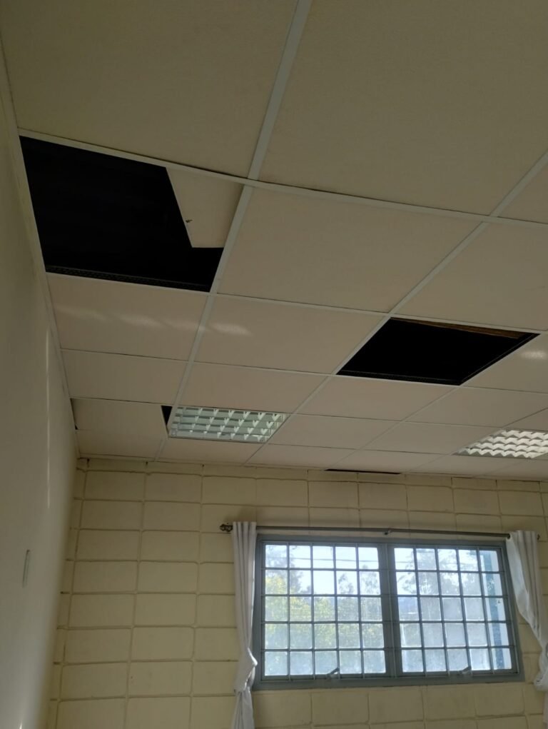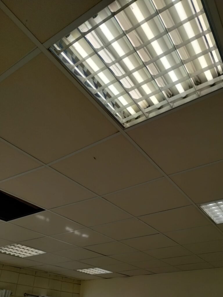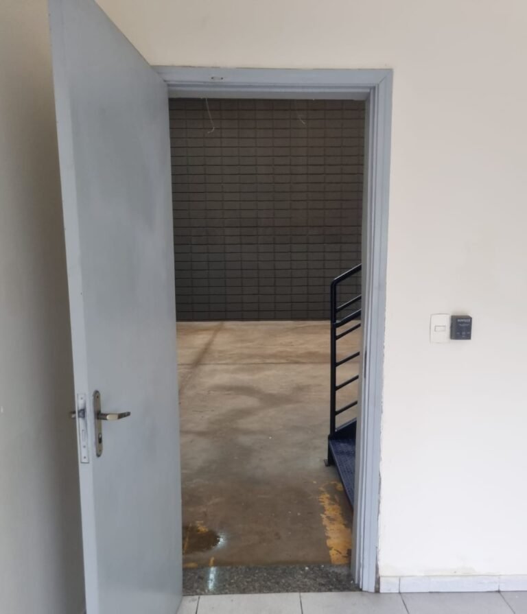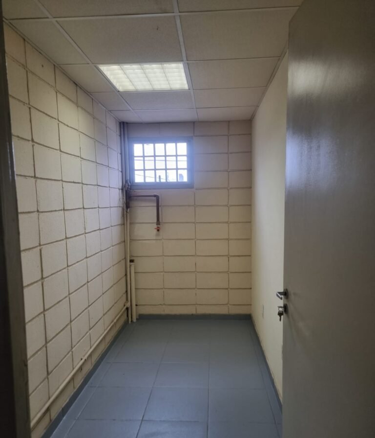 ESCRITÓRIO-: 01 Porta de madeira com pintura na cor cinza claro em ordem, com maçaneta em inox em ordem, com fechadura marca Arouca com chave em ordem, piso e rodapés revestidos de pisos frios cerâmicos com pintura na cor cinza nova e em ordem, paredes com pintura na cor palha com desgastes naturais, com manchas de infiltração pela extensão e restante em ordem, 05 tomadas 02 interruptores, 03 entrada para fio de dados, 01 instalação com fiação aparente, de 09 espelhos de luz apenas 04 estão sem tampa, 03 vitrôs basculantes com esquadrias de ferro com pintura na cor cinza com desgastes naturais, com fechaduras em ordem, com gradil de ferro de proteção em ordem, com 25 vidros lisos em cada, 01 vidro está danificado, teto com forro de isopor térmico com partes faltando, 05 luminárias com 04 lâmpadas fluorescentes tubulares todas em ordem.