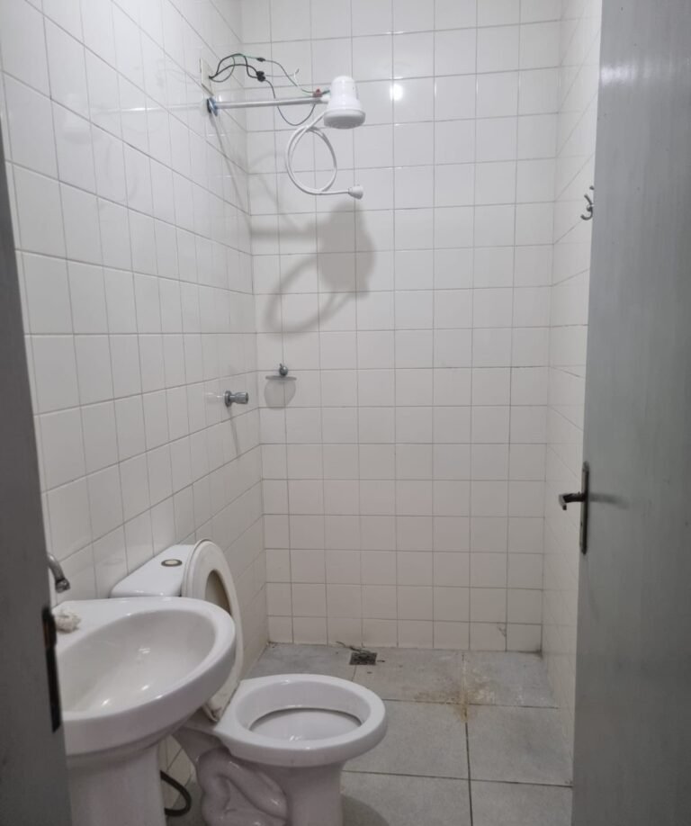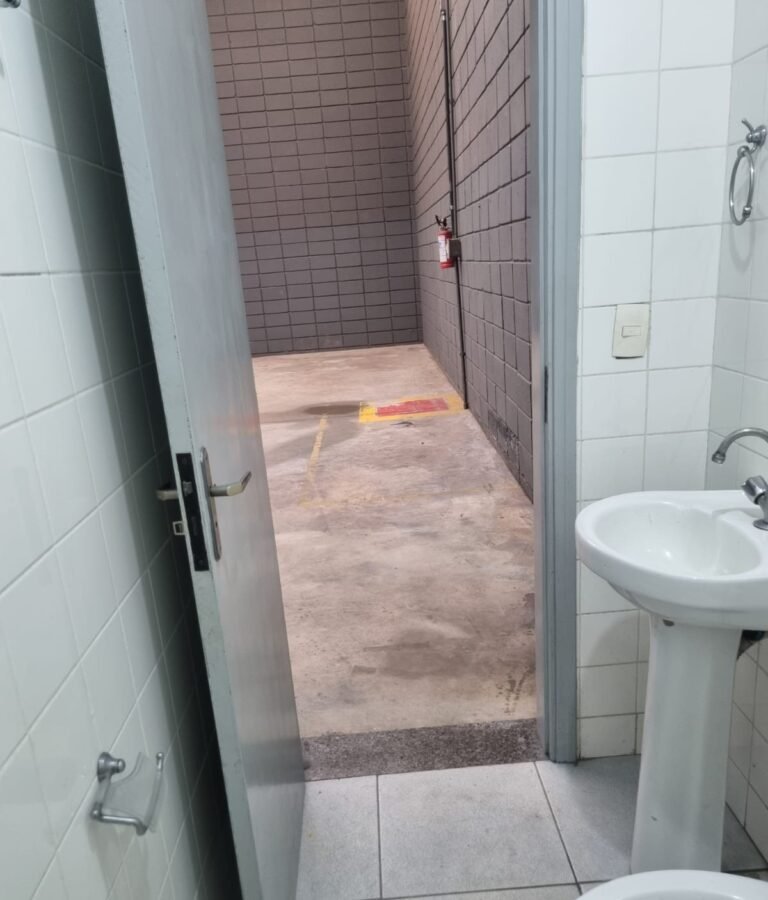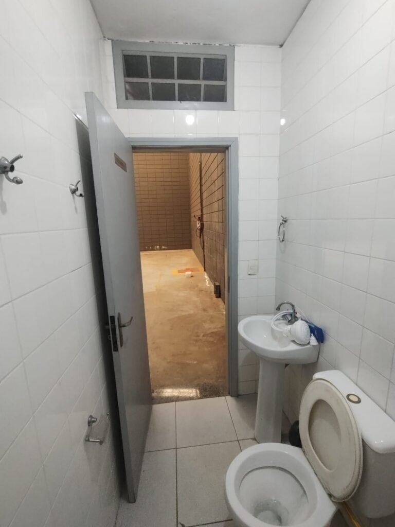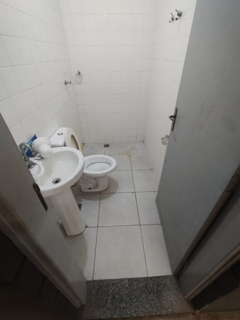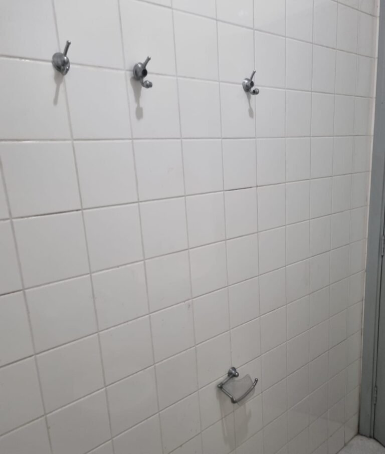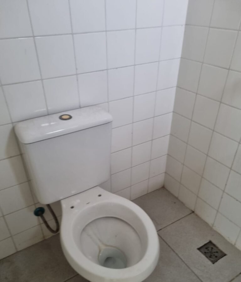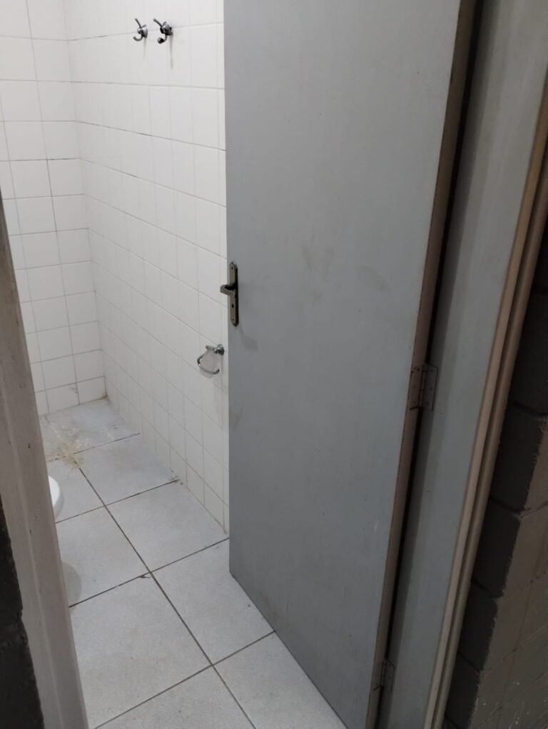 WC BARRACÃO-: 01 Porta de madeira com desgastes naturais, com pintura na cor cinza em ordem, com maçanetas em ordem, com fechadura com chave embutida em ordem, piso revestido de pisos frios cerâmico com desgastes naturais e manchas, 02 ralos em inox em ordem, paredes revestidas de azulejo até o teto, 06 suportes de auxílio de banheiro (todos com desgastes naturais e 01 danificado), 01 interruptor com espelho de luz em ordem, 01 conjunto lavatório de cerâmica cor branco, marca Locasa em ordem, 01 torneira de inox danificada e pingando, 01 conjunto sanitário de cerâmica na cor branco, marca Locasa em ordem, com tampa e acento com desgastes naturais, válvula de descarga acoplada, descarga em ordem, 01 canopla de inox, 01 vitro com esquadrias na cor cinza em ordem e com 08 folhas de acrílico em ordem, teto com pintura na cor branco neve em ordem.