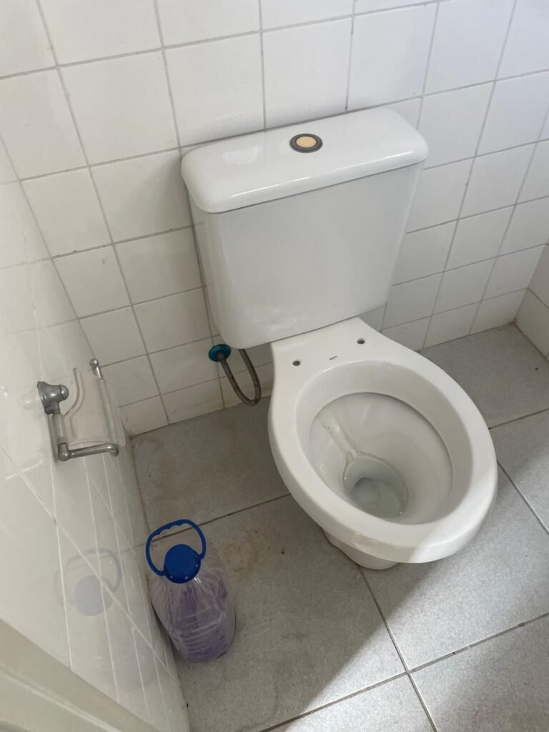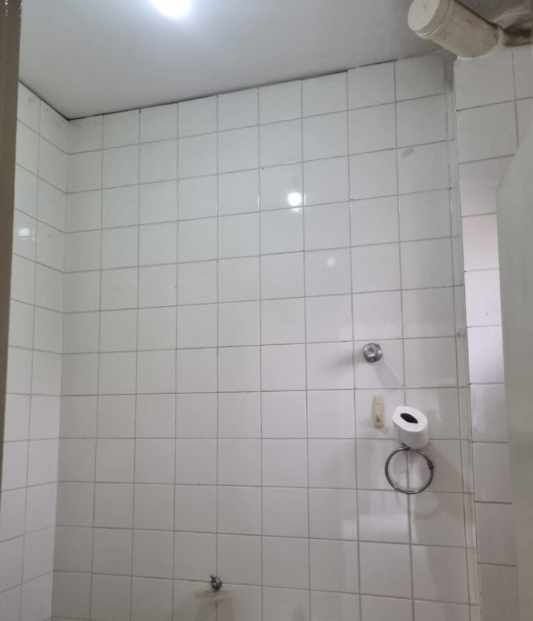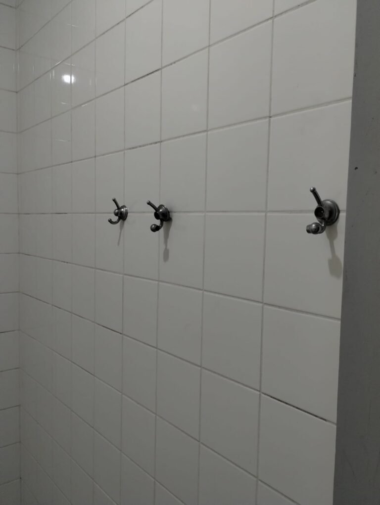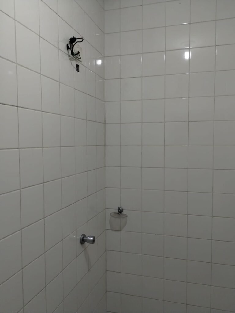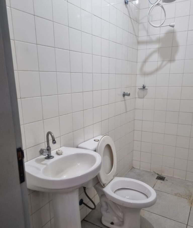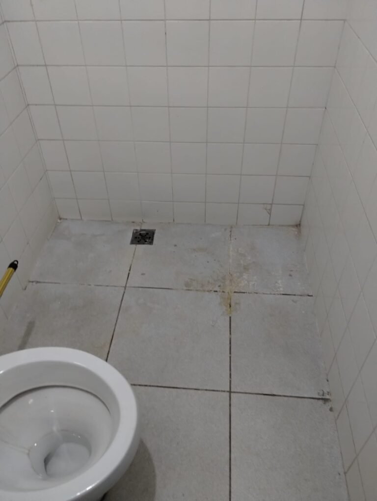 WC BARRACÃO-: 01 Porta de madeira com desgastes naturais, com pintura na cor cinza em ordem, com maçanetas em ordem, com fechadura com chave embutida em ordem, piso revestido de pisos frios cerâmico com desgastes naturais e manchas, 02 ralos em inox em ordem, paredes revestidas de azulejo até o teto, 06 suportes de auxílio de banheiro (todos com desgastes naturais e 01 danificado), 01 interruptor com espelho de luz em ordem, 01 conjunto lavatório de cerâmica cor branco, marca Locasa em ordem, 01 torneira de inox danificada e pingando, 01 conjunto sanitário de cerâmica na cor branco, marca Locasa em ordem, com tampa e acento com desgastes naturais, válvula de descarga acoplada, descarga em ordem, 01 canopla de inox, 01 vitro com esquadrias na cor cinza em ordem e com 08 folhas de acrílico em ordem, teto com pintura na cor branco neve em ordem.