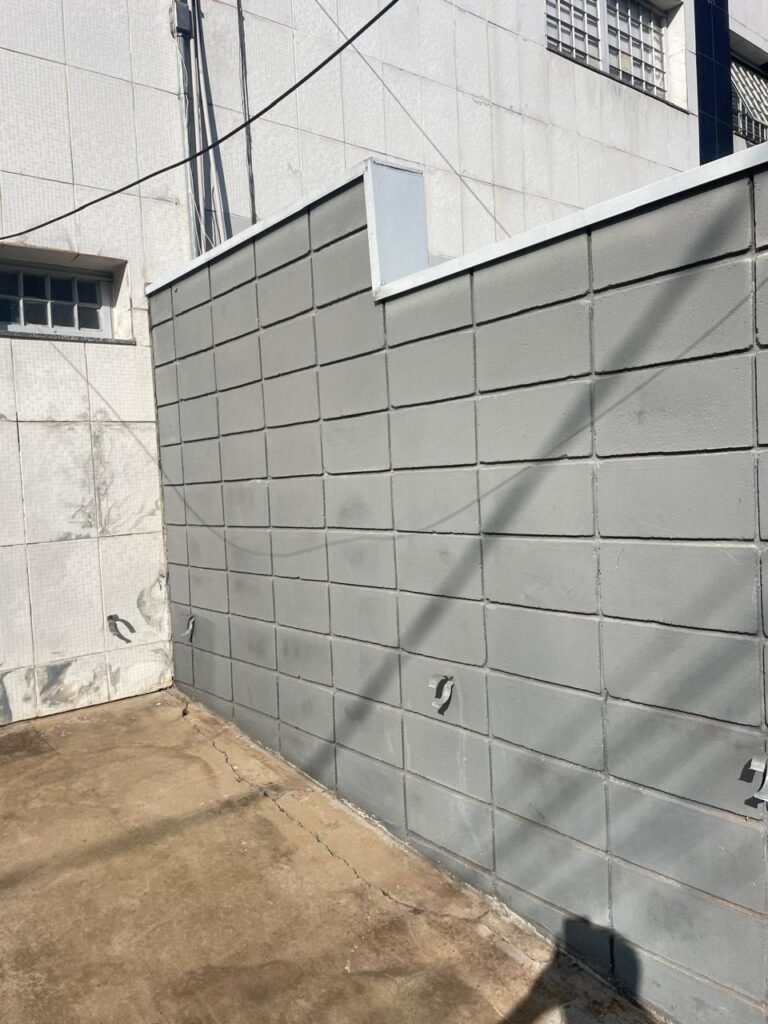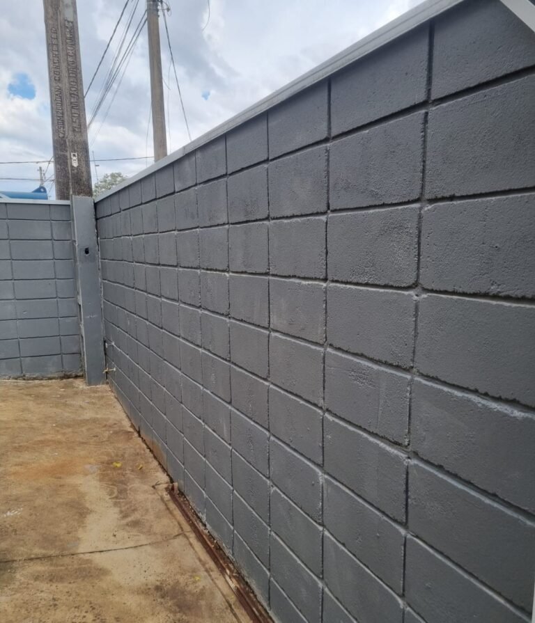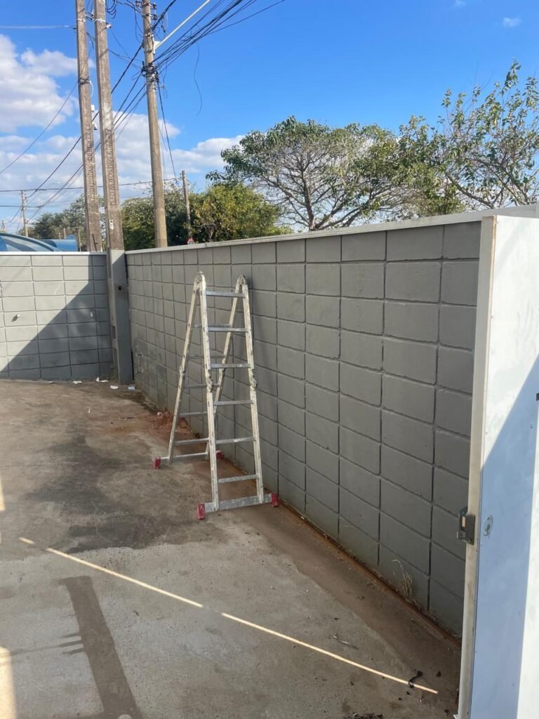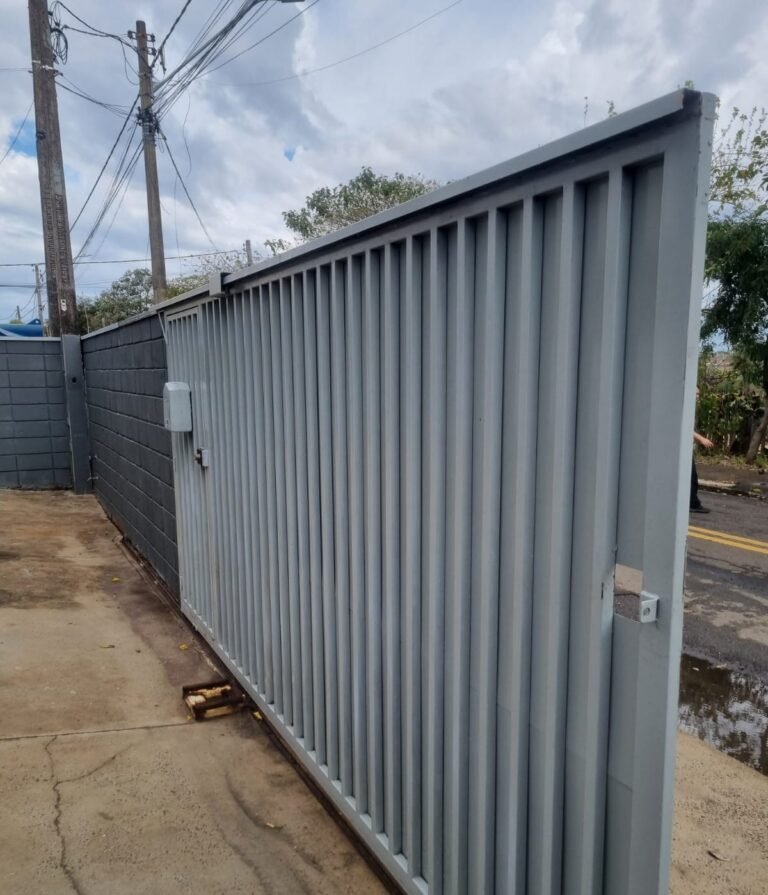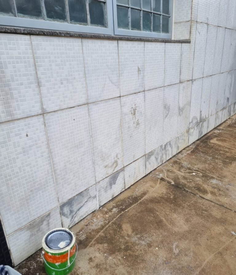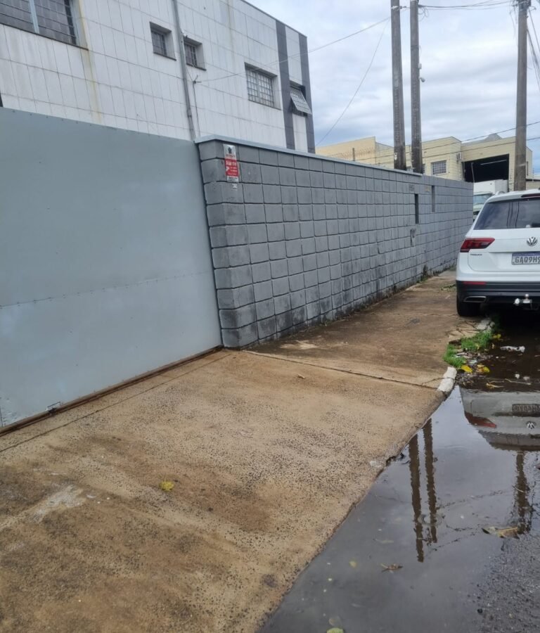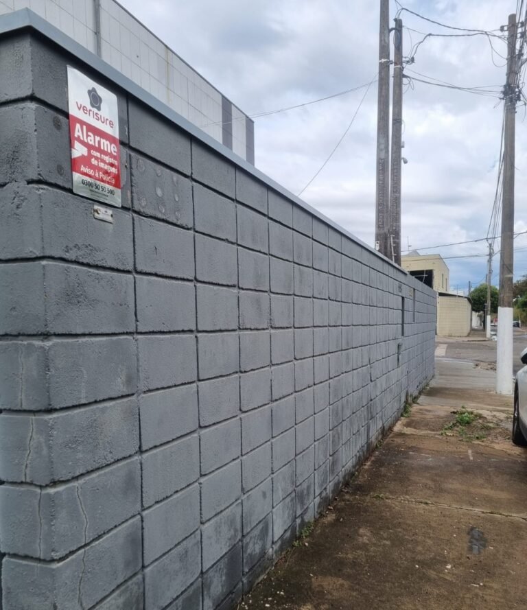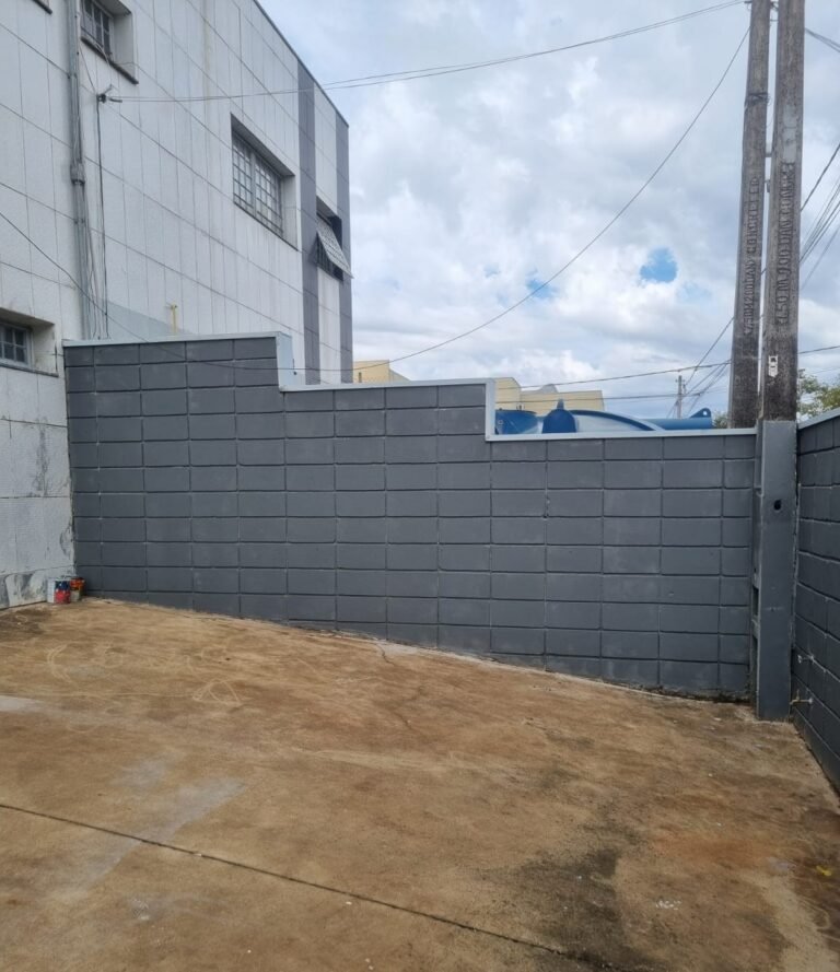 FACHADA-: Calçada de concreto desempenado com desgastes naturais, partes danificadas e trincas, muro em blocos de concreto com pintura nova na cor cinza, dígitos de ferro com pintura na cor cinza “1-5-9-6”, rufus com pintura na cor cinza com desgastes naturais, portão deslizante em gradil e chapas de ferro com pintura na cor cinza claro com desgastes naturais, descasques e pigmentos de ferrugem, portão possui 01 trinco com 01 cadeado Pado com 02 Chaves em ordem, 01 porta social, com 01 fechadura Start em ordem e com chave, 01 caixa de correspondência com trinco para cadeado em ordem, piso de concreto desempenado com desgastes naturais, manchas pela extensão e trincados pela extensão, 01 ralo grelha de ferro em ordem, muros laterais em blocos de concreto com pintura na cor cinza com desgastes naturais, paredes do barracão revestidas de pastilhas de cerâmica com desgastes naturais, partes faltando, partes trincadas, 01 peça com buraco em cima do portão e com manchas pela extensão, 01 luminária com acabamento solto, 01 poste padrão Concrefer em ordem, 01 torneira de Jardim em ordem, 01 canopla de registro em ordem, porta social em grades de ferro com 02 fechaduras ferrolho, com 02 trincos para cadeado em ordem e com pintura na cor cinza claro com desgastes naturais e com pigmentos de ferrugem.
