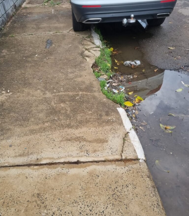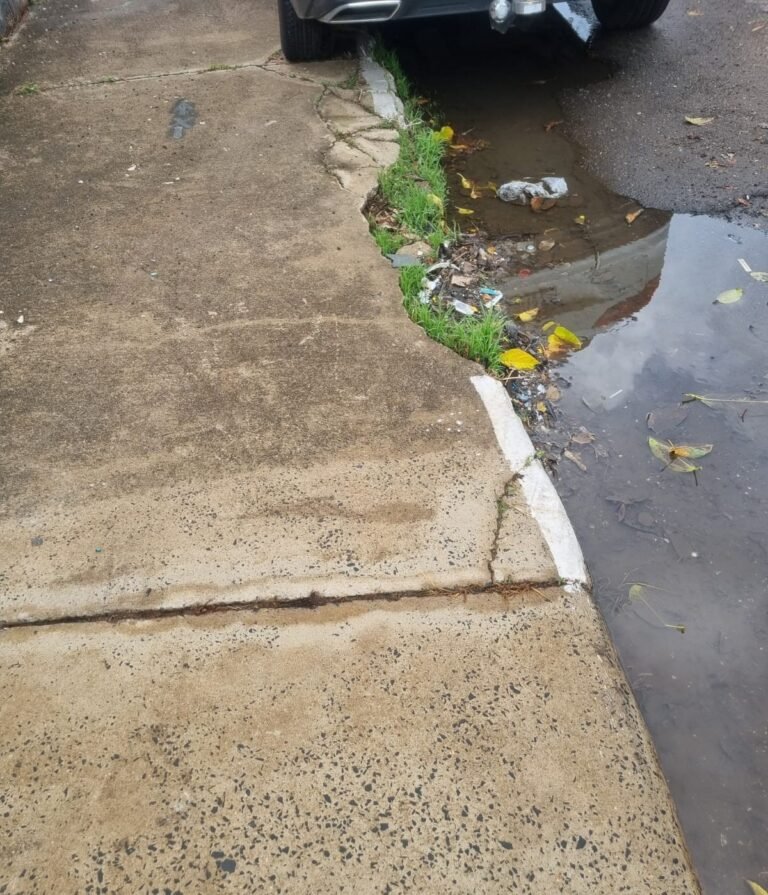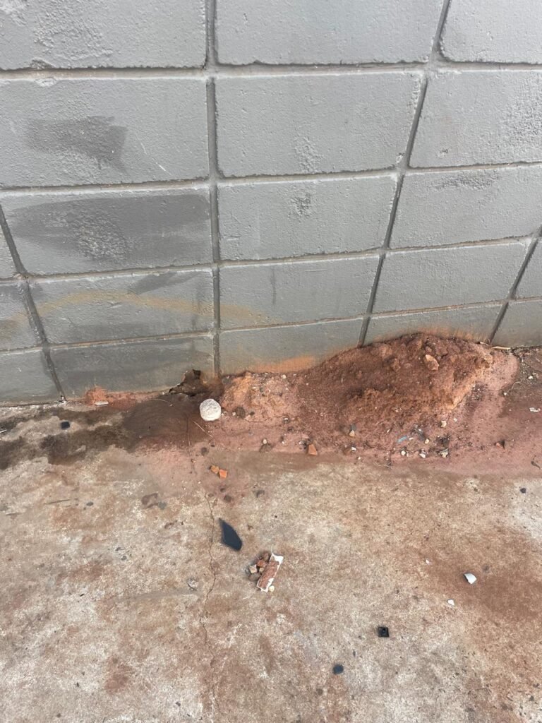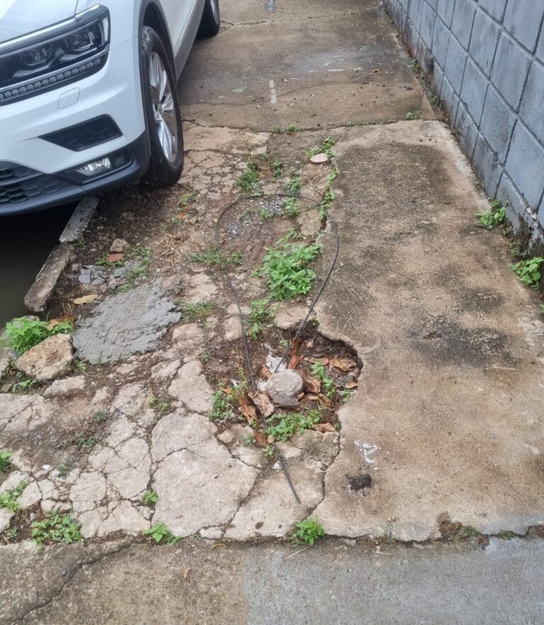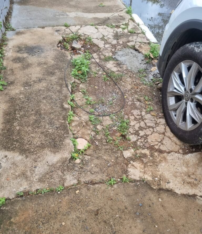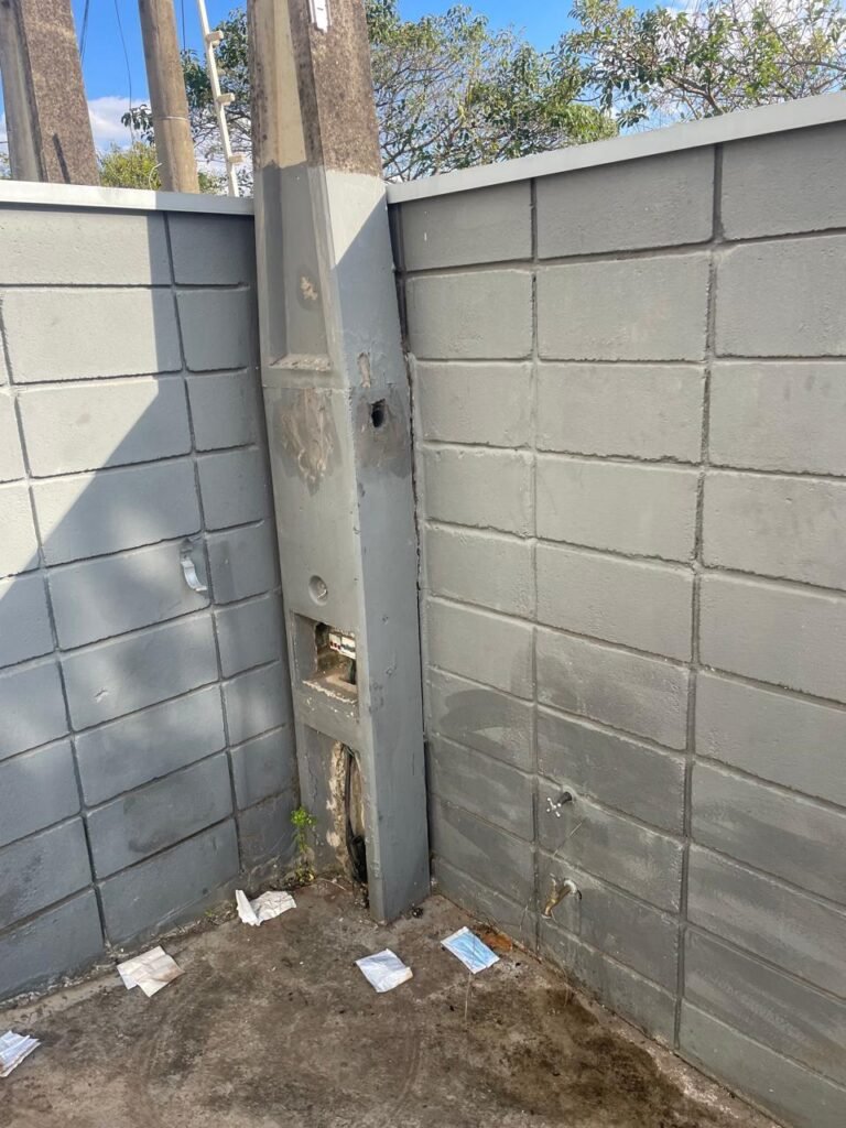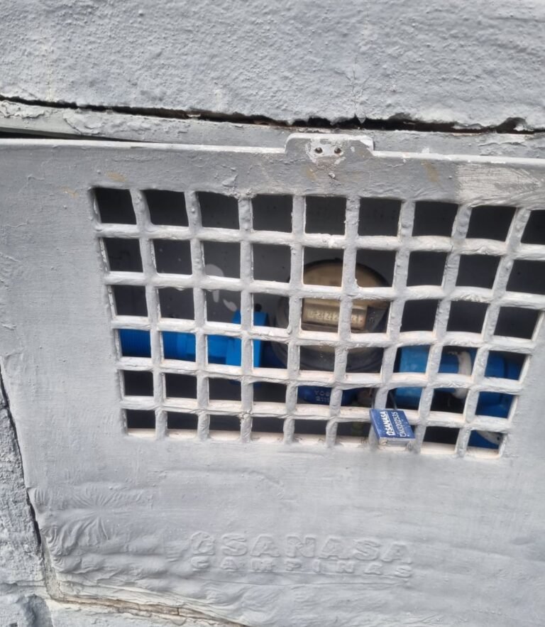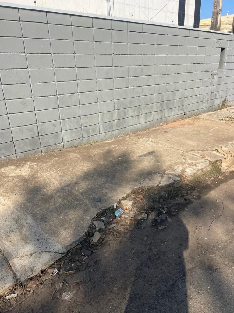 FACHADA-: Calçada de concreto desempenado com desgastes naturais, partes danificadas e trincas, muro em blocos de concreto com pintura nova na cor cinza, dígitos de ferro com pintura na cor cinza “1-5-9-6”, rufus com pintura na cor cinza com desgastes naturais, portão deslizante em gradil e chapas de ferro com pintura na cor cinza claro com desgastes naturais, descasques e pigmentos de ferrugem, portão possui 01 trinco com 01 cadeado Pado com 02 Chaves em ordem, 01 porta social, com 01 fechadura Start em ordem e com chave, 01 caixa de correspondência com trinco para cadeado em ordem, piso de concreto desempenado com desgastes naturais, manchas pela extensão e trincados pela extensão, 01 ralo grelha de ferro em ordem, muros laterais em blocos de concreto com pintura na cor cinza com desgastes naturais, paredes do barracão revestidas de pastilhas de cerâmica com desgastes naturais, partes faltando, partes trincadas, 01 peça com buraco em cima do portão e com manchas pela extensão, 01 luminária com acabamento solto, 01 poste padrão Concrefer em ordem, 01 torneira de Jardim em ordem, 01 canopla de registro em ordem, porta social em grades de ferro com 02 fechaduras ferrolho, com 02 trincos para cadeado em ordem e com pintura na cor cinza claro com desgastes naturais e com pigmentos de ferrugem.