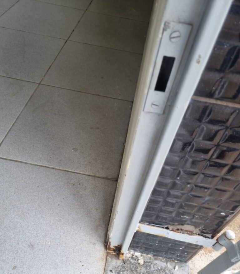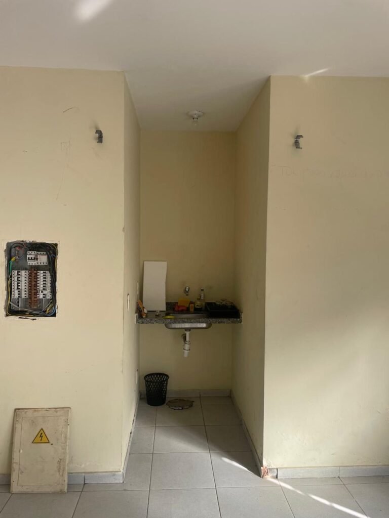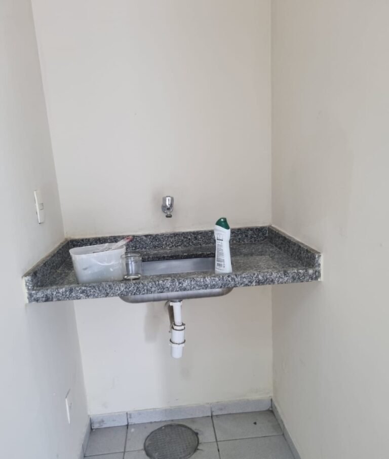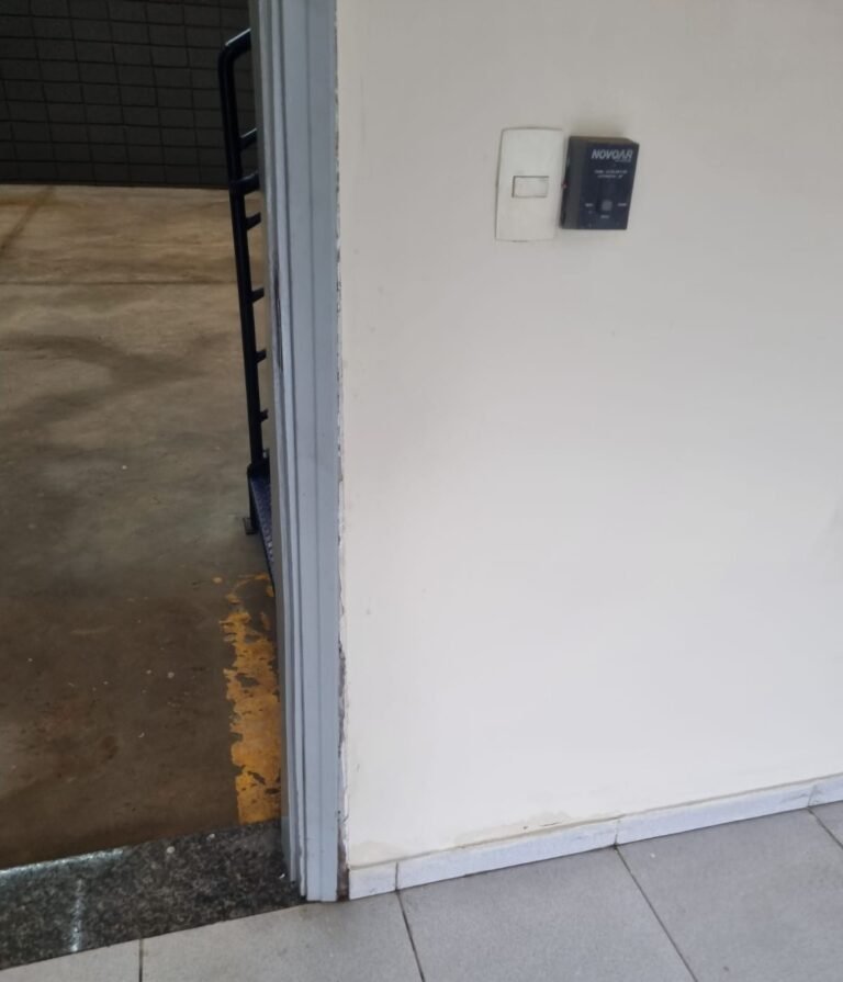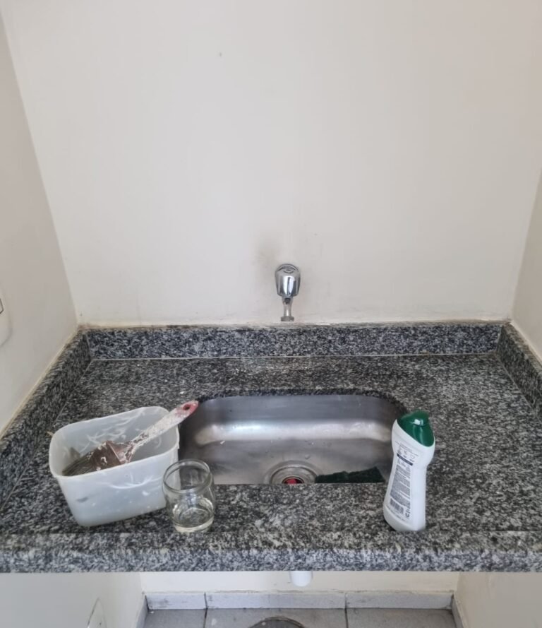 RECEPÇÃO-: 01 Porta social de Metalon em ordem, com pintura na cor cinza claro com desgastes naturais e manchas de infiltração, maçanetas em inox marca Stam em ordem, fechadura marca 3F em ordem e com chave, 01 fechadura tetra marca Stam sem chave, piso e rodapé revestidos de pisos frios cerâmicos com desgastes naturais, manchas e pigmentos de ferrugem, paredes com pintura látex na cor palha com manchas de infiltração, 04 interruptores, 18 tomadas, 10 entrada para fio de dados, ao total 21 espelhos de luz (05 deles estão sem tampa). 01 quadro de distribuição de disjuntores com tampa danificada, disjuntores em ordem, 02 quadros de distribuição com tampa de proteção de ferro em ordem, 01 gabinete de alumínio marca Itatiaia com desgastes naturais, 01 vitrô basculante com esquadrias de ferro com pintura na cor cinza com desgastes naturais, com gradil de ferro de proteção em ordem, com 02 fechaduras danificadas, 50 folhas de acrílico com desgastes naturais, 01 pia de granito cinza ocre em ordem, cuba de inox com desgastes naturais, 01 torneira de jardim em ordem, 01 tampa de inspeção de plástico preto em ordem, 01 bocal com 01 lâmpada de led em ordem, 02 luminárias com 02 lâmpadas tubulares florescentes em ordem.