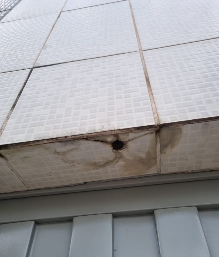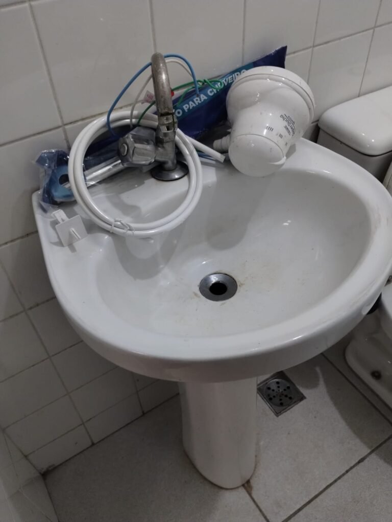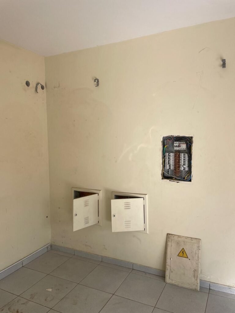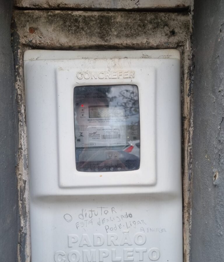 RECEPÇÃO-: 01 Porta social de Metalon em ordem, com pintura na cor cinza claro com desgastes naturais e manchas de infiltração, maçanetas em inox marca Stam em ordem, fechadura marca 3F em ordem e com chave, 01 fechadura tetra marca Stam sem chave, piso e rodapé revestidos de pisos frios cerâmicos com desgastes naturais, manchas e pigmentos de ferrugem, paredes com pintura látex na cor palha com manchas de infiltração, 04 interruptores, 18 tomadas, 10 entrada para fio de dados, ao total 21 espelhos de luz (05 deles estão sem tampa). 01 quadro de distribuição de disjuntores com tampa danificada, disjuntores em ordem, 02 quadros de distribuição com tampa de proteção de ferro em ordem, 01 gabinete de alumínio marca Itatiaia com desgastes naturais, 01 vitrô basculante com esquadrias de ferro com pintura na cor cinza com desgastes naturais, com gradil de ferro de proteção em ordem, com 02 fechaduras danificadas, 50 folhas de acrílico com desgastes naturais, 01 pia de granito cinza ocre em ordem, cuba de inox com desgastes naturais, 01 torneira de jardim em ordem, 01 tampa de inspeção de plástico preto em ordem, 01 bocal com 01 lâmpada de led em ordem, 02 luminárias com 02 lâmpadas tubulares florescentes em ordem.