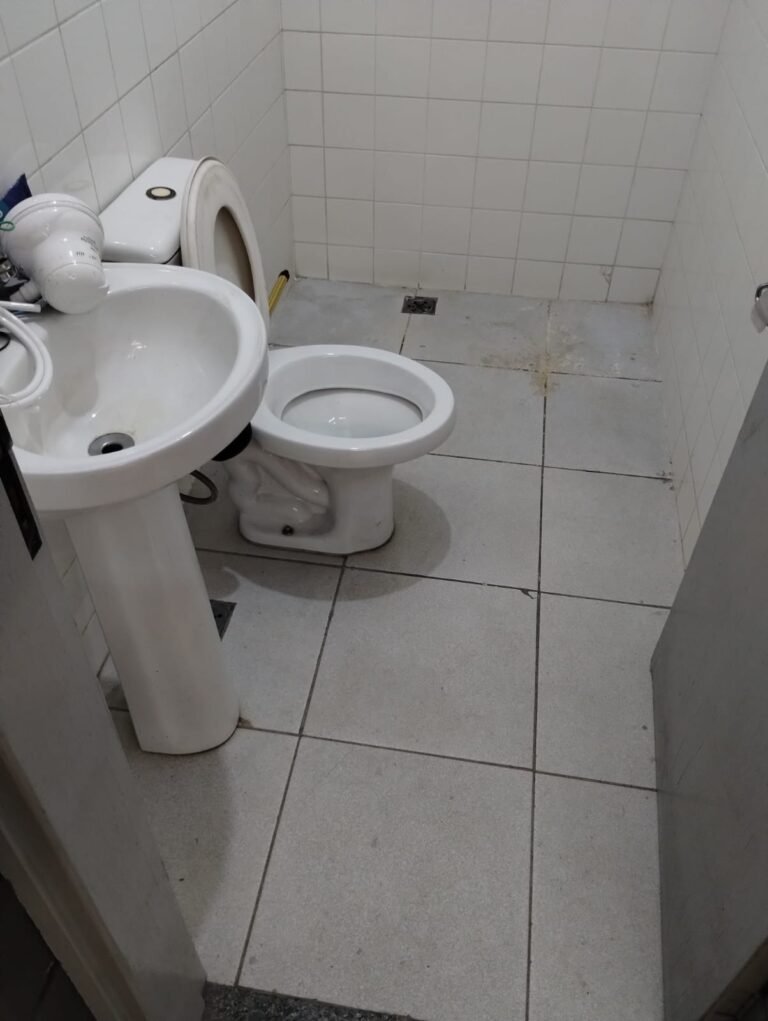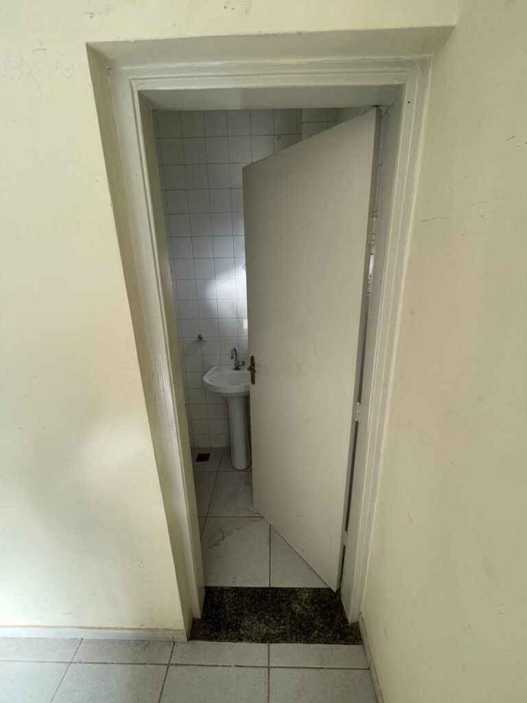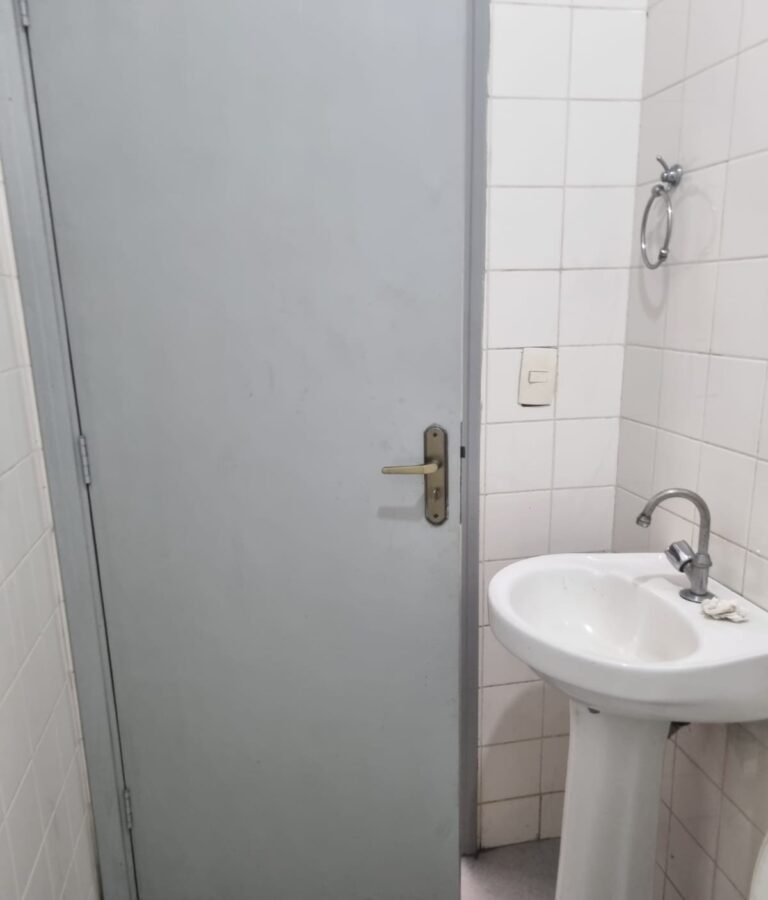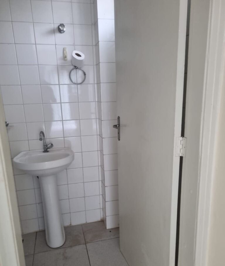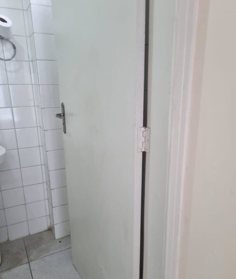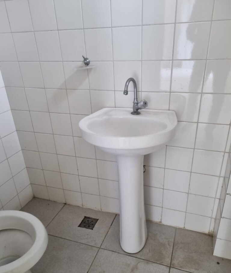 WC RECEPÇÃO-: 01 porta de madeira com pintura na cor cinza claro em ordem, com maçanetas em ordem, fechadura com chave embutida em ordem, pisos revestidos de pisos frios cerâmicos em ordem, 01 ralo em inox em ordem, paredes revestidas de azulejos em ordem, 01 conjunto sanitário de cerâmica cor branco, marca Locasa, válvula de descarga acoplada em ordem, descarga em ordem, conjunto lavatório de cerâmica na cor branco, marca Looasa em ordem, com 01 torneira em inox em ordem, 01 suporte de sabonete em ordem, 01 suporte de toalha de rosto com desgastes naturais, 01 suporte de plástico 3m em ordem, 01 canopla de registro em inox em ordem, 01 suporte de papel higiênico com desgastes naturais, 01 interruptor com espelho de luz em ordem, teto com pintura na cor branco neve em ordem, 01 vitrô basculante com esquadrias de ferro com manchas de ferrugem, com pintura na cor cinza, com gradil de ferro de proteção, com fechadura em ordem e com 10 folhas de acrílico em ordem.