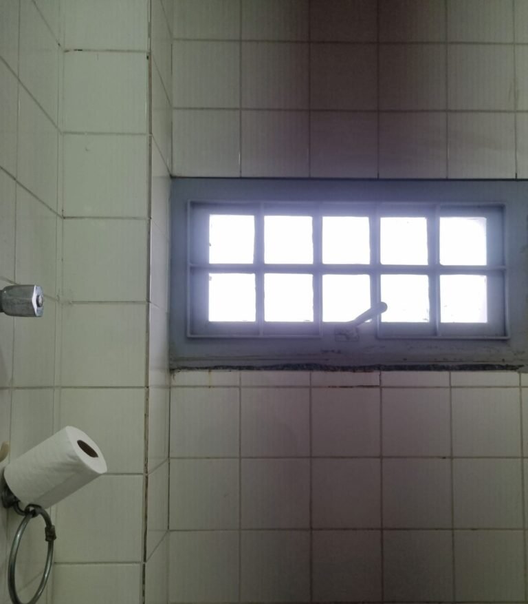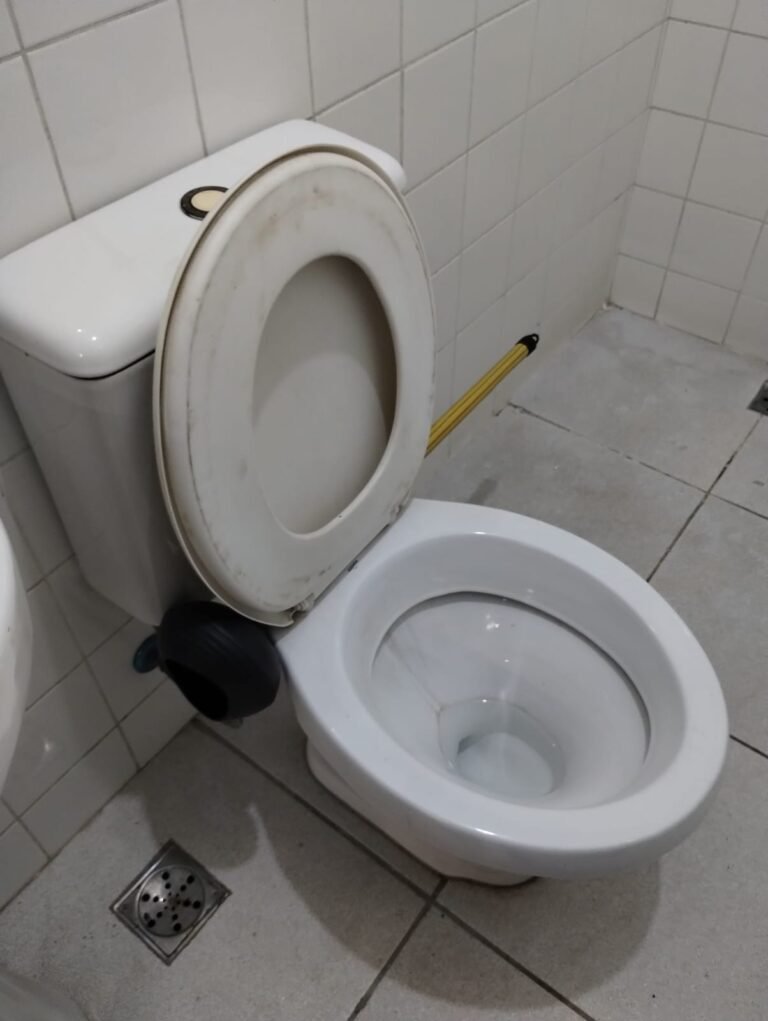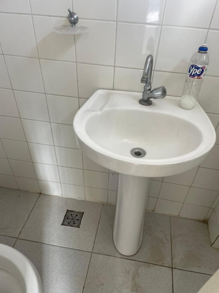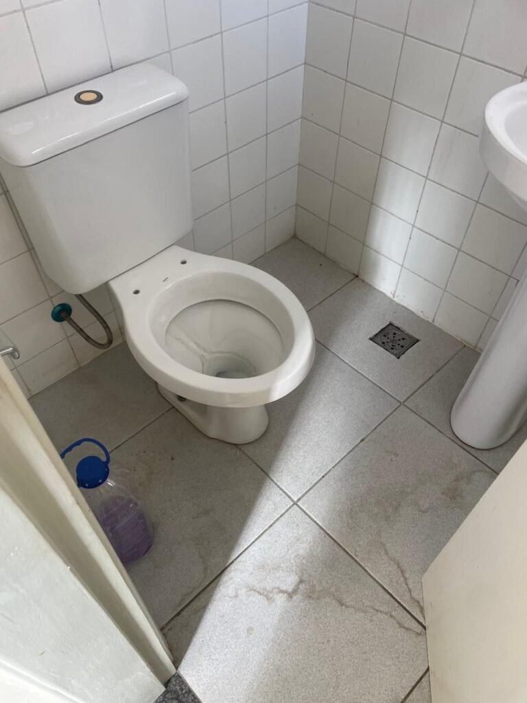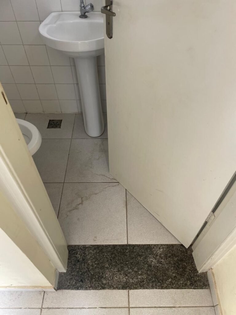 WC RECEPÇÃO-: 01 porta de madeira com pintura na cor cinza claro em ordem, com maçanetas em ordem, fechadura com chave embutida em ordem, pisos revestidos de pisos frios cerâmicos em ordem, 01 ralo em inox em ordem, paredes revestidas de azulejos em ordem, 01 conjunto sanitário de cerâmica cor branco, marca Locasa, válvula de descarga acoplada em ordem, descarga em ordem, conjunto lavatório de cerâmica na cor branco, marca Looasa em ordem, com 01 torneira em inox em ordem, 01 suporte de sabonete em ordem, 01 suporte de toalha de rosto com desgastes naturais, 01 suporte de plástico 3m em ordem, 01 canopla de registro em inox em ordem, 01 suporte de papel higiênico com desgastes naturais, 01 interruptor com espelho de luz em ordem, teto com pintura na cor branco neve em ordem, 01 vitrô basculante com esquadrias de ferro com manchas de ferrugem, com pintura na cor cinza, com gradil de ferro de proteção, com fechadura em ordem e com 10 folhas de acrílico em ordem.