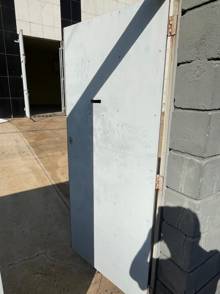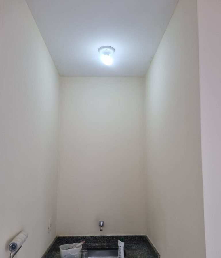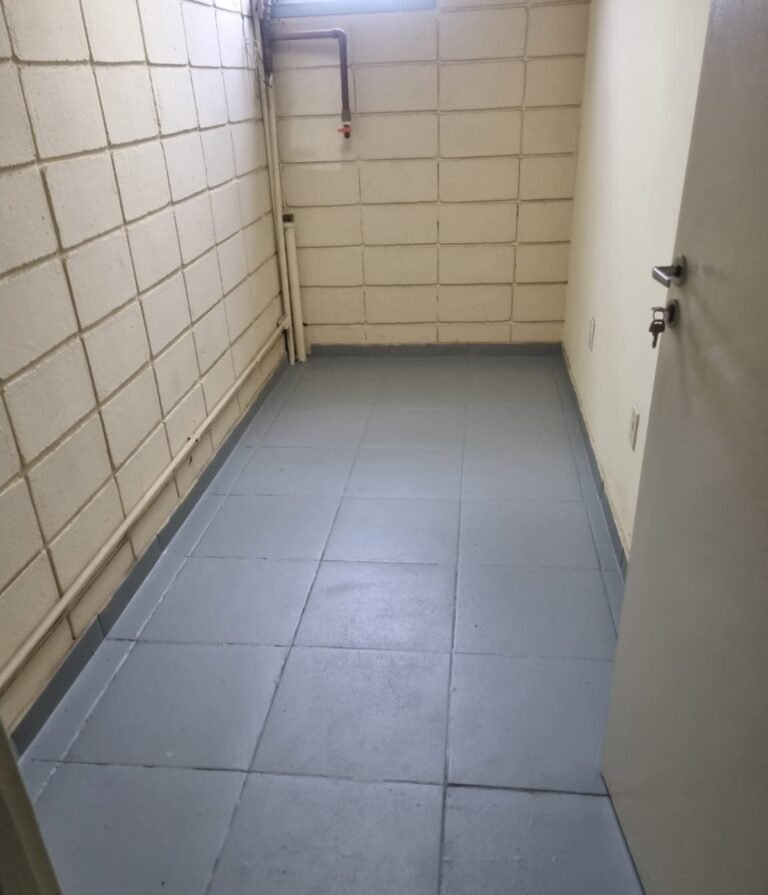 DEPÓSITO -: 01 Porta de madeira com pintura na cor cinza claro em ordem, com maçanetas em inox em ordem, com fechadura marca Arouca com chave em ordem, pisos e rodapés revestidos de pisos frios cerâmicos com pintura na cor cinza nova e em ordem, paredes com pintura na cor palha em ordem, 01 tomada e 01 entrada para fio de dados, ambas com espelho de luz em ordem, 01 vitrô basculante com esquadrias de ferro com pintura na cor cinza em ordem, com fechadura em ordem, com gradil de ferro de proteção em ordem, teto com forro de placas de isopor térmico em ordem, 01 luminária com 04 lâmpadas tubulares florescentes em ordem.