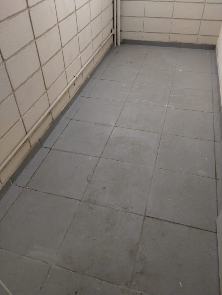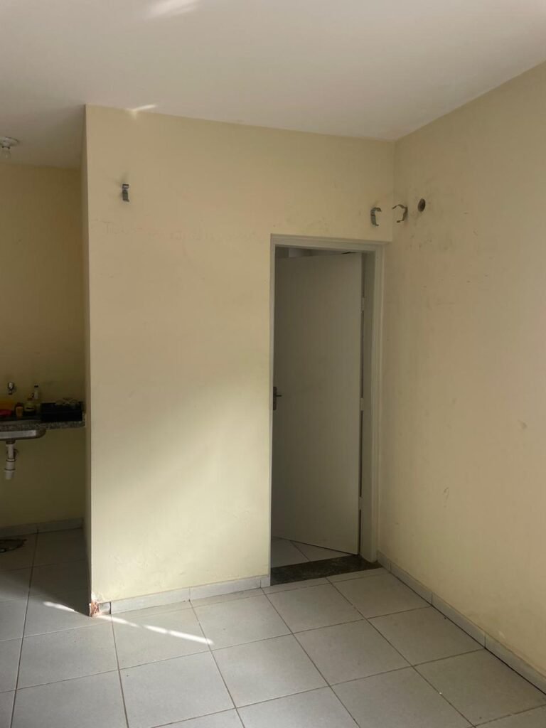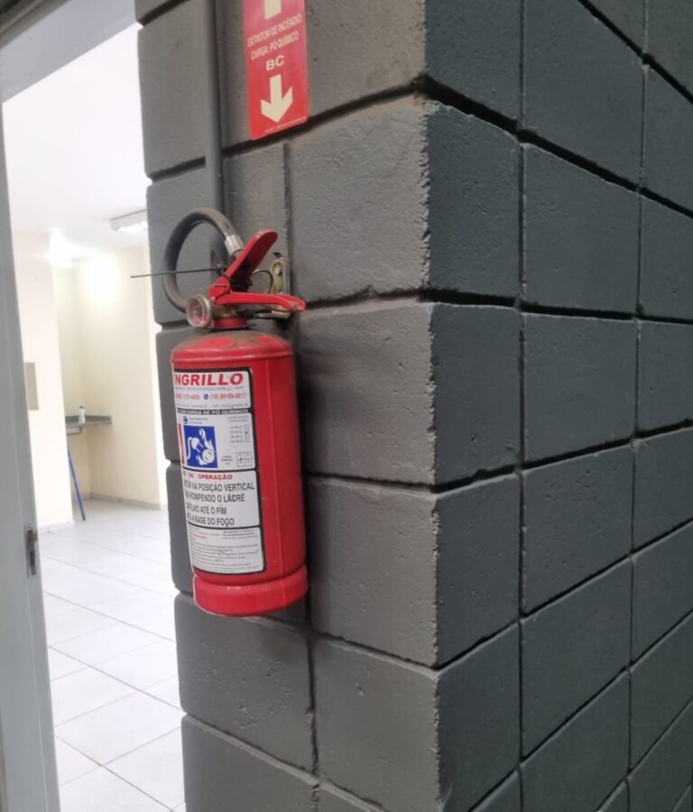 HALL DISTRIBUIÇÃO ESCRITÓRIO-: Pisos e rodapés revestidos de pisos frios cerâmicos com pintura na cor cinza com desgastes naturais, paredes de blocos de concreto com pintura na cor palha nova e em ordem, 01 extintor de pó químico 20-B:C 4kg com validade em ordem, 01 interruptor com espelho em ordem.
