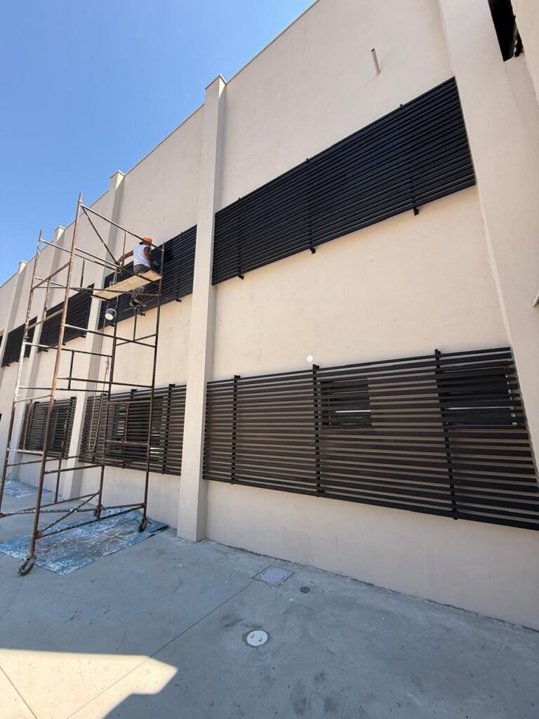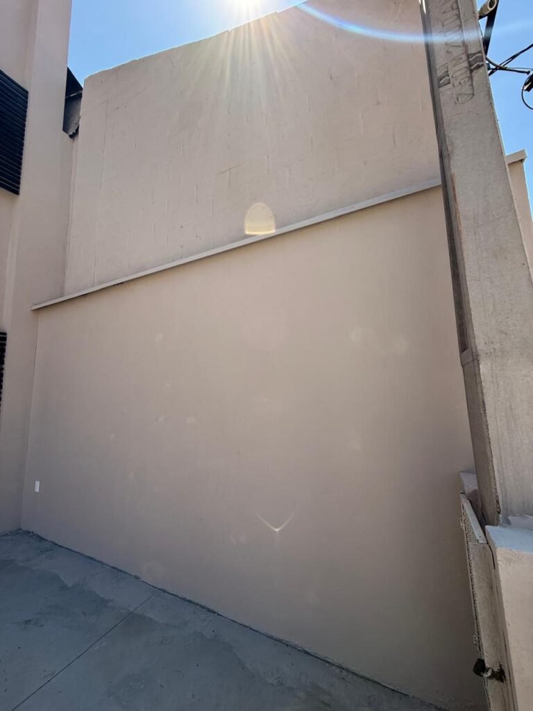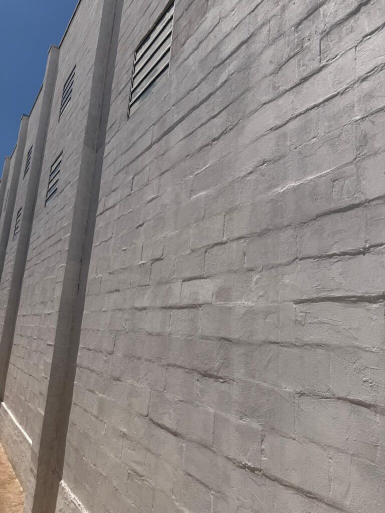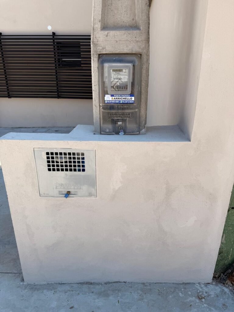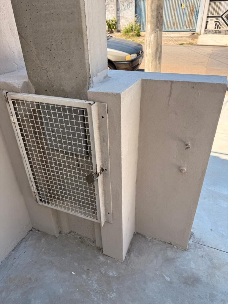 FACHADA -: Piso de concreto usinado novo, com pequenas marcas de pneu e restante em ordem, 01 poste padrão Concrefer em ordem, medidor elétrico com lacre, tampa de proteção de plástico, tanto de proteção em gradil de ferro com fechadura e cadeado Pado Lt-45 em ordem, cavalete com hidrômetro padrão Sanasa, com tampa de proteção e lacre em ordem, 01 canopla de registro geral em ordem, 02 tampas de inspeção de plástico, marca Amanco em ordem,  02 tampas de inspeção de aço, 06 espelhos de energia cegos, paredes do galpão com tinta acrílica na cor bronze fosca ( marca Anjo ) nova e em ordem, 07 grades de ferro de proteção de janelas com pintura nova na cor preto em ordem.