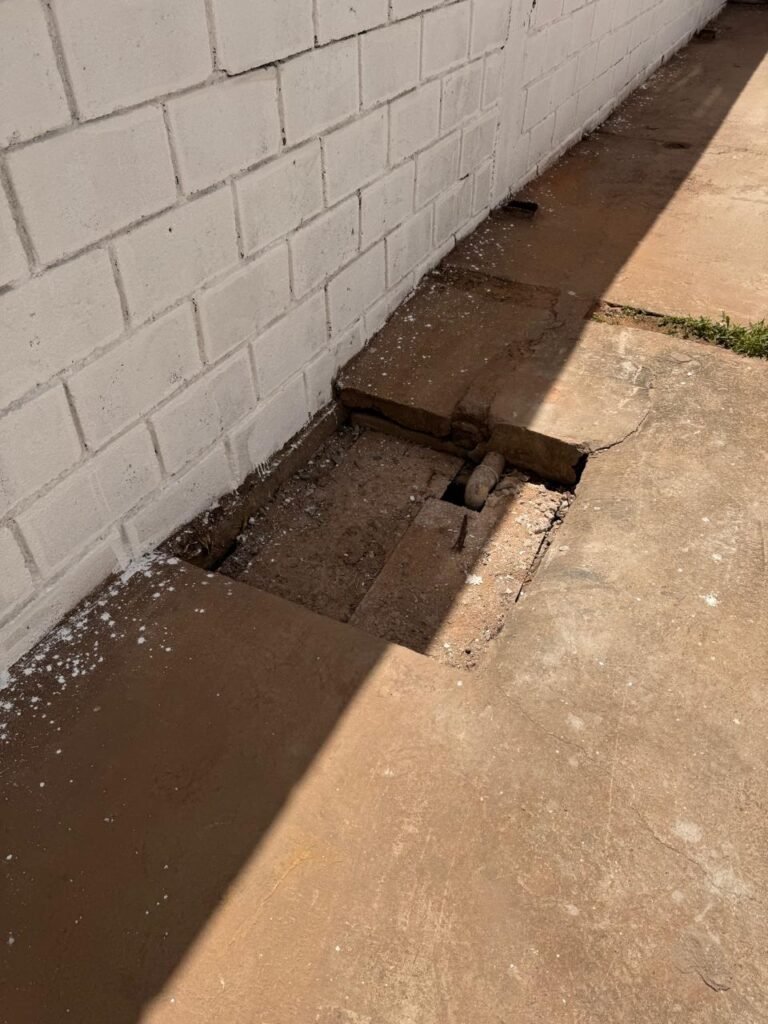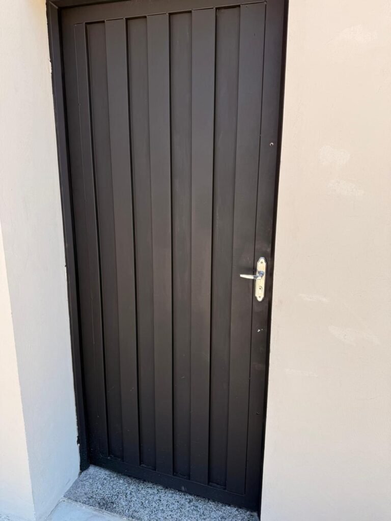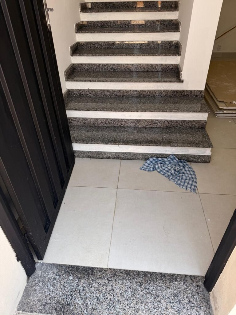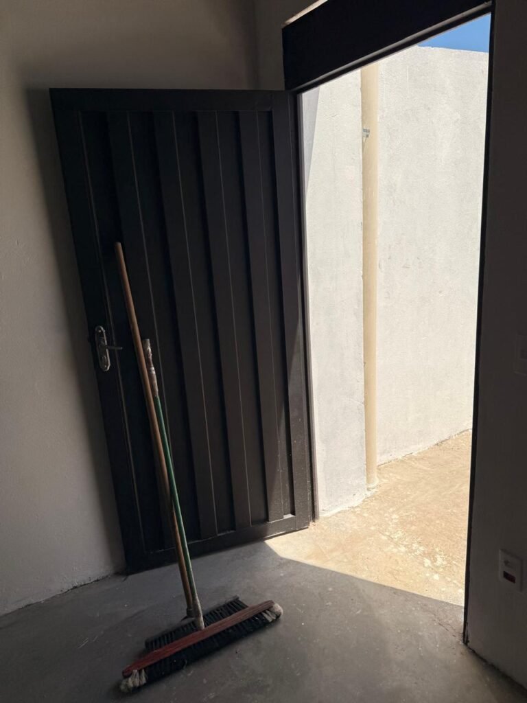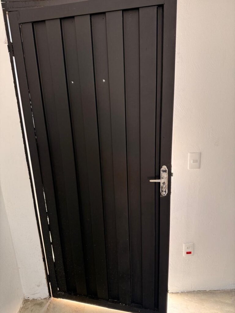 FUNDOS-: 01 porta social de metalon nova, com pintura na cor preto (marca Anjo) nova e em ordem, com maçanetas e fechadura de inox marca 3F em ordem e com chave, piso de concreto desempenado em ordem, 01 tampa de inspeção de ferro em ordem, paredes com tinta acrílica na cor branco fosco (marca Anjo) nova e em ordem, 01 torneira de jardim de plástico em ordem.