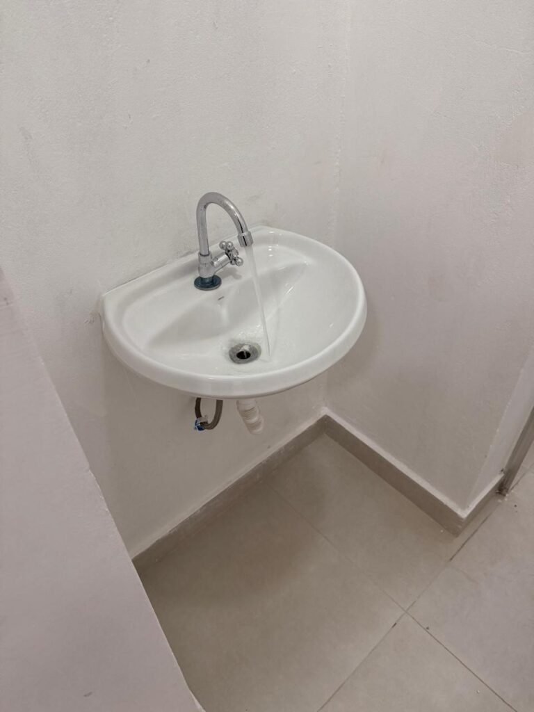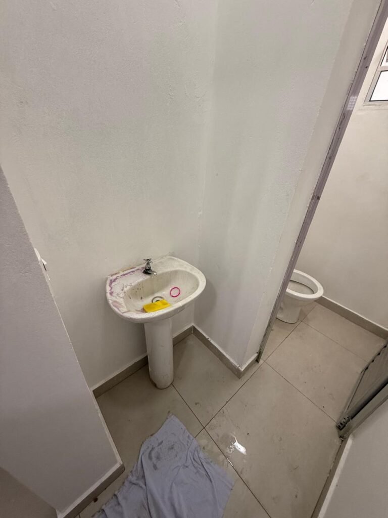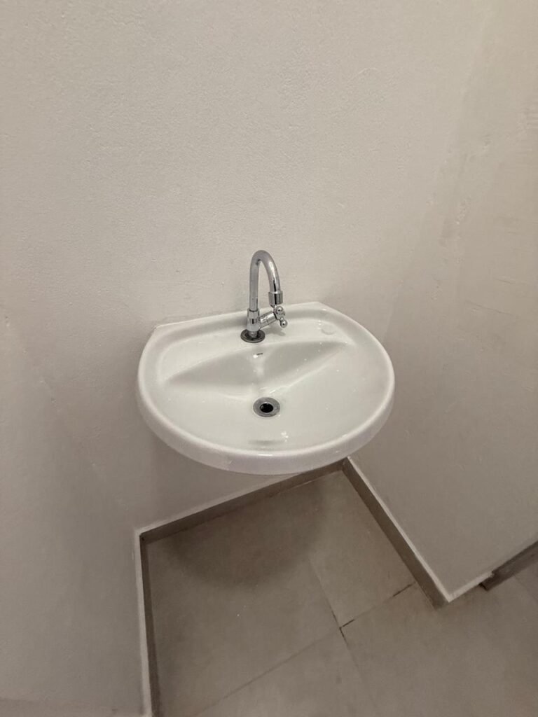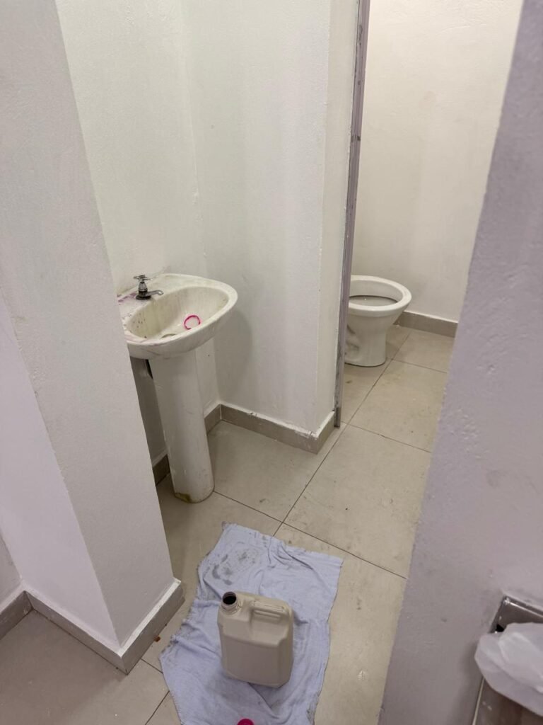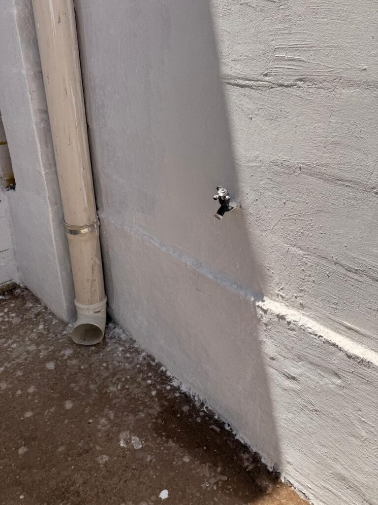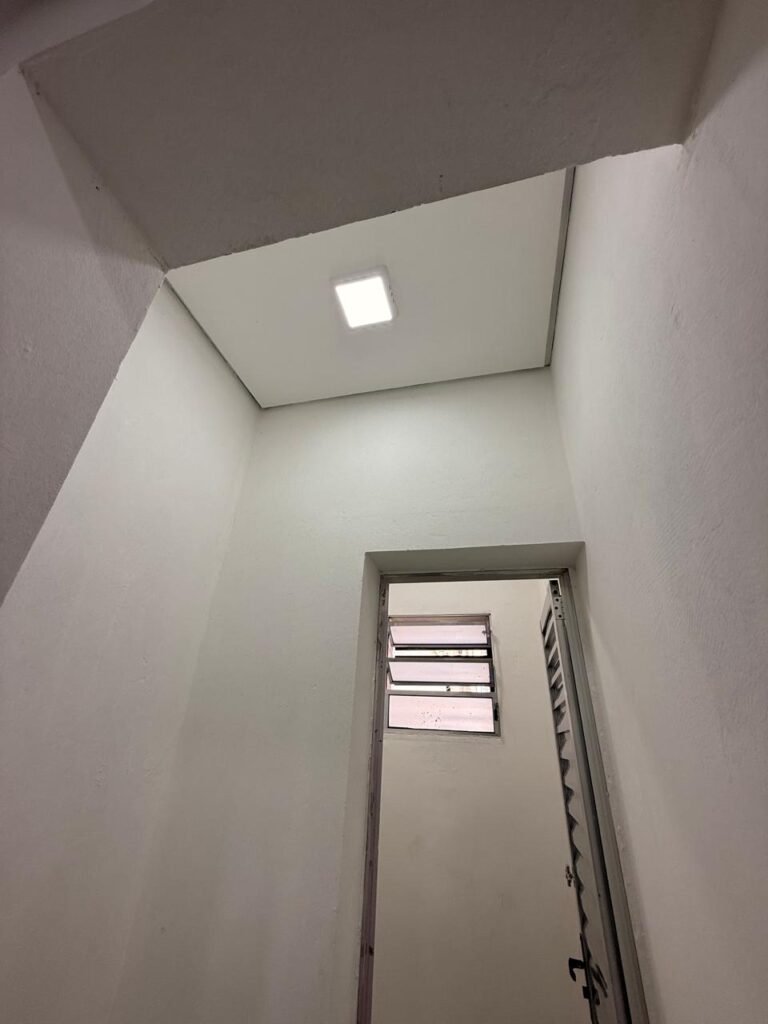 FUNDOS-: 01 porta social de metalon nova, com pintura na cor preto (marca Anjo) nova e em ordem, com maçanetas e fechadura de inox marca 3F em ordem e com chave, piso de concreto desempenado em ordem, 01 tampa de inspeção de ferro em ordem, paredes com tinta acrílica na cor branco fosco (marca Anjo) nova e em ordem, 01 torneira de jardim de plástico em ordem.