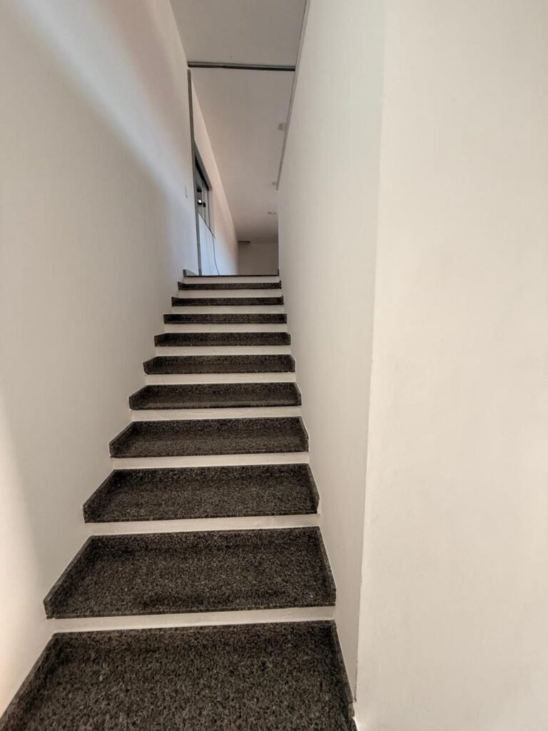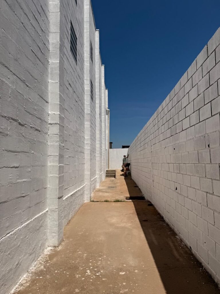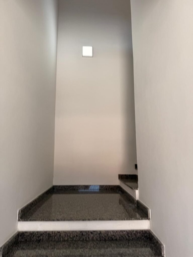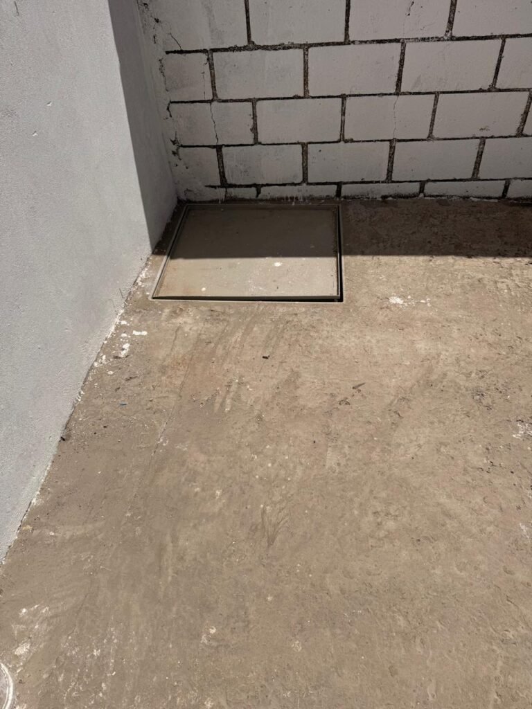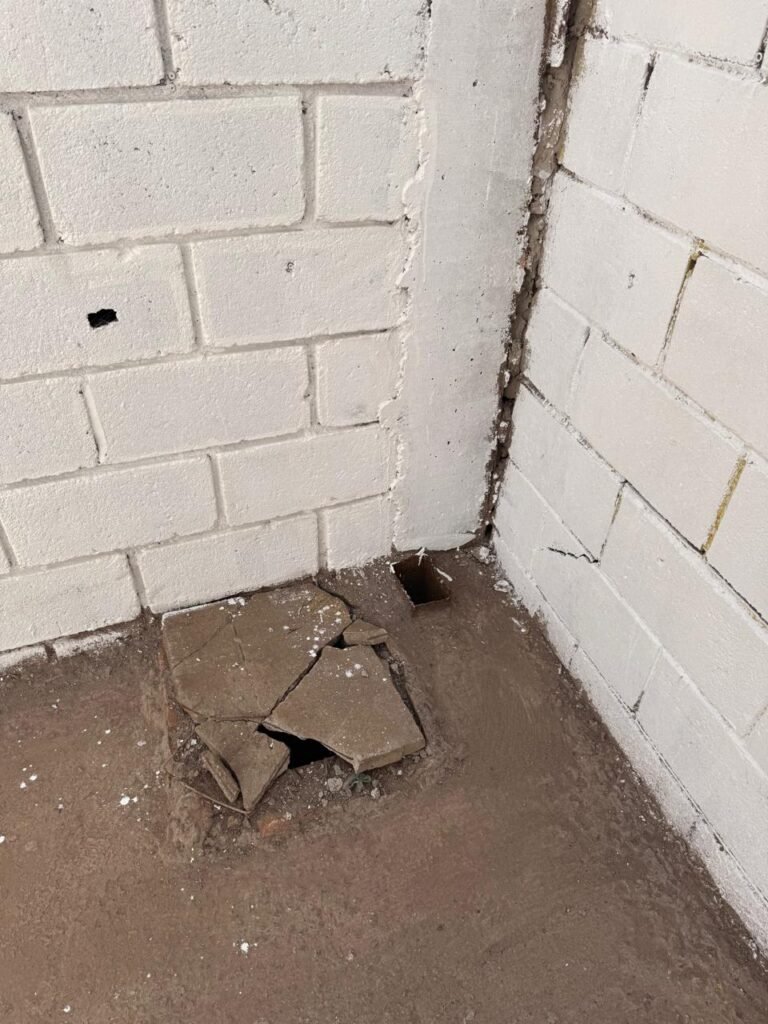 FUNDOS-: 01 porta social de metalon nova, com pintura na cor preto (marca Anjo) nova e em ordem, com maçanetas e fechadura de inox marca 3F em ordem e com chave, piso de concreto desempenado em ordem, 01 tampa de inspeção de ferro em ordem, paredes com tinta acrílica na cor branco fosco (marca Anjo) nova e em ordem, 01 torneira de jardim de plástico em ordem.
