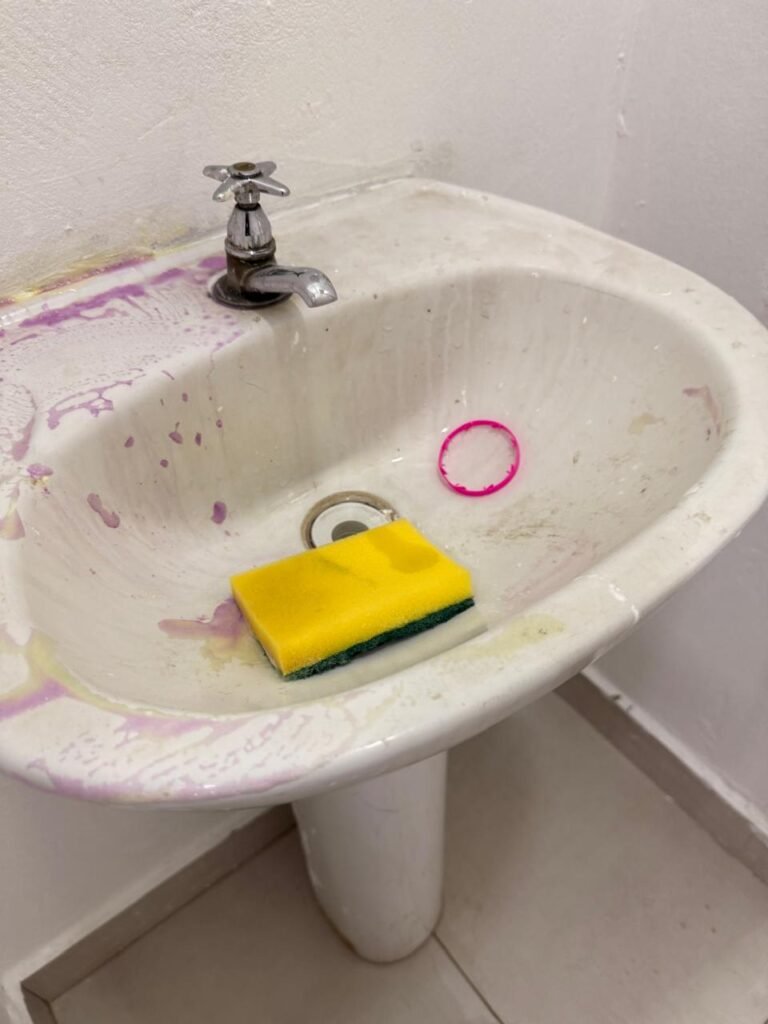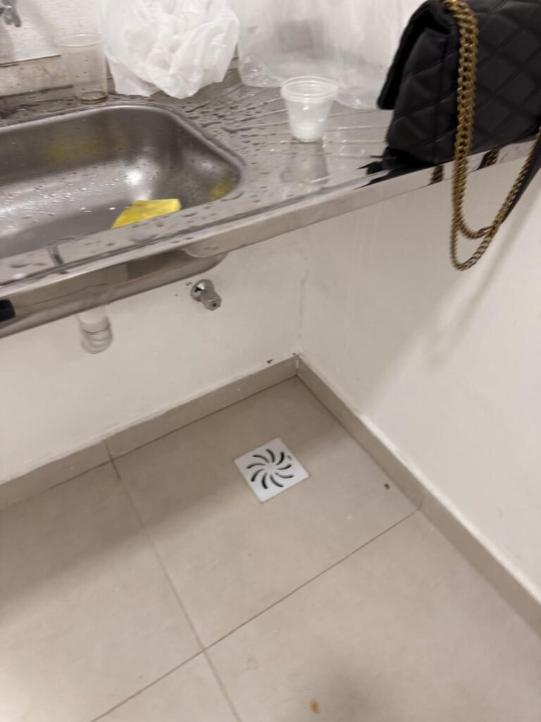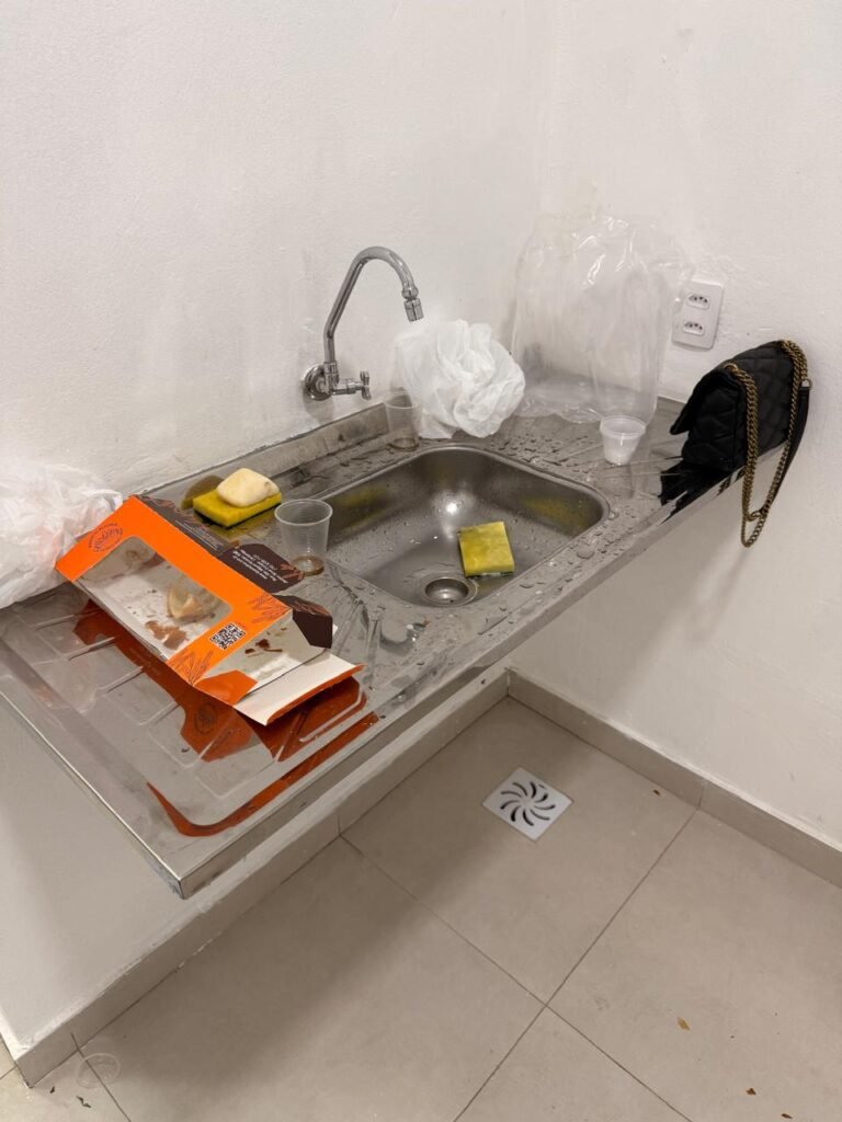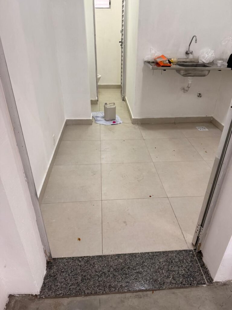 COPA-: 01 soleira de granito cinza ocre nova em ordem, 01 porta social de alumínio e 01 folha de vidro liso temperado em ordem, maçanetas (01 maçaneta escapando) e fechadura em inox marca Pado em ordem, piso e rodapé revestidos de pisos de porcelanato novos e em ordem, 01 ralo de plástico cor branco marca Amanco em ordem, 05 espelhos de energia, sendo eles: 01 espelho com 01 interruptor, 02 espelhos com 02 tomadas e 02 espelhos com 01 tomada, paredes e teto com tinta acrílica na cor branco fosco nova e em ordem, 01 canopla de registro em inox em ordem, 01 pia em inox nova e em ordem, sifão sanfonado em ordem, 01 torneira bica móvel em inox em ordem, 02 luminárias plafon de sobrepor com LED em ordem, 01 conjunto lavatório de cerâmica na cor branco, encardido com sujeira, torneira de inox marca Águia com desgastes naturais, encanamento pingando, parte do teto com forro de gesso em ordem.
