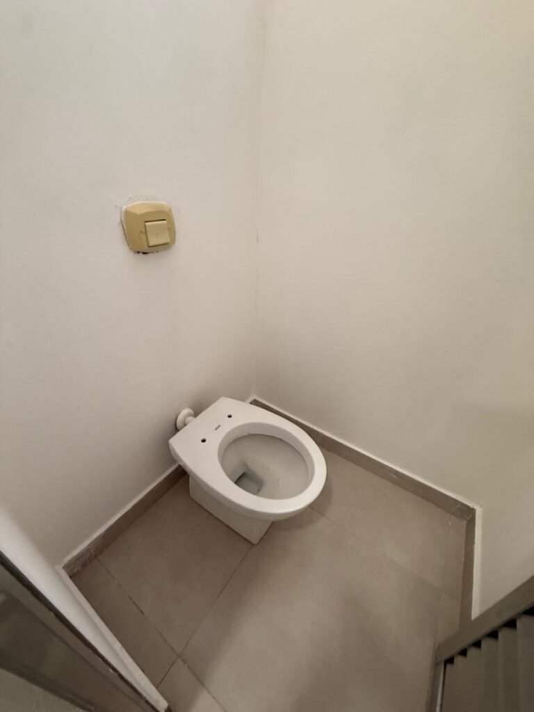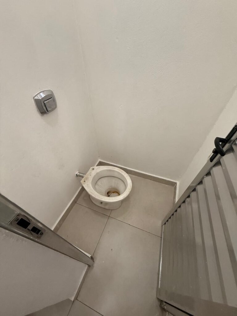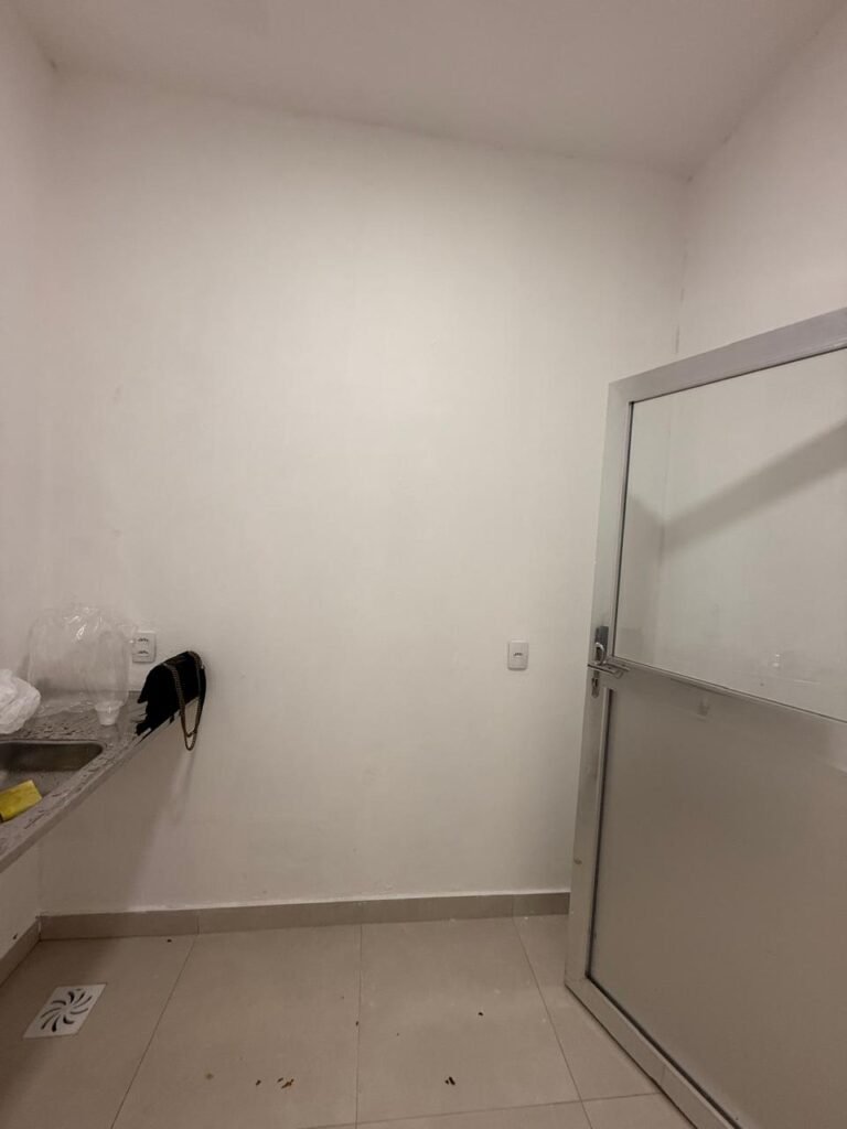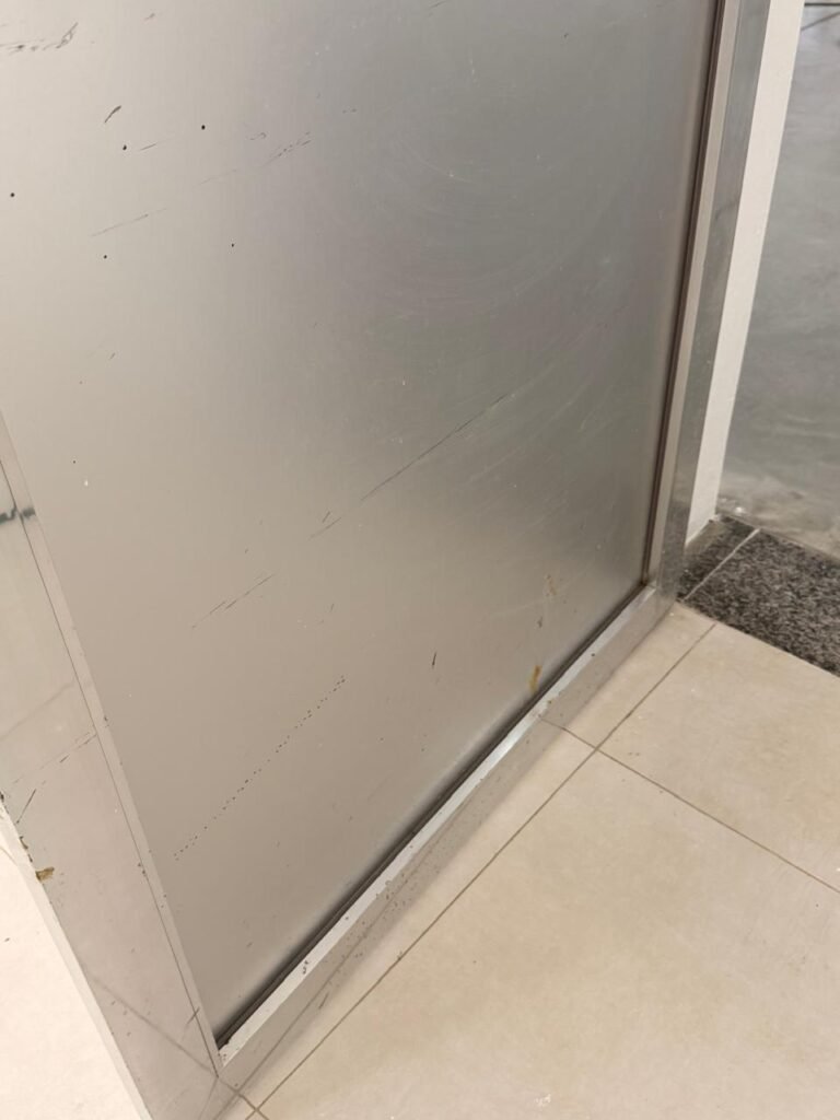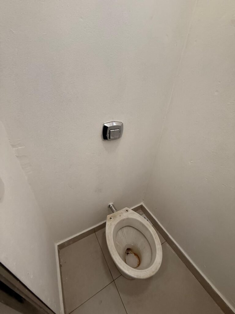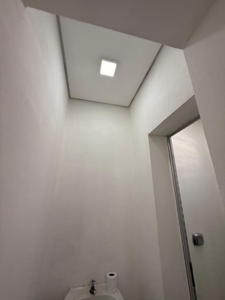 WC ESCRITÓRIO 01-: 01 porta de alumínio nova, com dificuldade para fechar, maçanetas e fechadura na cor preto marca MM em ordem, piso e rodapé e vestido de pisos de porcelanato novos e em ordem, 01 ralo de plástico cor branco marca Amanco, 01 espelho de energia com 0 1 interruptor, 01 vaso sanitário de cerâmica cor branco marca Laufen, 01 válvula de descarga de plástico marca Docol em ordem, descarga em ordem, parede e teto de drywall com tinta acrílica na cor branco fosco nova e em ordem, 01 vitrô basculante com esquadrias de alumínio e fechadura em ordem, com 03 folhas de vidro fosco com manchas de tinta e restante em ordem, 01 luminária plafon de sobrepor com LED em ordem.