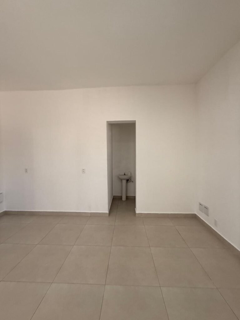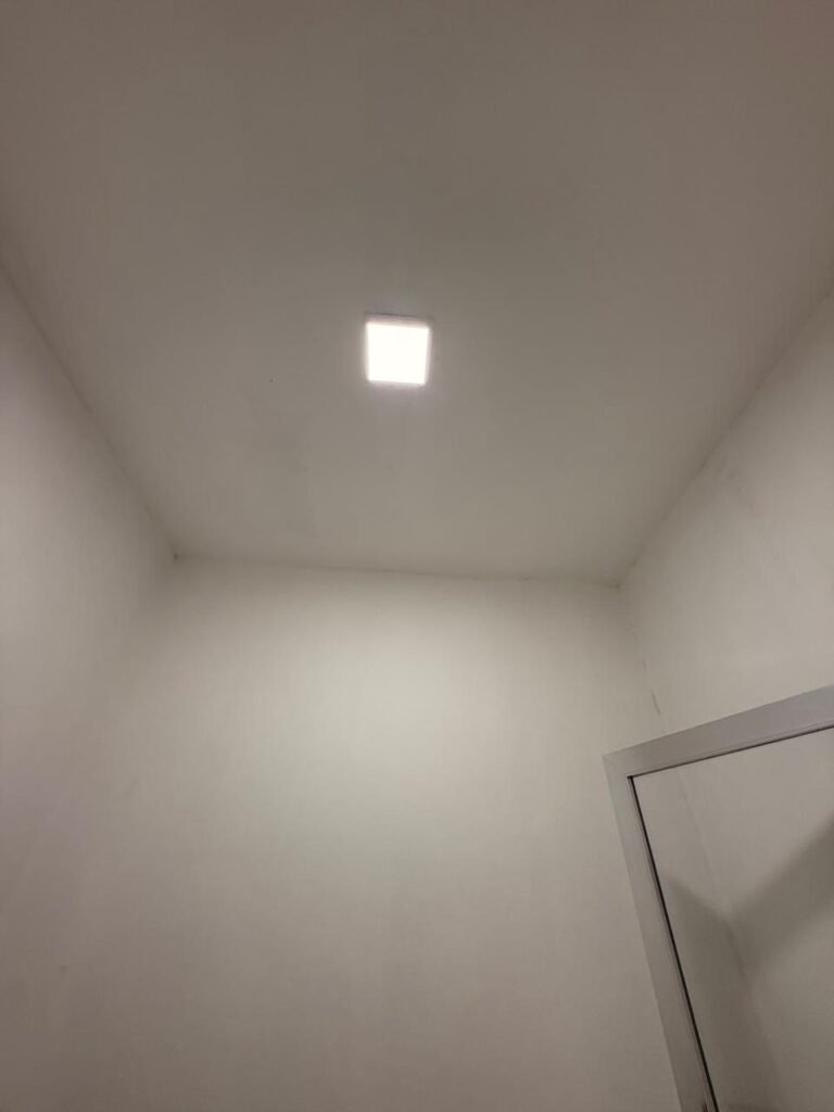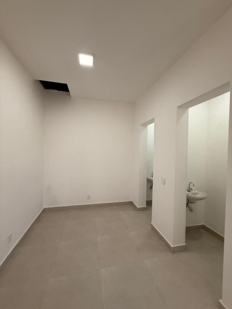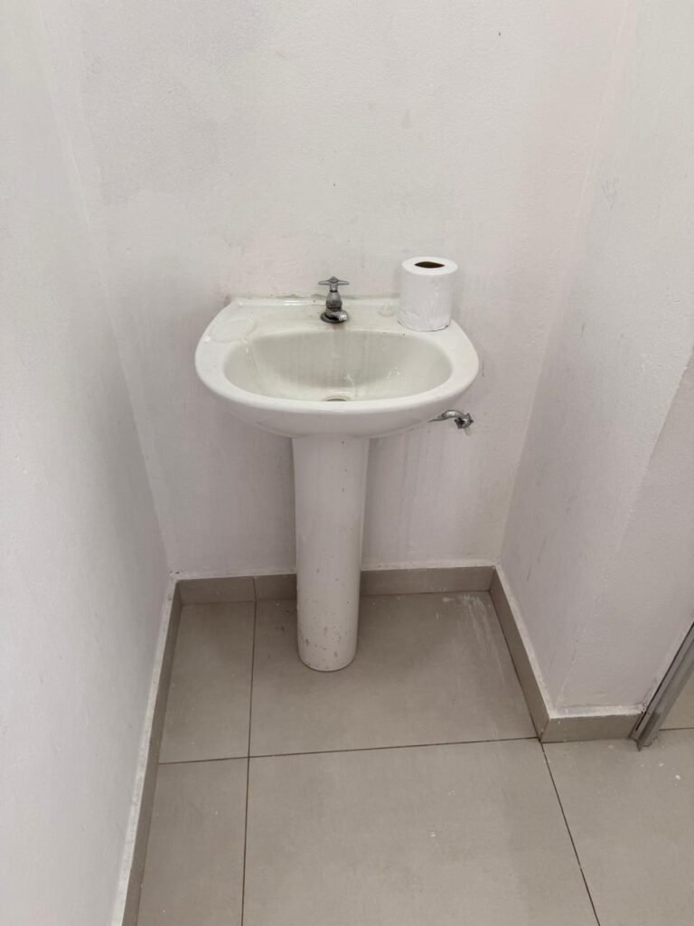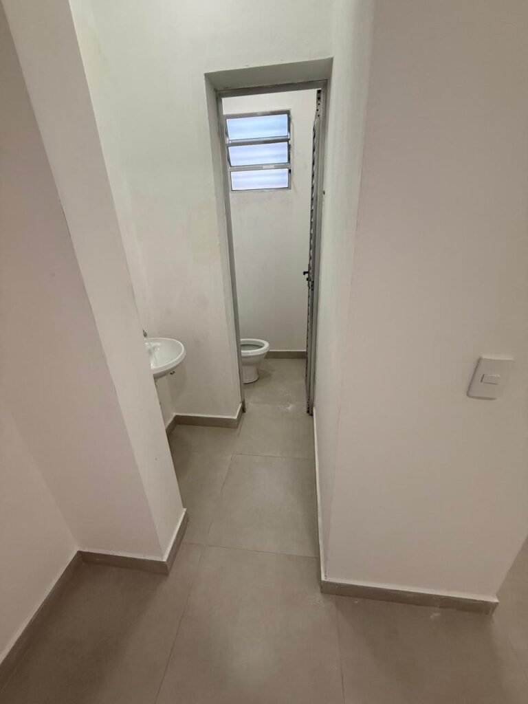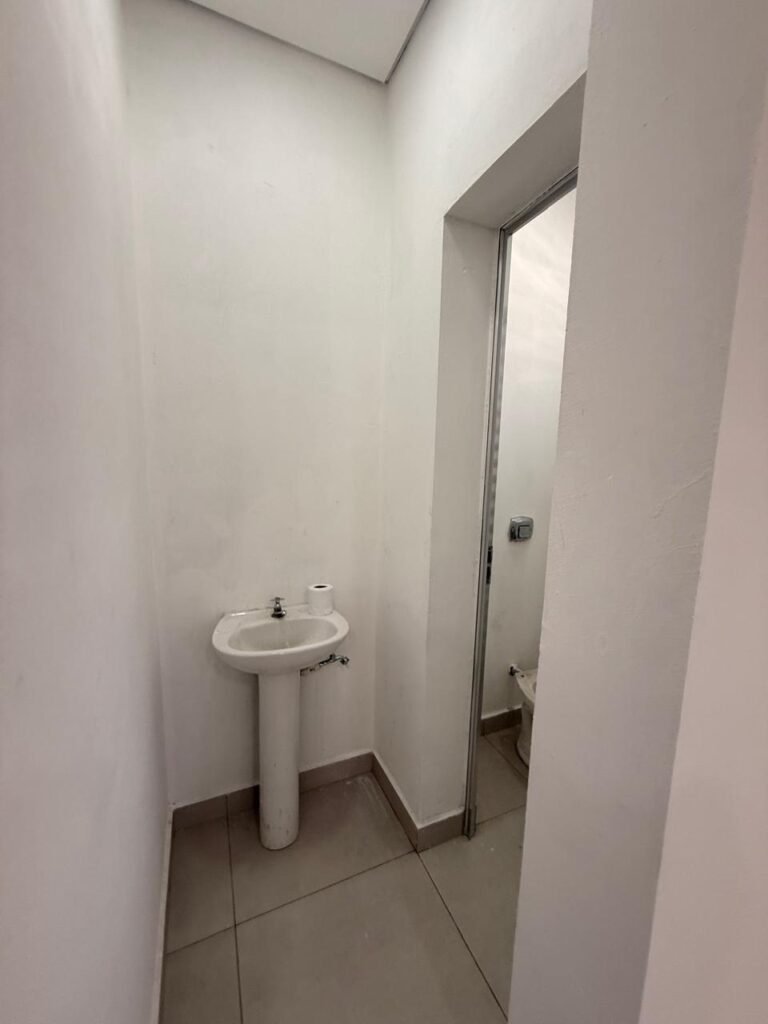 WC ESCRITÓRIO 01-: 01 porta de alumínio nova, com dificuldade para fechar, maçanetas e fechadura na cor preto marca MM em ordem, piso e rodapé e vestido de pisos de porcelanato novos e em ordem, 01 ralo de plástico cor branco marca Amanco, 01 espelho de energia com 0 1 interruptor, 01 vaso sanitário de cerâmica cor branco marca Laufen, 01 válvula de descarga de plástico marca Docol em ordem, descarga em ordem, parede e teto de drywall com tinta acrílica na cor branco fosco nova e em ordem, 01 vitrô basculante com esquadrias de alumínio e fechadura em ordem, com 03 folhas de vidro fosco com manchas de tinta e restante em ordem, 01 luminária plafon de sobrepor com LED em ordem.