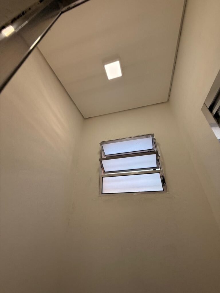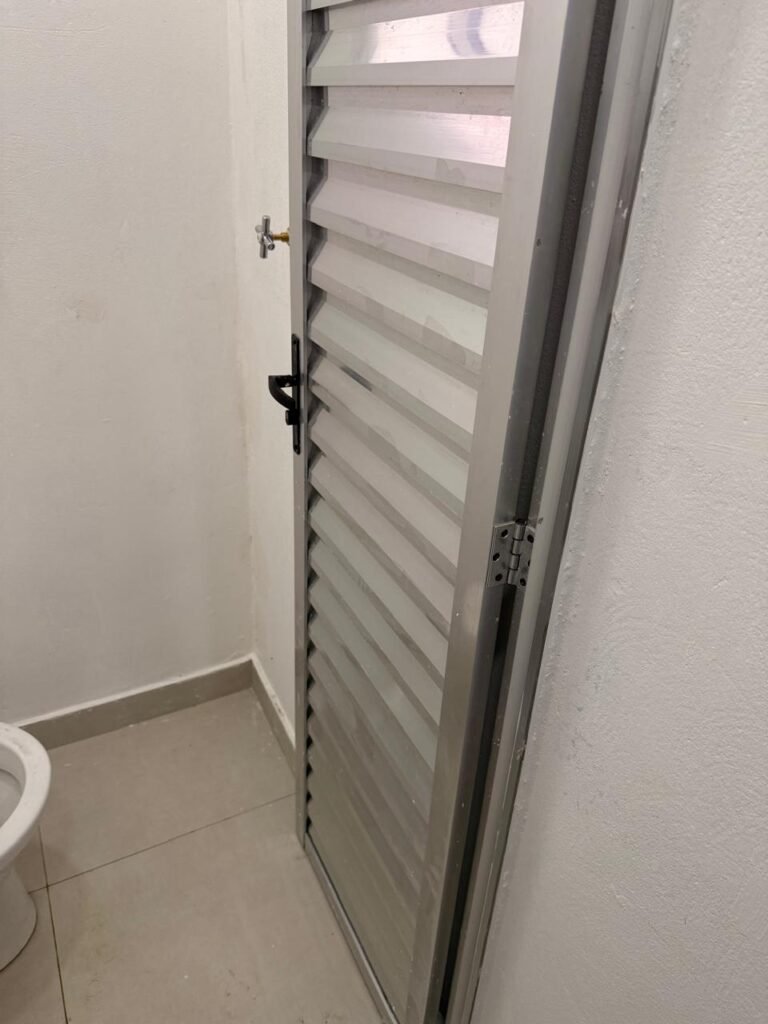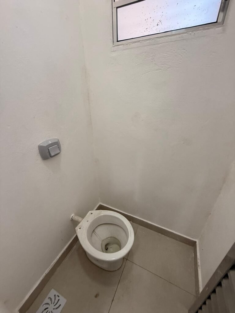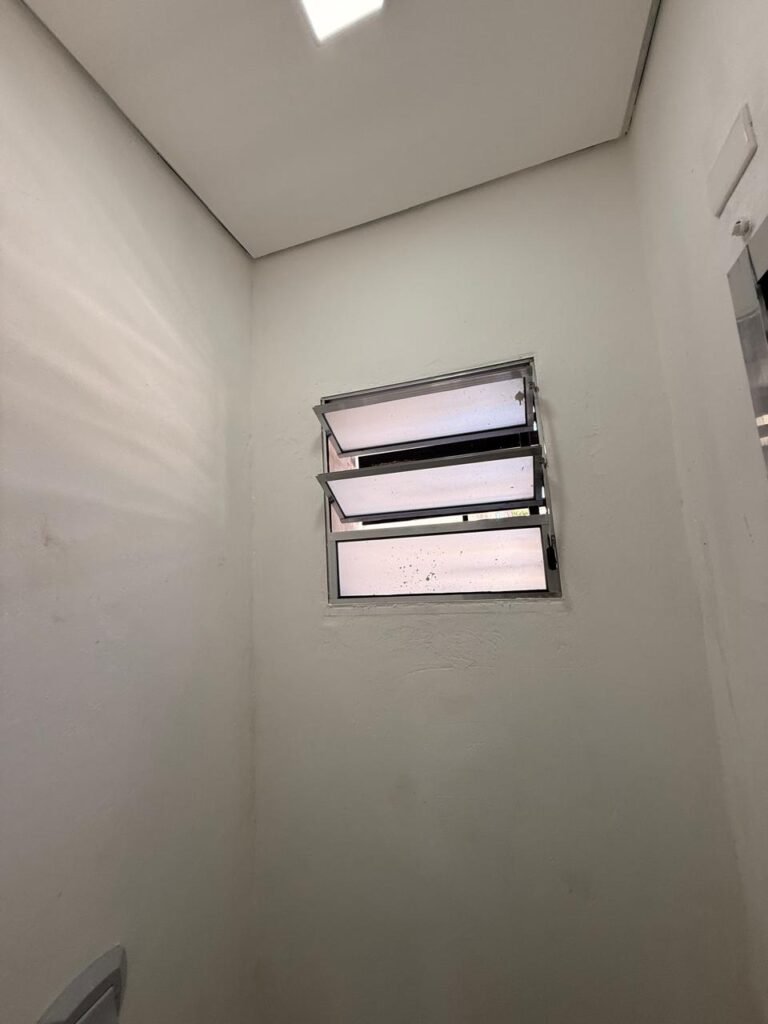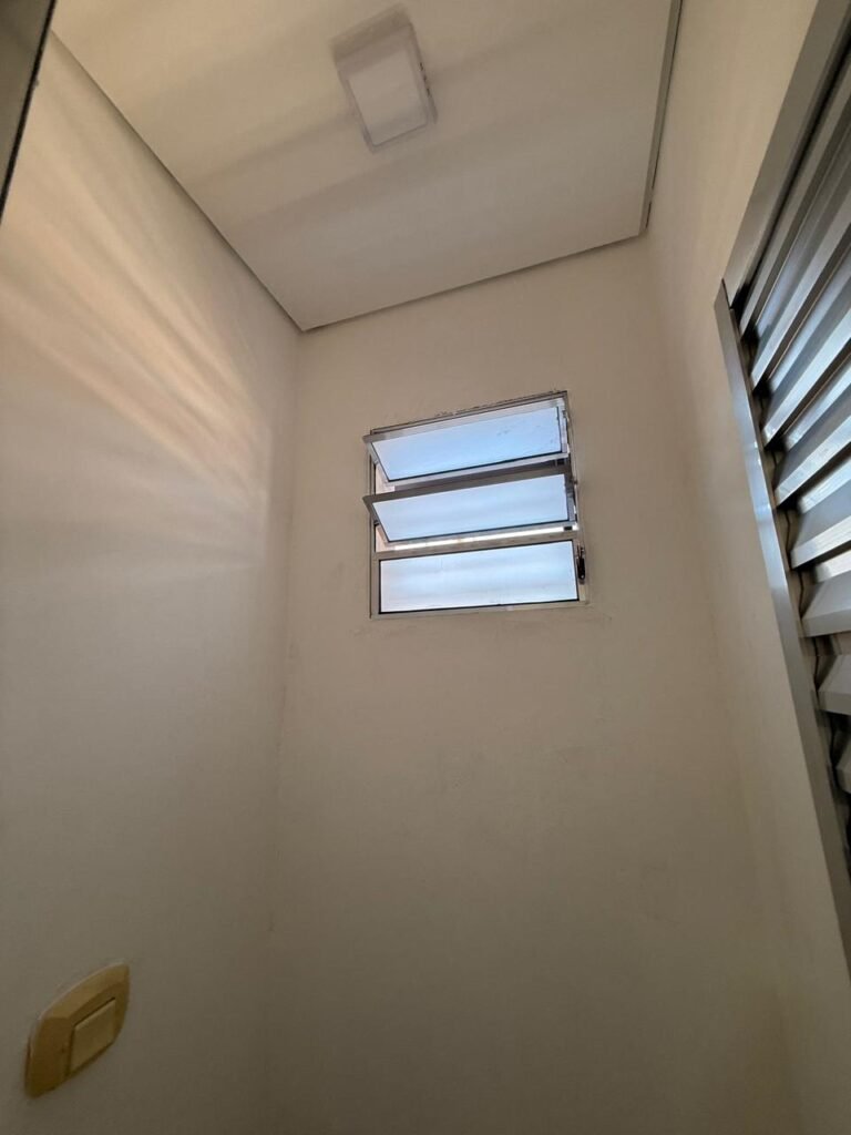 WC COPA-: 01 porta social de alumínio nova, porta está com dificuldade para fechar (emperrando), maçaneta e fechadura na cor preto com desgastes naturais, marca MM em ordem e com chave, piso e rodapé revestido de pisos de porcelanato novos em ordem, ralo de plástico cor branco marca Amanco em ordem, 01 espelho de energia com o 01 interruptor, 01 vaso sanitário de cerâmica cor branco marca Icasa, válvula de descarga de acionamento marca Docol em ordem, descarga em ordem, 01 canopla de registro em inox em ordem, 01 vitrô basculante com esquadria de inox e fechadura em ordem, 03 vidros foscos com marcas de tinta e restante em ordem, 01 espelho de energia cego, paredes e forro de gesso com tinta acrílica na cor branco fosco nova e em ordem, 01 luminária plafon de sobrepor com LED em ordem.