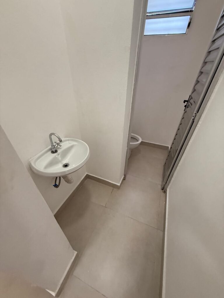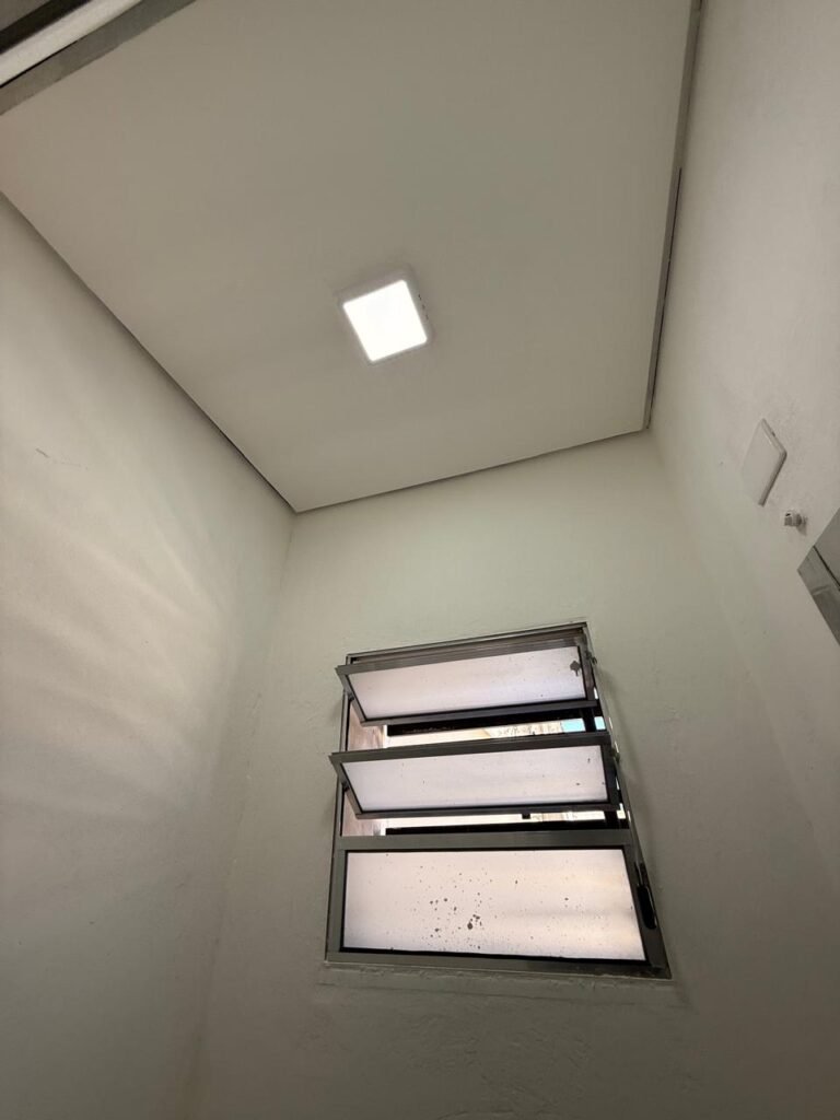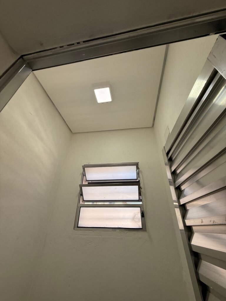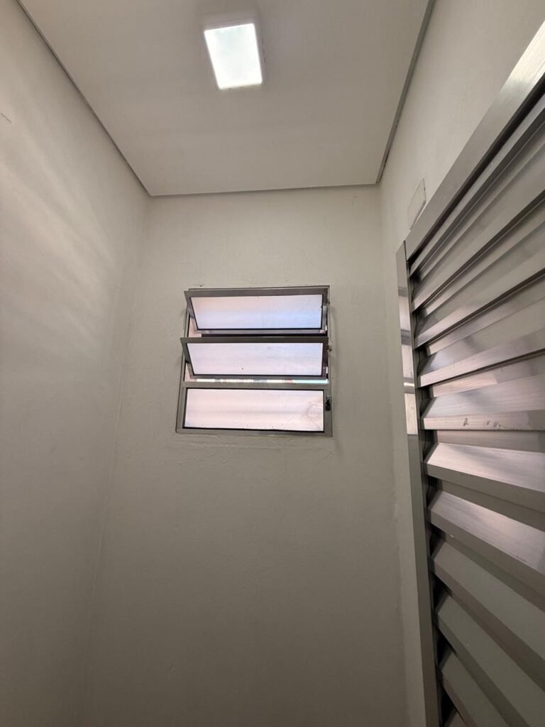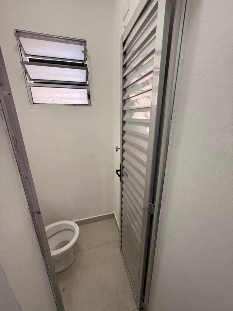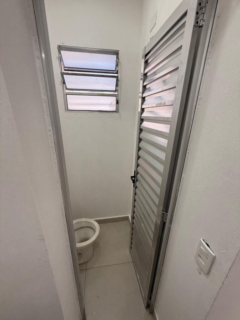 WC COPA-: 01 porta social de alumínio nova, porta está com dificuldade para fechar (emperrando), maçaneta e fechadura na cor preto com desgastes naturais, marca MM em ordem e com chave, piso e rodapé revestido de pisos de porcelanato novos em ordem, ralo de plástico cor branco marca Amanco em ordem, 01 espelho de energia com o 01 interruptor, 01 vaso sanitário de cerâmica cor branco marca Icasa, válvula de descarga de acionamento marca Docol em ordem, descarga em ordem, 01 canopla de registro em inox em ordem, 01 vitrô basculante com esquadria de inox e fechadura em ordem, 03 vidros foscos com marcas de tinta e restante em ordem, 01 espelho de energia cego, paredes e forro de gesso com tinta acrílica na cor branco fosco nova e em ordem, 01 luminária plafon de sobrepor com LED em ordem.
