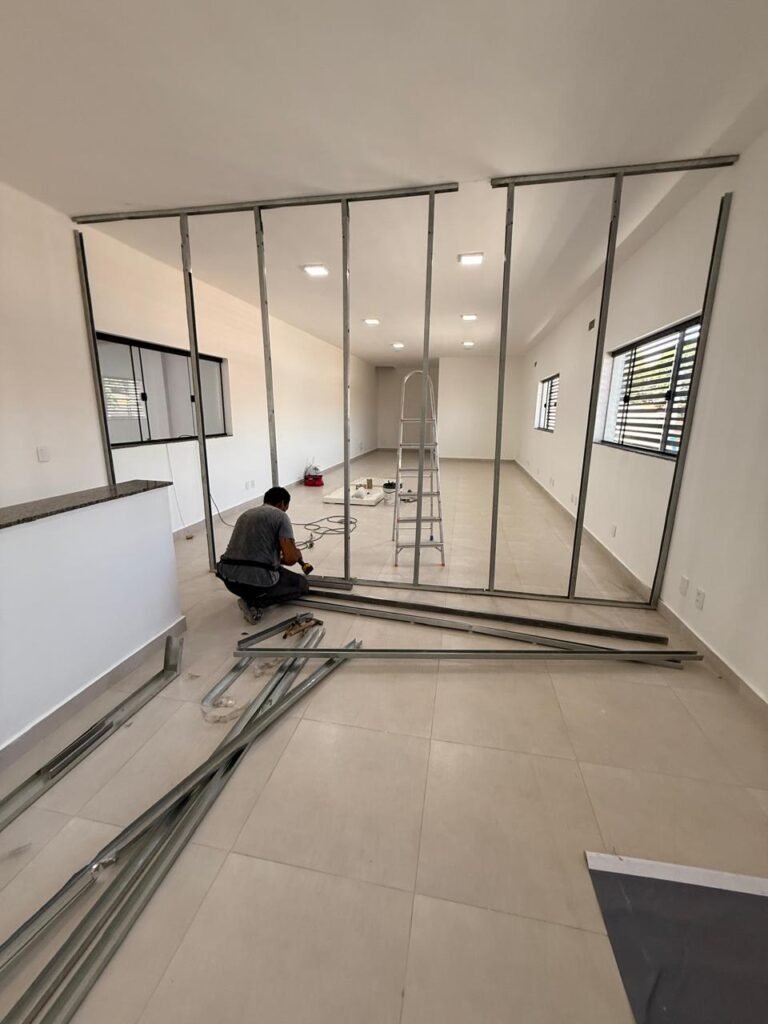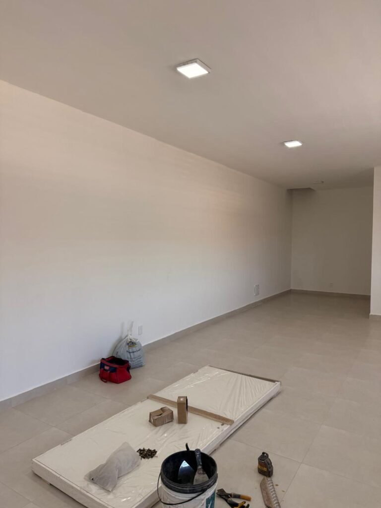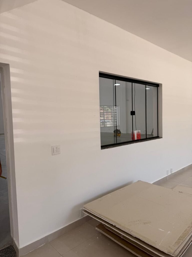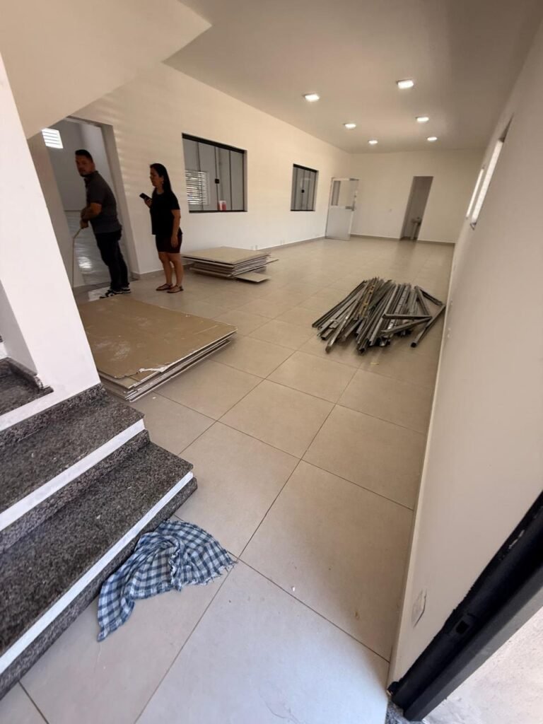 RECEPÇÃO-: 01 porta social de metalon nova, com pintura nova na cor preto em ordem ( marca Anjo ), maçanetas e fechaduras em inox marca Stam em ordem e com chaves, 03 soleiras de granito cinza ocre em ordem, piso e rodapé revestido de pisos de porcelanato novos e em ordem, paredes e teto com tinta acrílica na cor branco fosco nova e em ordem, 26 espelhos de energia em ordem, sendo eles: 02 espelhos com 03 interruptores, 01 espelho com 06 interruptores, 11 espelhos com 02 tomadas, 09 espelhos cegos, 03 pontos para instalação de ar condicionado, 03 tampas de inspeções de plástico na cor branco em ordem, 04 janelas deslizantes contendo 01 soleira de granito cinza ocre em cada, 04 folhas de vidro liso temperado transparente e 01 fechadura em cada, 02 portas sociais com esquadrias de alumínio em ordem, com 01 folha de vidro liso temperado transparente em ordem (01 delas com Insulfilm), maçaneta ( 01 porta com maçaneta soltando ) fechadura em inox marca Pado, 01 conjunto lavatório de cerâmica na cor branco, encardido com sujeira, torneira em inox marca Águia com desgastes naturais e restante em ordem, fizeram uma torneira de jardim de inox em ordem.