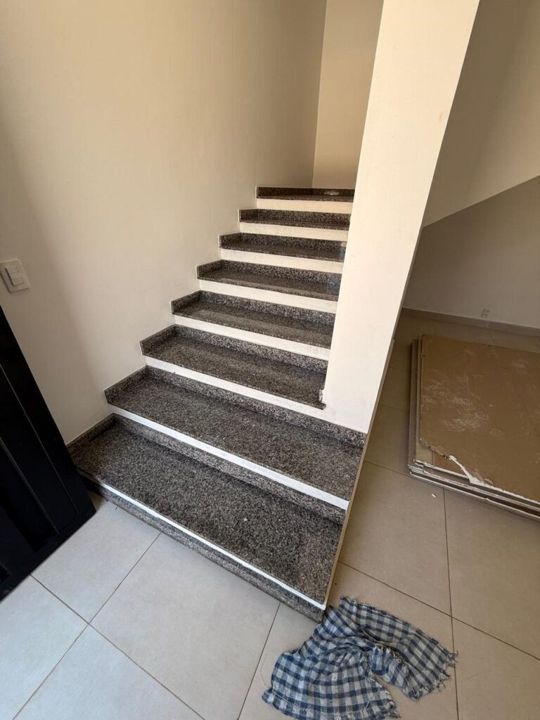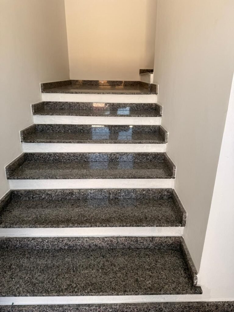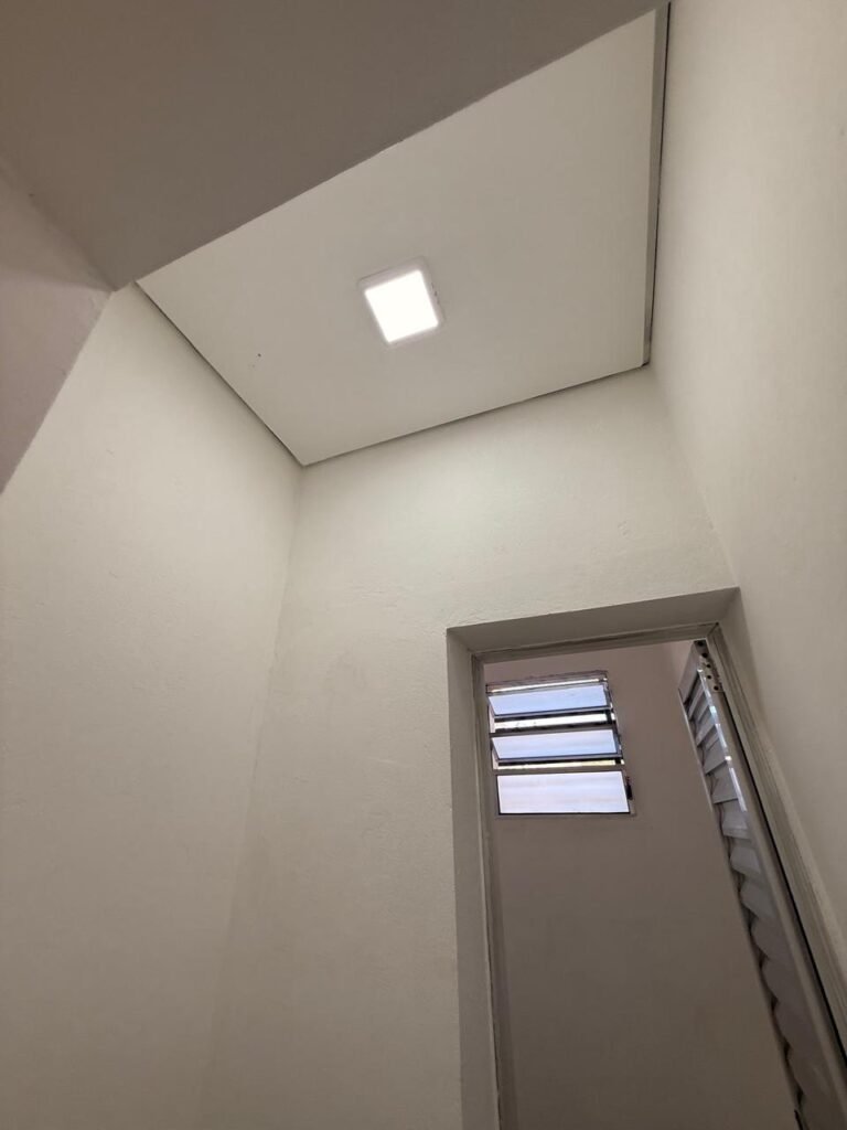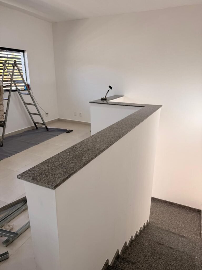 ESCRITÓRIO -: Escada de acesso revestida com peças de granito na cor cinza ocre, peças novas e em ordem, 12 luminárias plafon de sobrepor com LED em ordem, pisos e rodapé revestido de pisos de porcelanato novos e em ordem, 28 espelhos de energia sendo eles: 02 espelhos com 01 interruptor e 01 tomada, 01 espelho com 03 interruptores, 01 espelho com 01 interruptor, 13 espelhos com 02 tomadas, 13 espelhos cegos, 03 pontos para ar condicionado, 04 janelas deslizantes, contendo 01 soleira de granito cinza ocre em cada, 04 folhas de vidro liso temperado e 01 fechadura em ordem, 01 portão de alumínio de acesso para alçapão, 01 peças de granito cinza ocre e balcão nova e em ordem, 01 tampa de inspeção de plástico cor branco em ordem, 02 cubas de cerâmica na cor branco, marca Deca em ordem, com torneira em inox em ordem e sifão em ordem em ambas, 01 torneira de jardim em inox em ordem, paredes e teto (parte dos tetos no banheiro com dry wall) com tinta acrílica na cor branco fosco nova e em ordem.