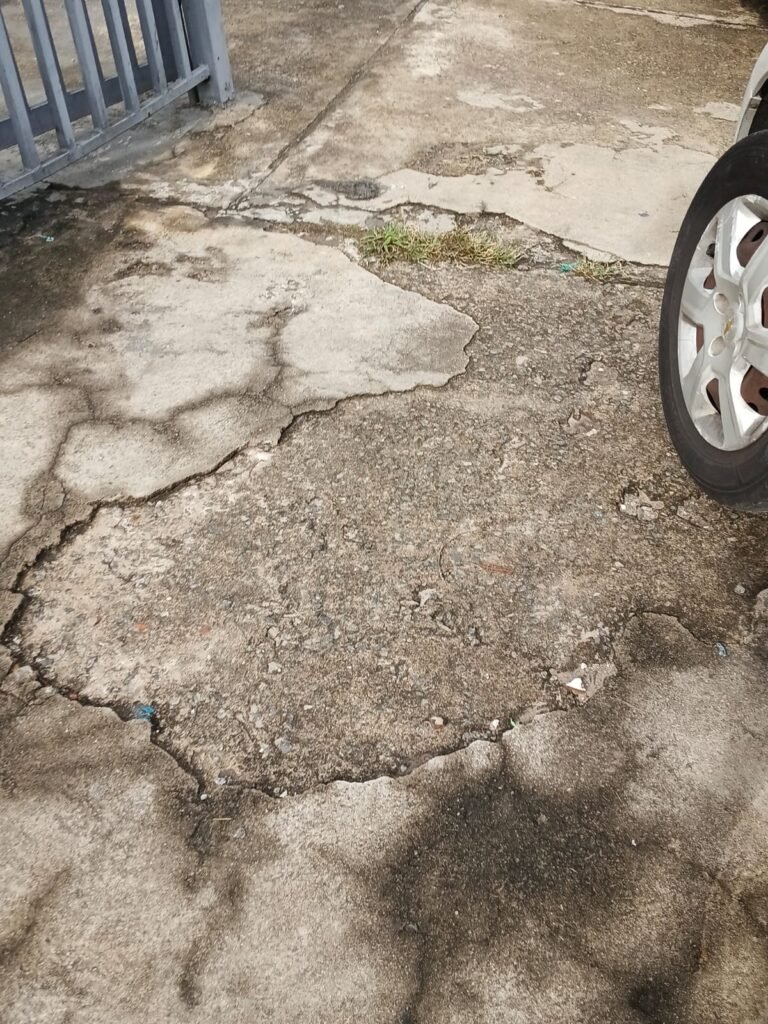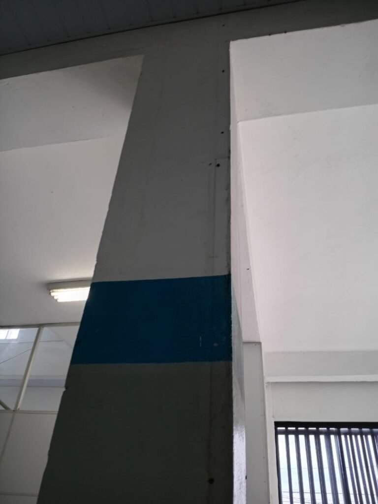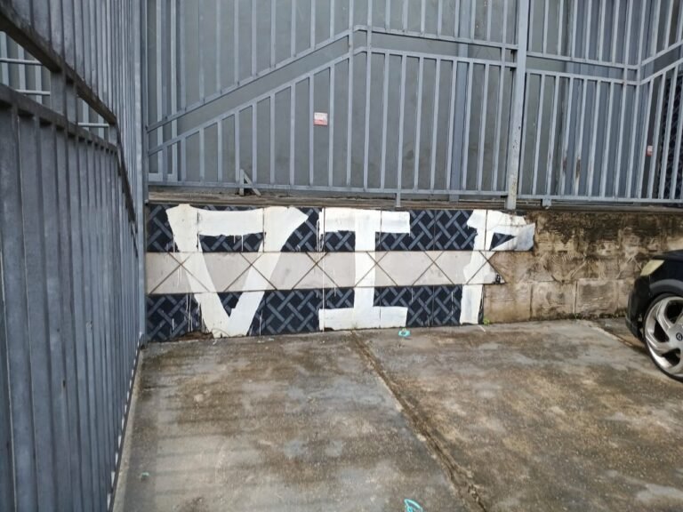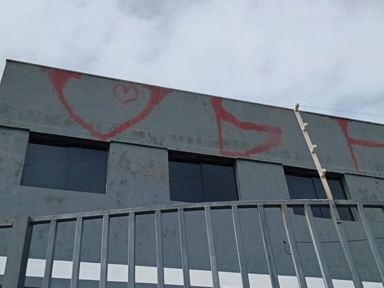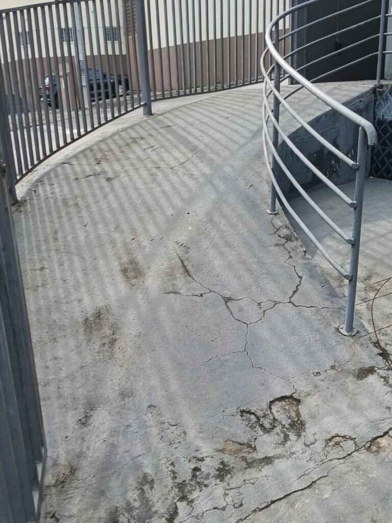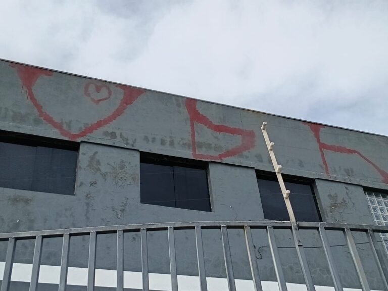 FACHADA:- Calçada em concreto com algumas trincas, partes quebradas e restante em ordem, grades de ferro com pintura na cor cinza desgastada e com algumas marcas de ferrugem, 01 portão social em ordem e com fechaduras e chaves em ordem, com pintura na cor cinza desgastada e com ferrugem, 01 da paredes revestida ate a metade com azulejos na cor azul e branco quebrados, trincados, sujos, pixados e restante da parede sem revestimento, parede lateral revestida de azulejos azuis e brancos, quebrados, trincados, faltando peças, sujos e pixados, rampa de concreto usinado com pintura na cor cinza desgastada, com rachaduras e trincados, 01 corrimão com pintura desgastada porem em ordem, 01 caixa de correspondência na cor cinza clara desgastada pelo tempo, cerca elétrica não testada, 01 placa de ferro com os números “3267” em ordem, paredes com pintura na cor cinza desgastada, com rachaduras e pichação na cor vermelha, 01 portão usado como doca em ordem e com fechadura e chaves em ordem.