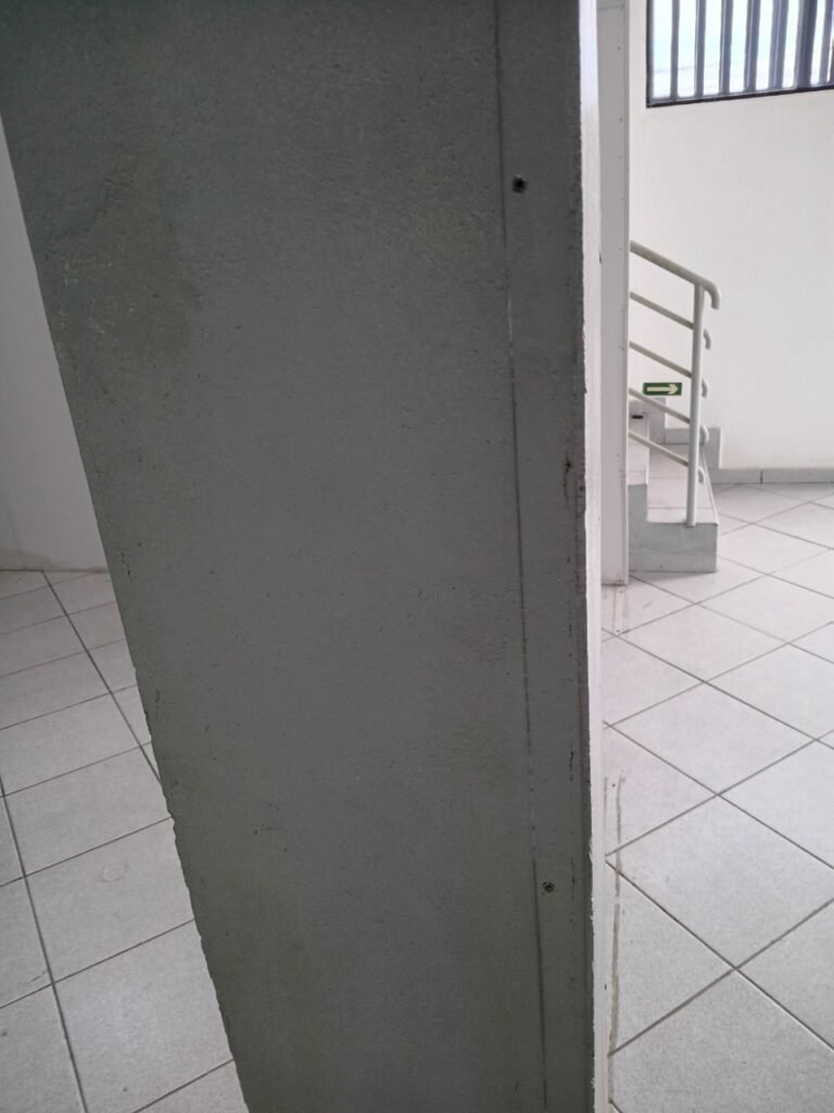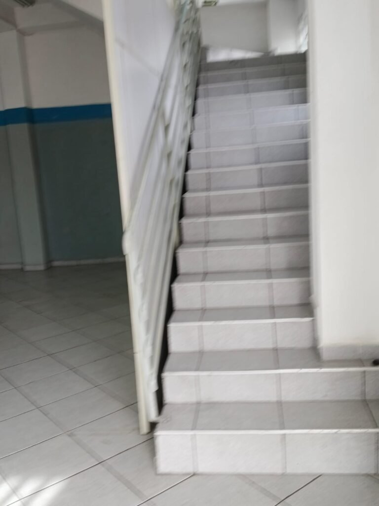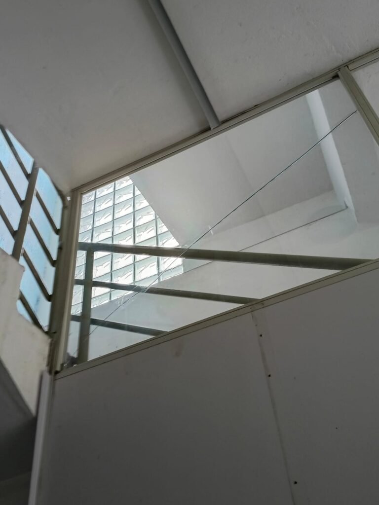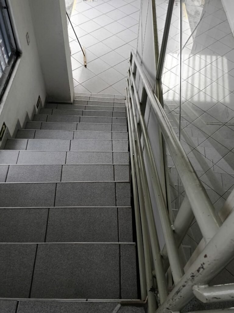 ESCADA:- Escada com revestimento de pisos frios cerâmicos com 02 pisos quebrados e restante em ordem, corrimão com pintura na cor cinza em ordem, forro de PVC na cor cinza com 01 das partes soltando e restante em ordem. 01 divisória com 03 vidros sendo que 01 deles está trincado, 55 tijolos de vidro em ordem, 01 interruptor não testado, 01 janela com grades em ordem, 01 extintor ABC, iluminação em ordem