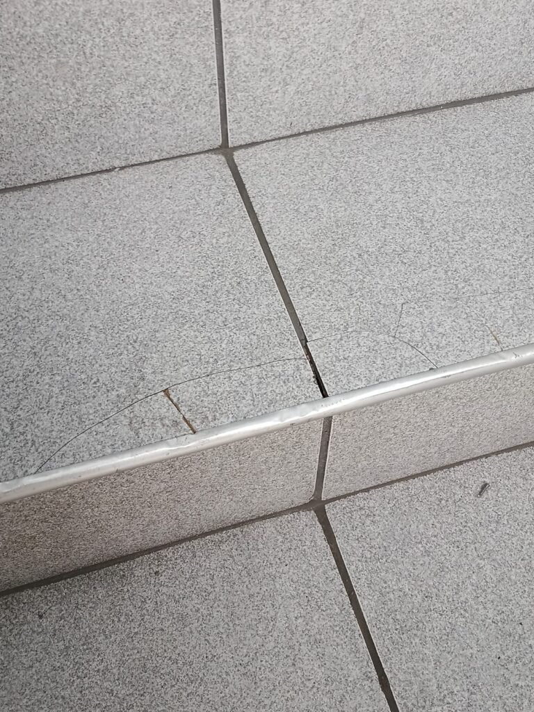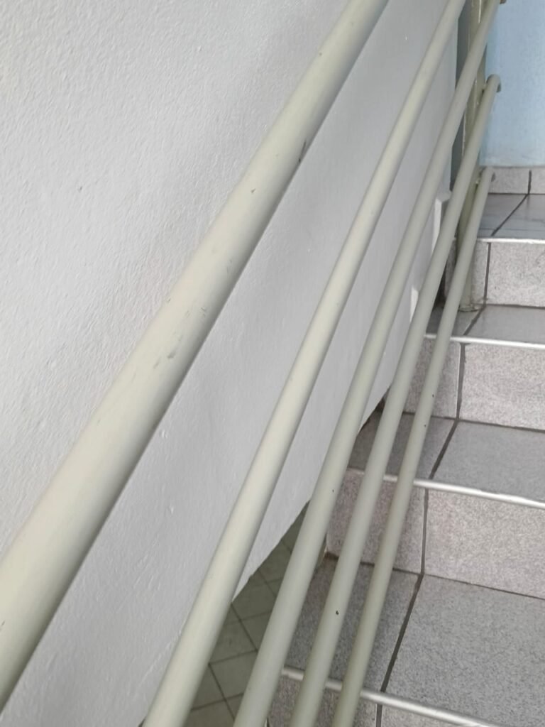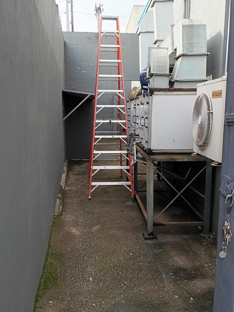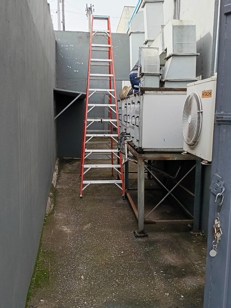 ESCADA:- Escada com revestimento de pisos frios cerâmicos com 02 pisos quebrados e restante em ordem, corrimão com pintura na cor cinza em ordem, forro de PVC na cor cinza com 01 das partes soltando e restante em ordem. 01 divisória com 03 vidros sendo que 01 deles está trincado, 55 tijolos de vidro em ordem, 01 interruptor não testado, 01 janela com grades em ordem, 01 extintor ABC, iluminação em ordem