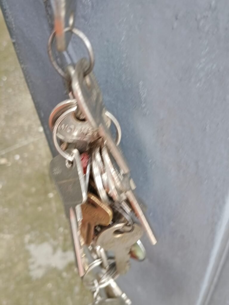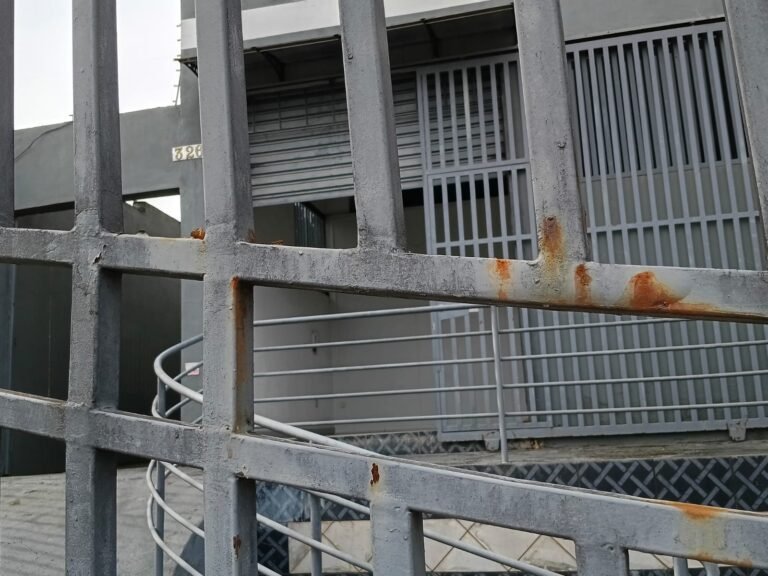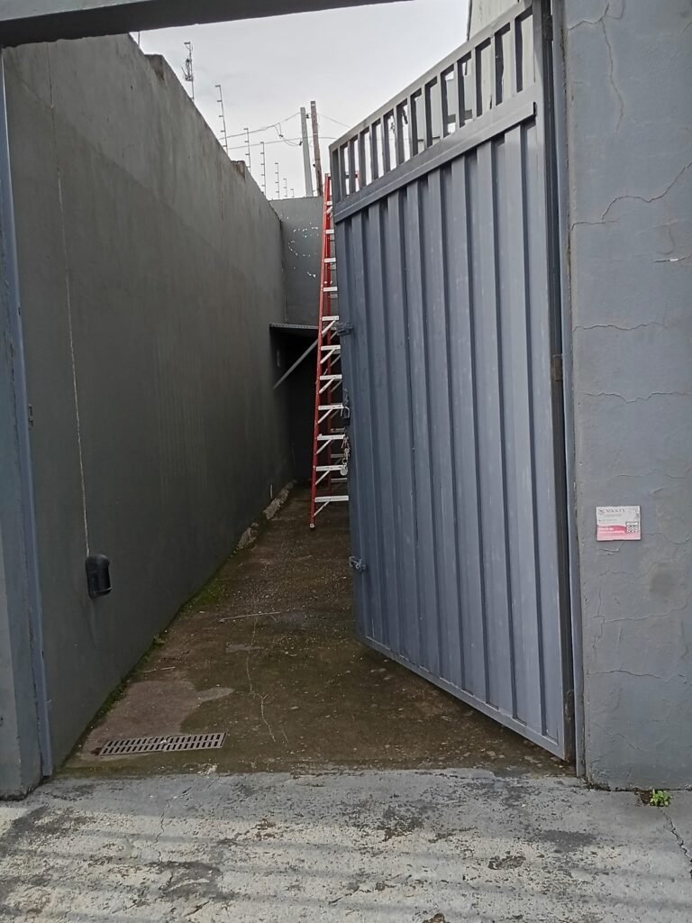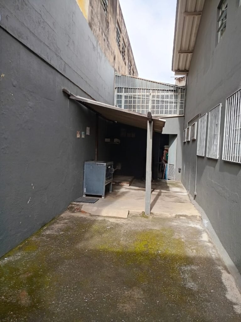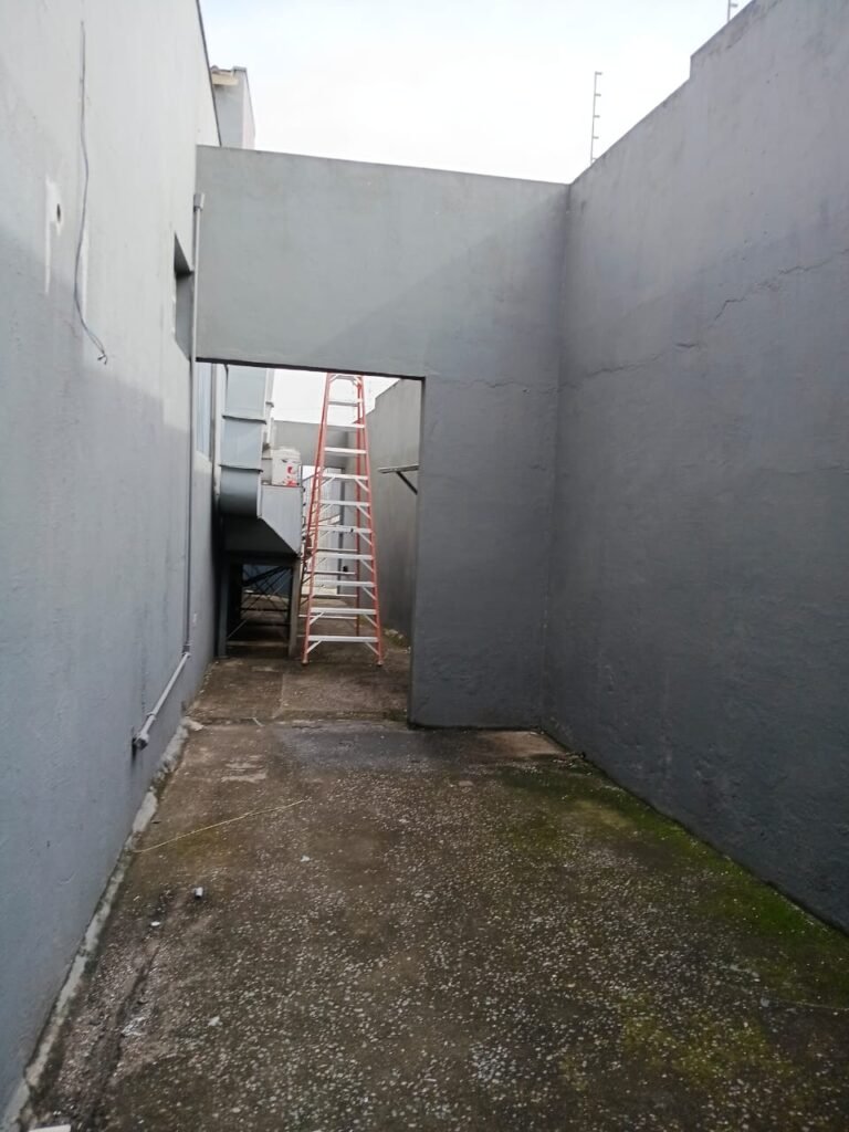 FUNDOS:- 01 Portão de ferro com pintura a cor cinza em ordem, com cadeados em ordem e com chaves, paredes com pintura a cor cinza com desgastes naturais restante m ordem, chão com concreto usinado cm desgastes naturais porem em ordem.